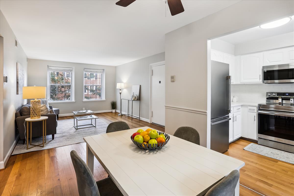 Beautiful 2 bedroom, 1 bathroom Richmond model home nestled in Fairlington Villages! This lovely home features gleaming hardwood floors & fresh gray paint throughout. Upon entry into the spacious living room, you will find a deep coat closet with built-in shelving. The kitchen is accented with white cabinetry with modern pulls, new countertops, a white subway tile backsplash, NEW stainless steel appliances (2022), & a modern light fixture. The separate dining area with a ceiling fan is spacious enough to fit a full-size dining table and provides access to the private, covered rear balcony that overlooks a peaceful walking trail & lush green space. The back hallway features a laundry closet with full-sized stackable washer & dryer. The spacious primary bedroom is large enough to fit a king bedroom set & includes windows on two walls + a large closet. The recently updated bathroom (2020) is accented with tile flooring, recessed lighting, a white vanity with a backlit mirror, & a white subway tiled shower. A second bedroom with a nice-sized closet completes this lovely home. Other home features include a NEW HVAC (2021), newer water heater (2020), & a RARE separate storage unit/bonus room in the basement which provides an EXTRA ~155 sq ft of space! Fairlington Villages amenities include six pools, lighted tennis courts, tot lots/playgrounds, walking paths, & MORE! Great location near I-395 & the shops and restaurants of Shirlington Village, West Alex, Baileys Crossroads, Del Ray, & Old Town Alexandria.
