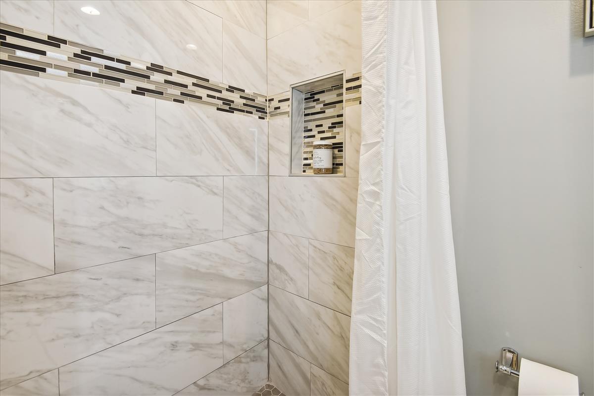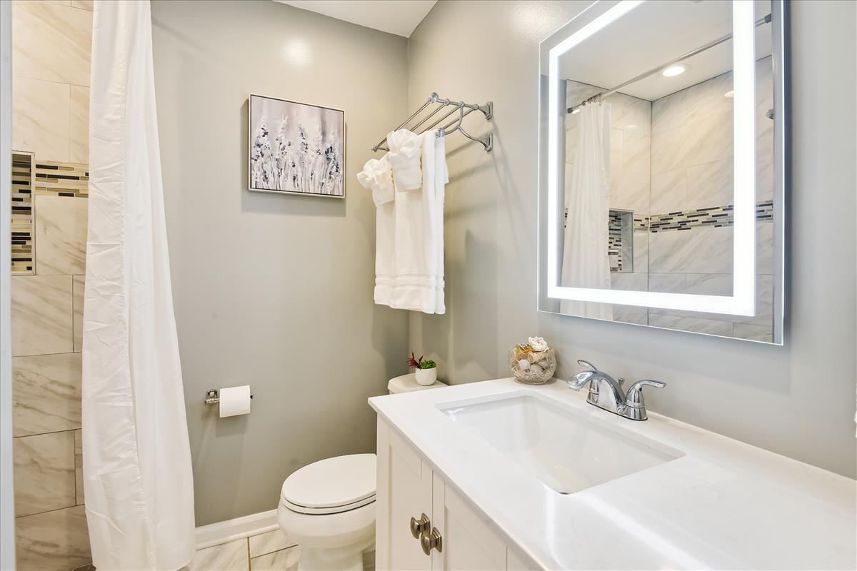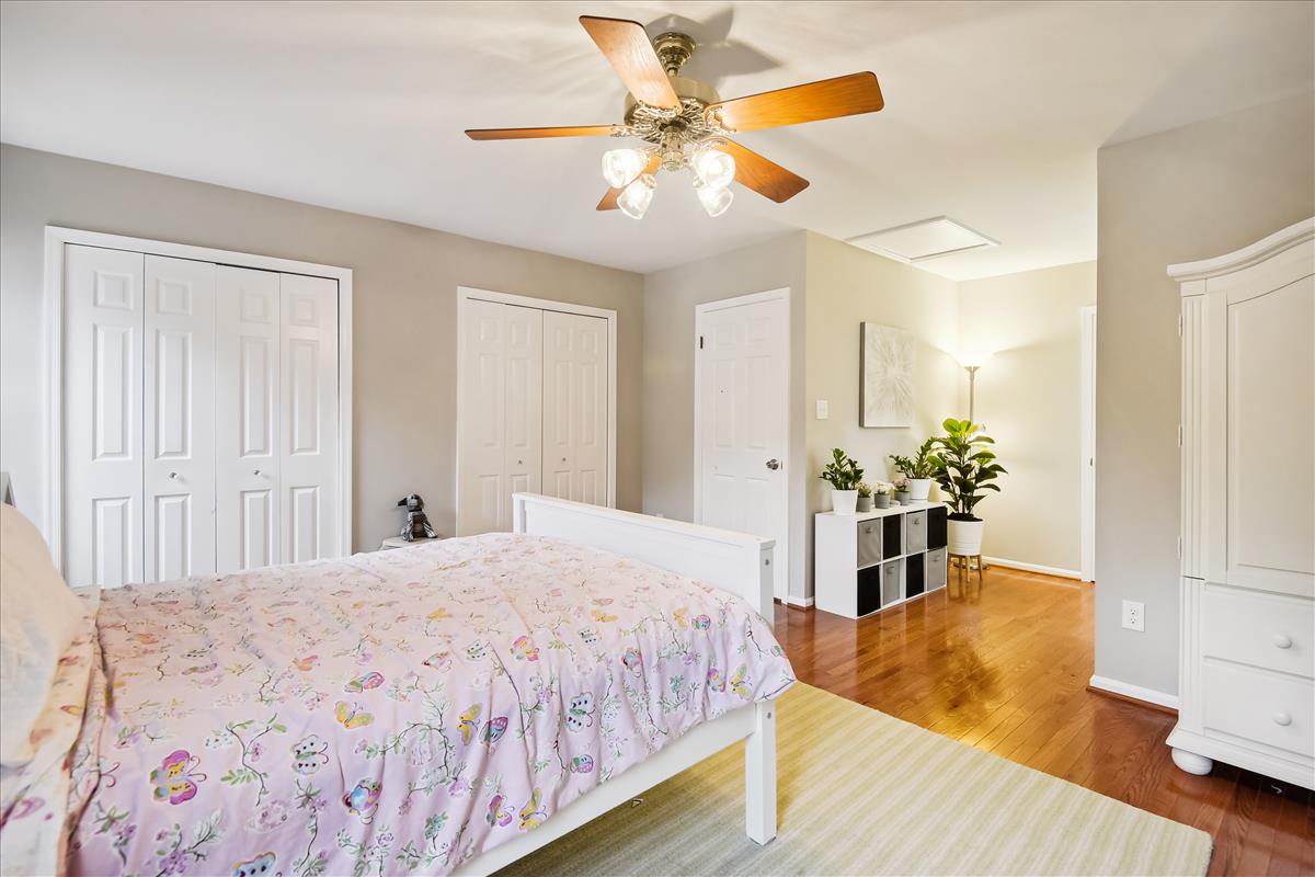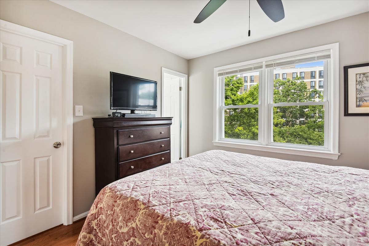 On the 3rd level, the spacious primary bedroom features wall-to-wall closets, hardwood flooring, a separate sitting area, and a linen closet. An additional bedroom, with hardwood flooring and 2 closets completes this level. Both rooms have ensuite access to their own full bathrooms with modern stone-topped vanity, tile flooring, and an upgraded tile shower with niche shelving.
