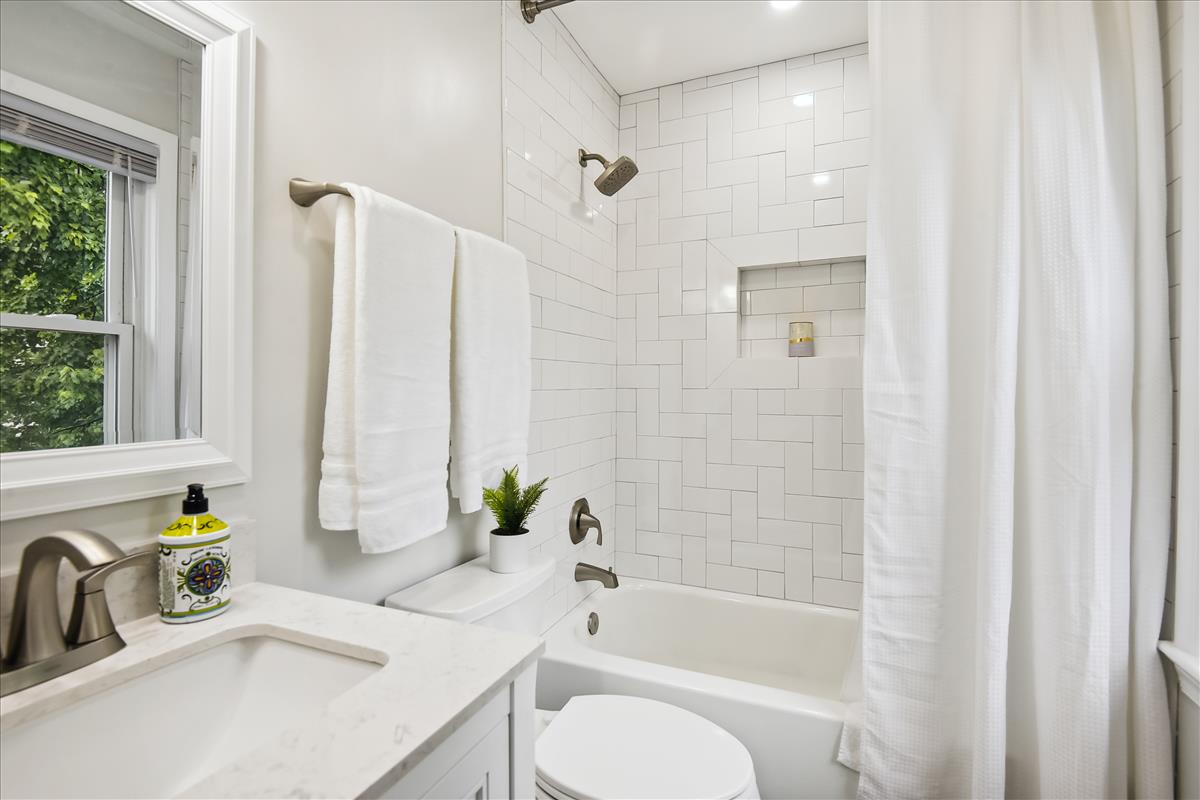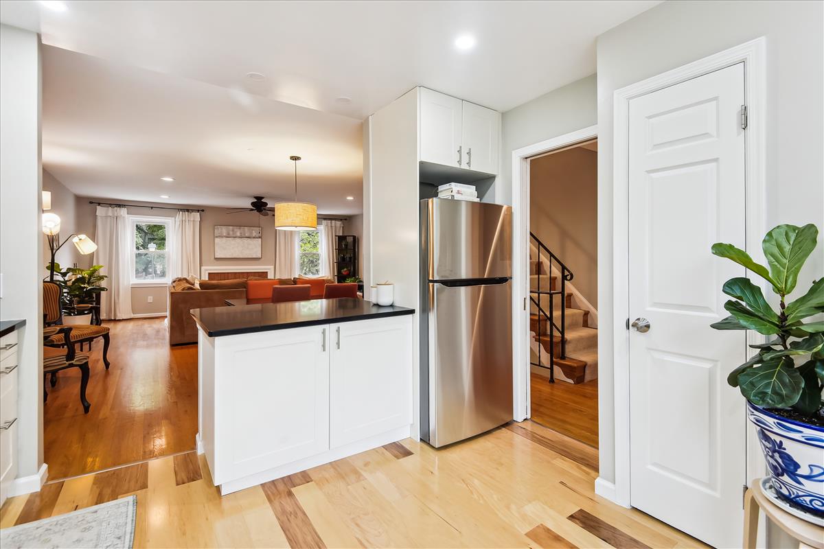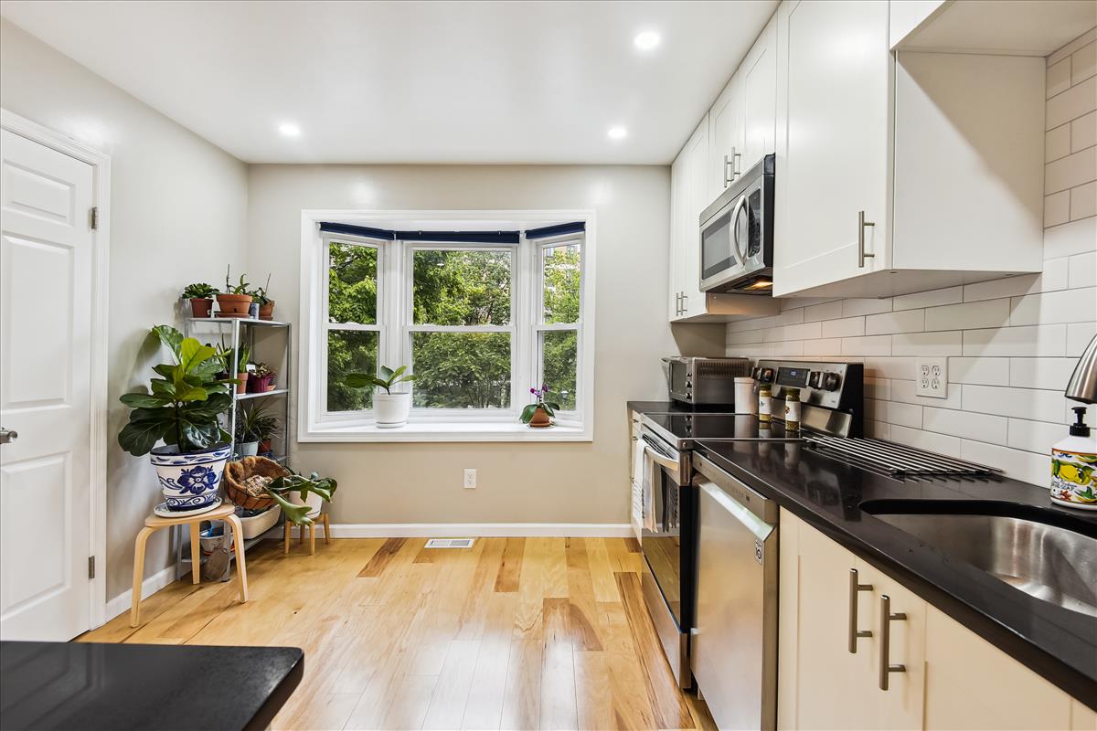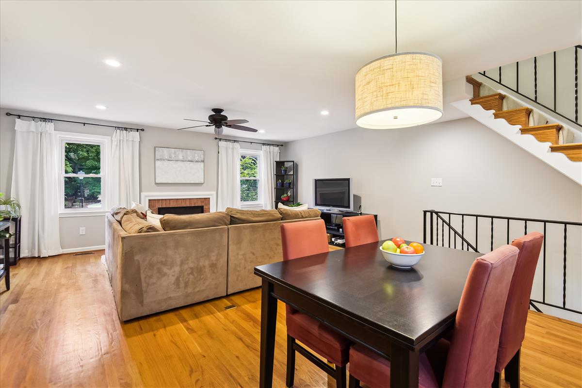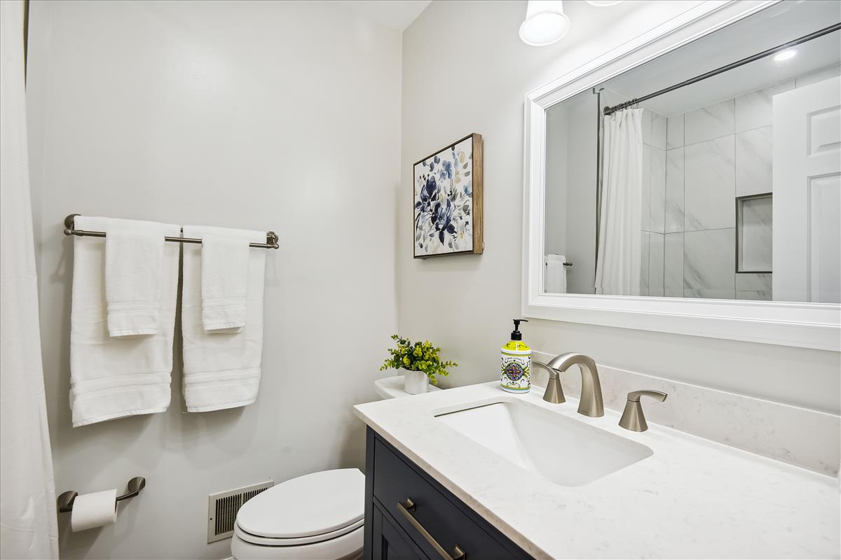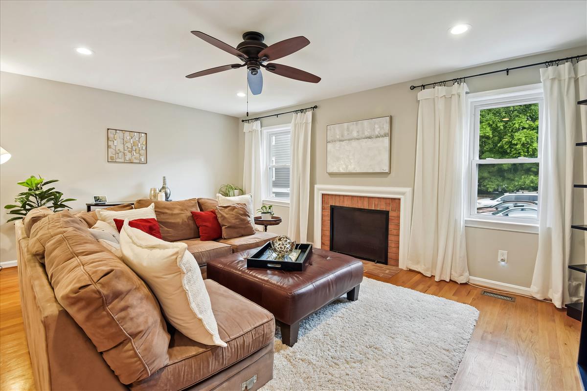 The light-filled main level features a dining area that overlooks the spacious living room with a wood-burning fireplace, ceiling fan, & gleaming hardwood floors. The kitchen is accented with upgraded soft-close cabinets, quartz countertops, NEW stainless steel appliances (2021), engineered hardwood flooring, a large pantry, & a large bay window that provides lots of natural light. A powder room with upgraded flooring & a modern white vanity completes this level.