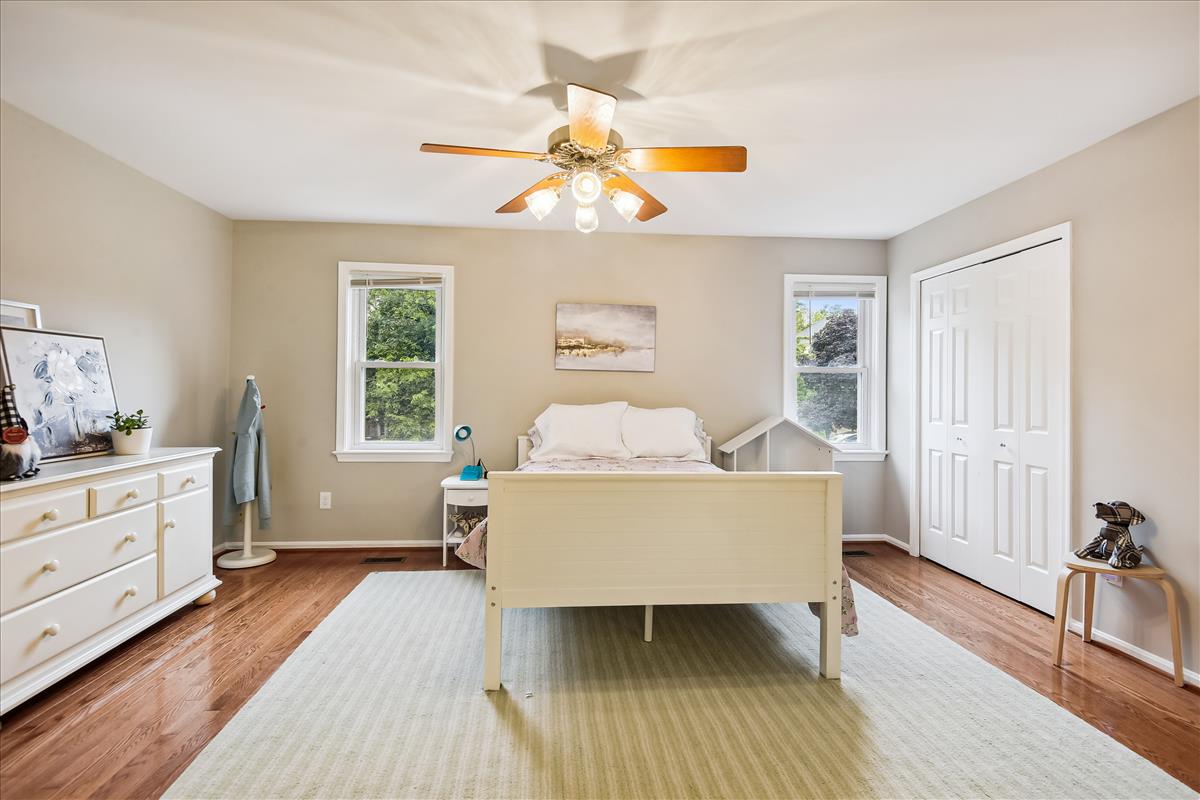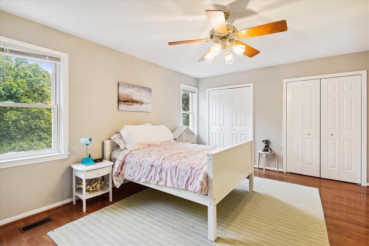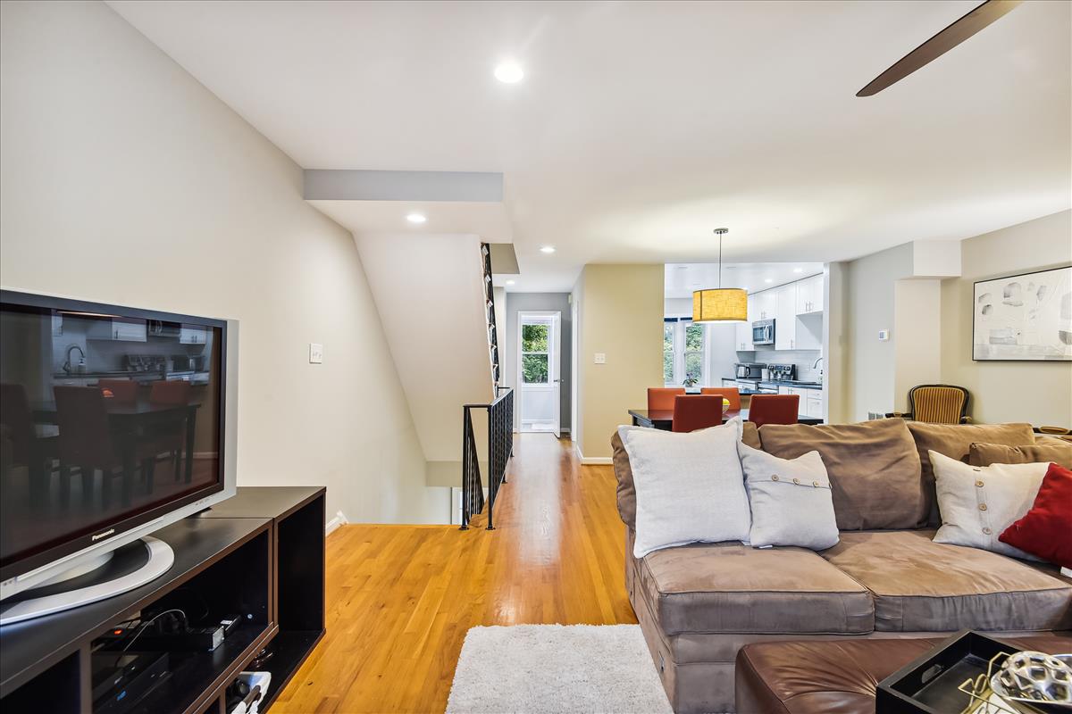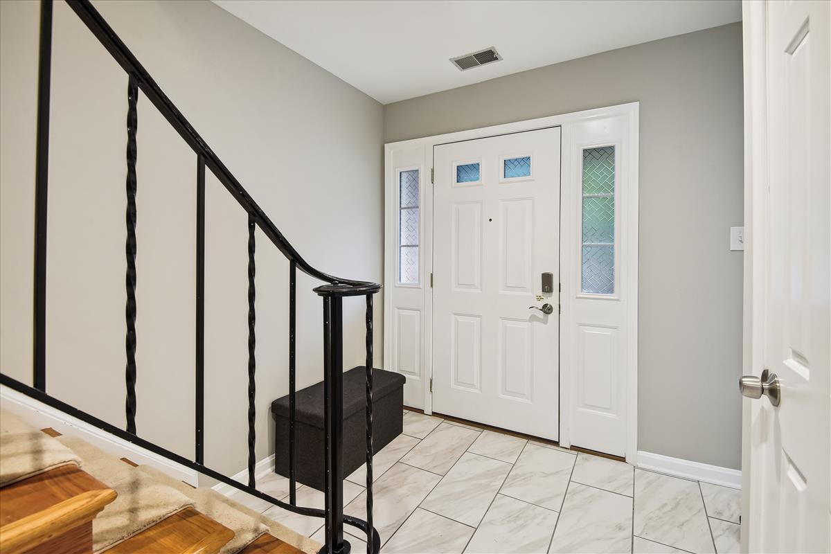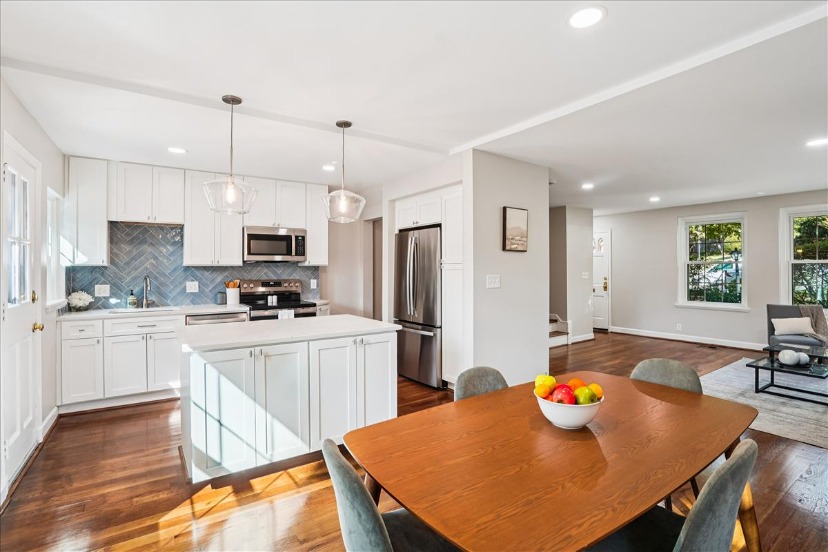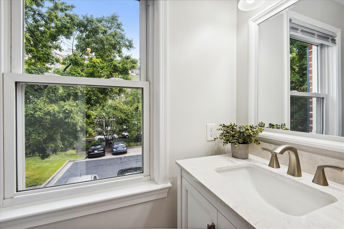 The light-filled main level features a dining area that overlooks the spacious living room with a wood-burning fireplace, ceiling fan, & gleaming hardwood floors. The kitchen is accented with upgraded soft-close cabinets, quartz countertops, NEW stainless steel appliances (2021), engineered hardwood flooring, a large pantry, & a large bay window that provides lots of natural light. A powder room with upgraded flooring & a modern white vanity completes this level.
