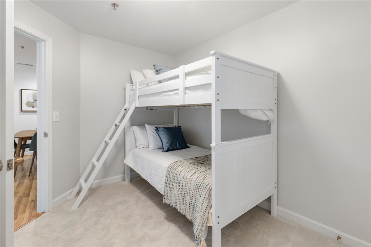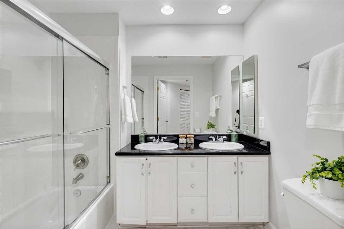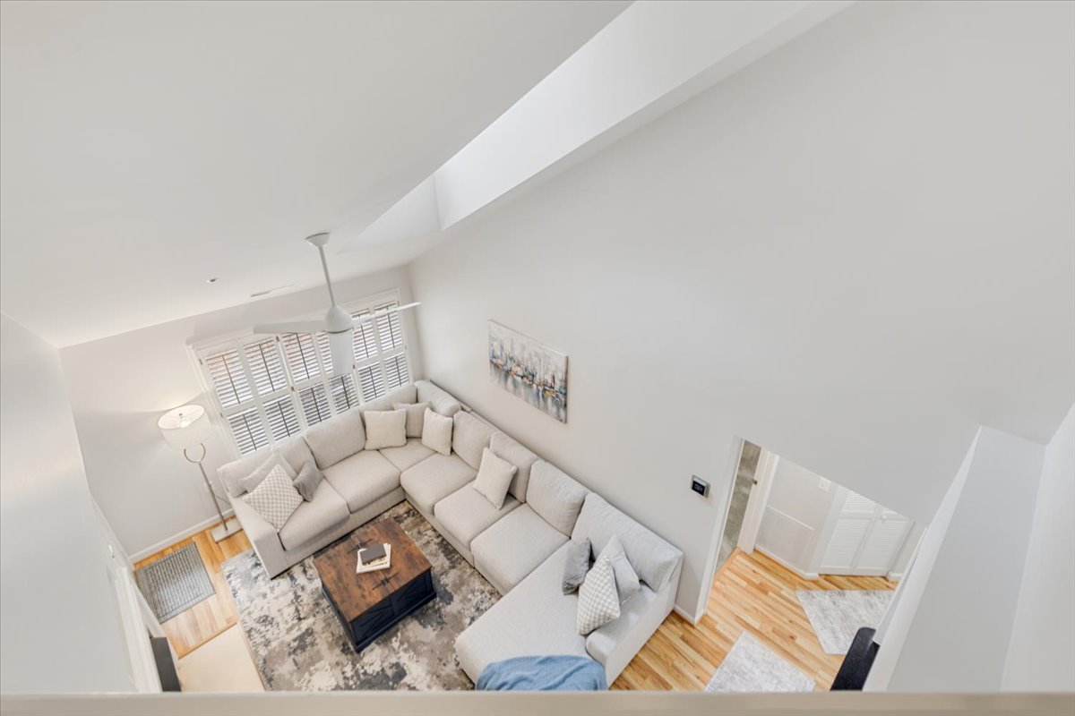 The spacious living room features soaring vaulted ceilings with a skylight that flood the space with natural light, plus a ceiling fan, gas fireplace, & a built-in alcove perfect for your TV setup. Step out onto the private covered balcony – an ideal spot to enjoy morning coffee or unwind at the end of the day. The main level offers two carpeted bedrooms – one with soaring ceilings, a chandelier, & a walk-in closet, and the other featuring a charming light fixture & a serene view overlooking the balcony. The full bathroom on this level is accented with recessed lighting, a dual stone-topped vanity, tile flooring, & a sparkling white tiled shower with a sliding glass door & tub.