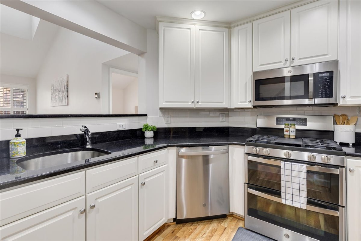Gorgeous & RARE 3-bedroom, 2-bathroom 2-level condo located in the Courthouse Hill Condominium! This beautifully updated home welcomes you with a bright, open layout & wooden shutters throughout. Upon entry, the kitchen sits to your right, offering white cabinetry, stone countertops, a classic white subway tile backsplash, stainless steel appliances including a new dishwasher (2025), & hardwood flooring. To the left, the separate dining area provides plenty of room to entertain and includes convenient under-stair storage. A pantry closet in the back hallway adds even more functionality.