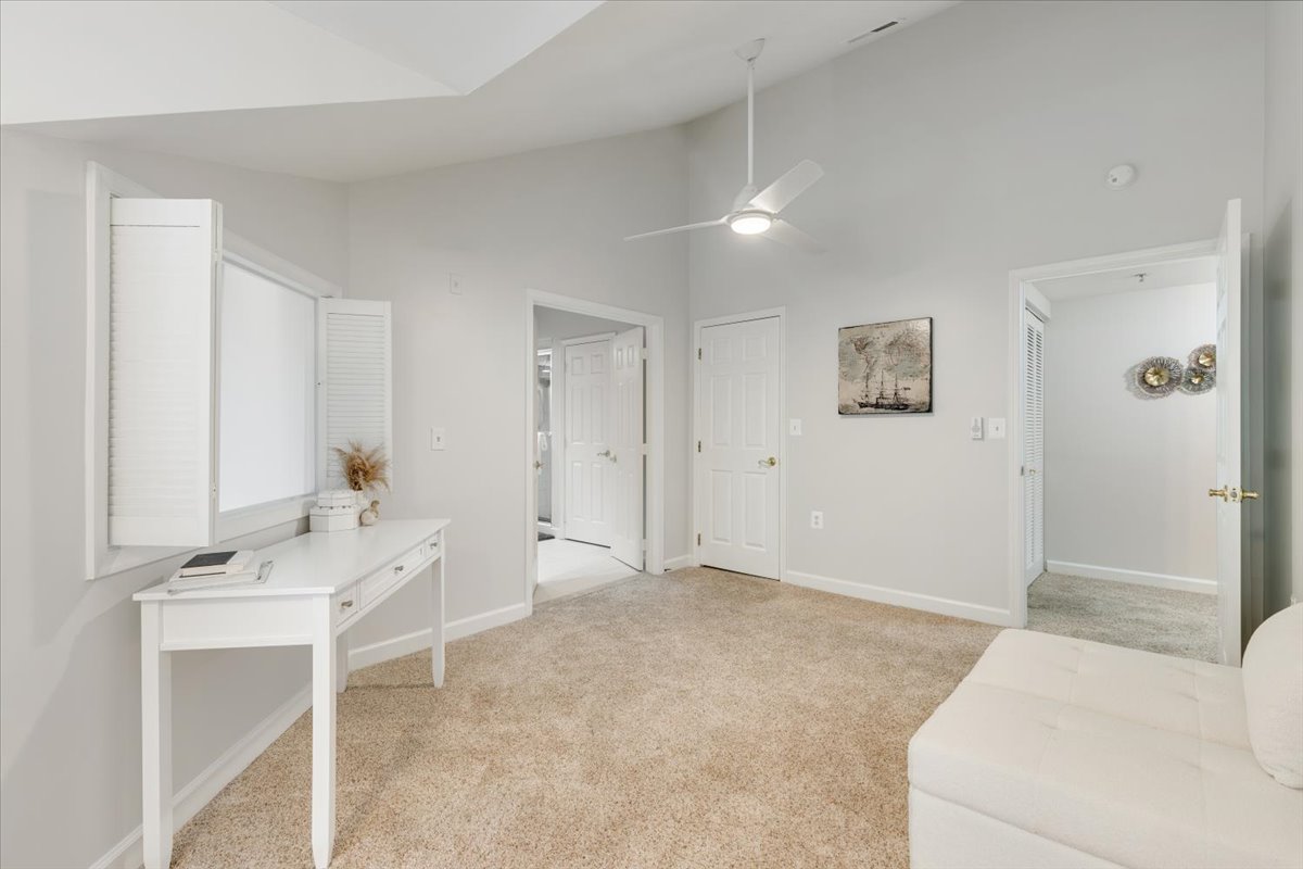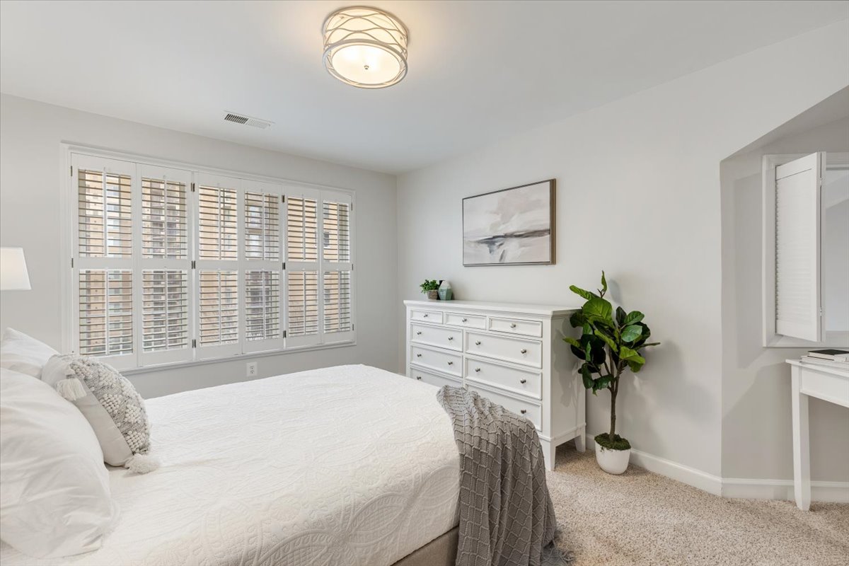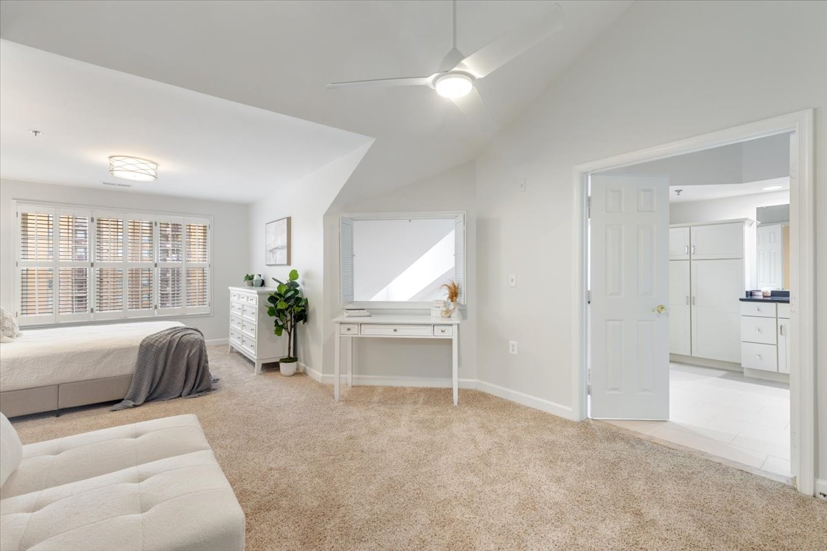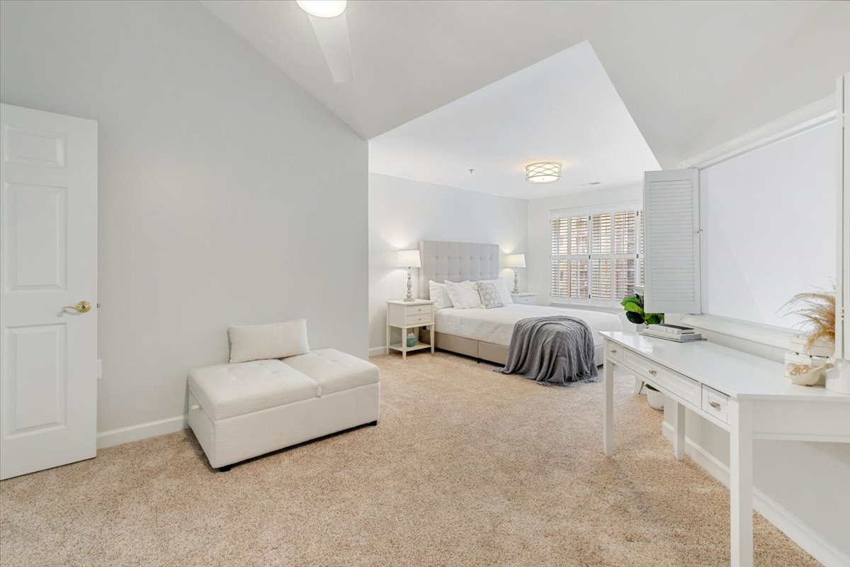 Head upstairs to find plush carpeting throughout the upper level & a modern chandelier illuminating the stairway. A laundry closet with a stacked washer & dryer provides everyday convenience. The upper level is home to the HUGE primary bedroom suite, complete with overhead lighting, a massive walk-in closet, a sitting area with a ceiling fan with light, & a window that opens to overlook to the main level below. The en-suite bathroom includes oversized tile flooring, two separate stone-topped vanities, a white subway-tiled walk-in shower, & abundant built-in cabinetry for endless storage!