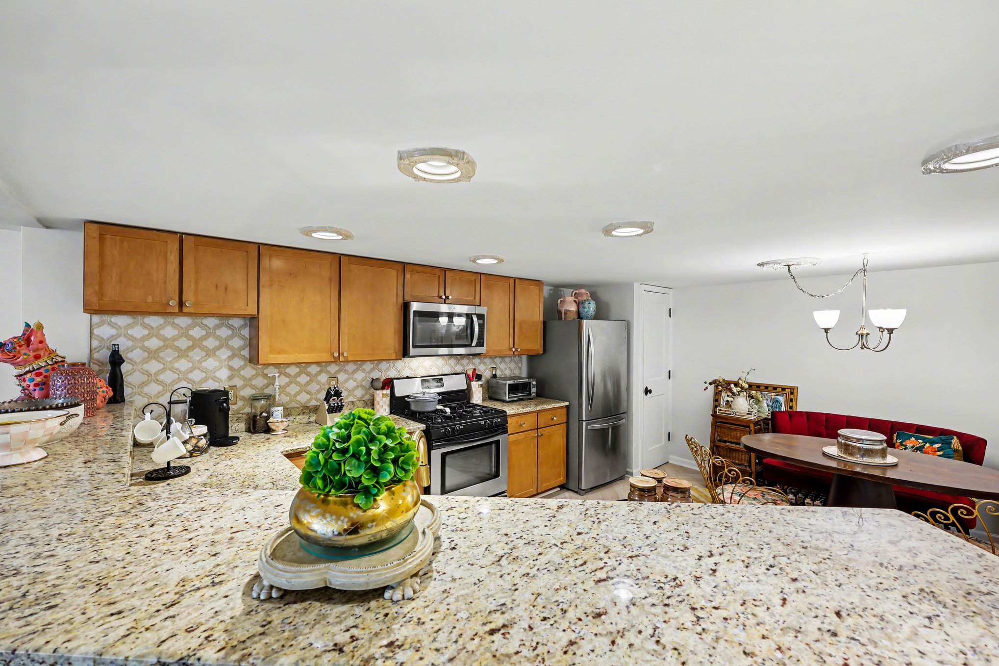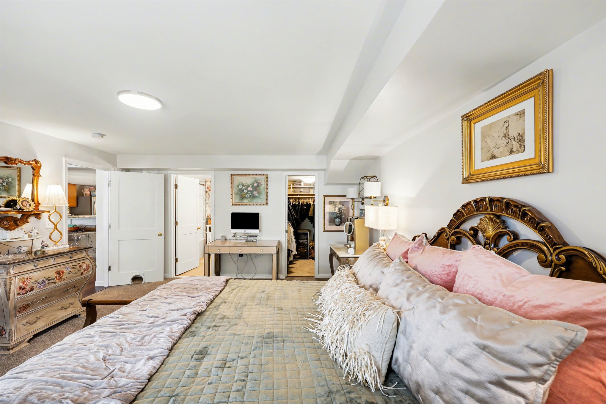 A separate laundry room offers a full-sized washer & dryer with custom Elfa shelving above, plus an additional storage closet. The massive bedroom easily fits a king bed set, features fresh paint, plush carpeting, overhead lighting, & a large window overlooking the serene garden. Storage is abundant with a large walk-in closet complete with a custom birch build-out & an additional linen closet. The en-suite bathroom blends charm & designer flair with pink tile flooring, an updated vanity, new brass & dark bronze mirror & light fixture, board & batten wainscoting, & stunning House of Hackney wallpaper. The custom marble-tiled shower includes Delta fixtures, niche shelving, & an ultra-deep soaking tub.Enjoy easy parking right out front and access to fantastic community amenities, including a large pool and fitness center, all supported by incredibly responsive management. Ideally located just minutes from Old Town Alexandria, Arlington, & DC, with Metrobus accessibility for easy commuting!
