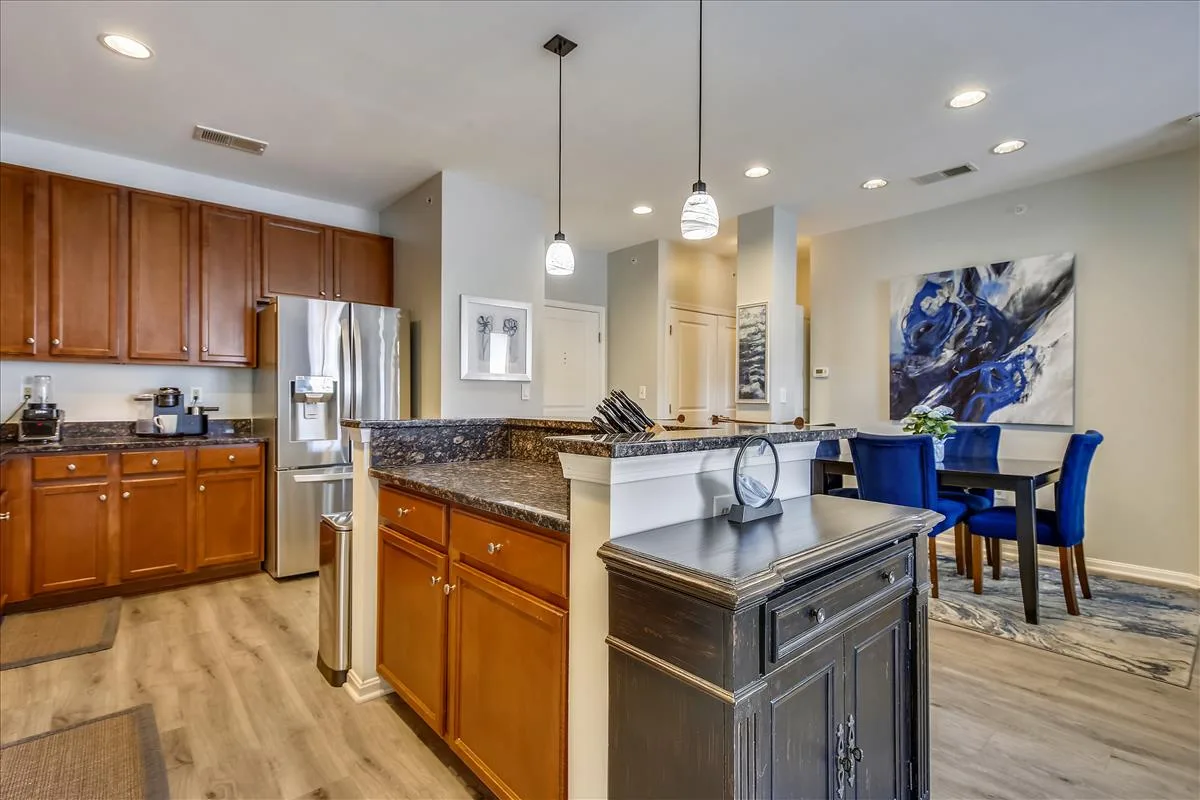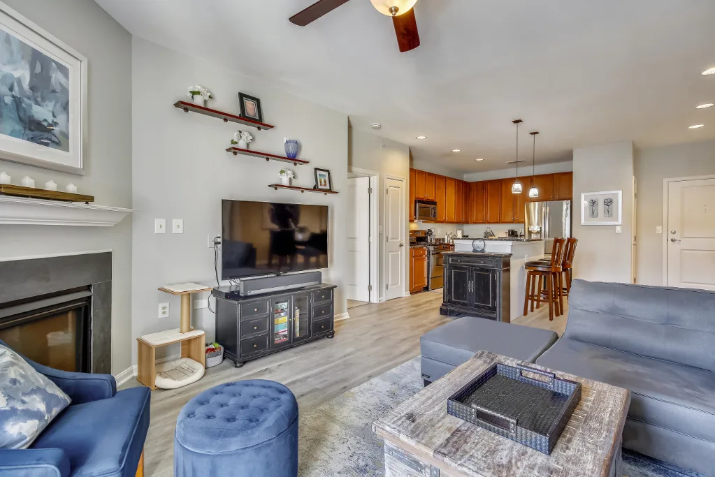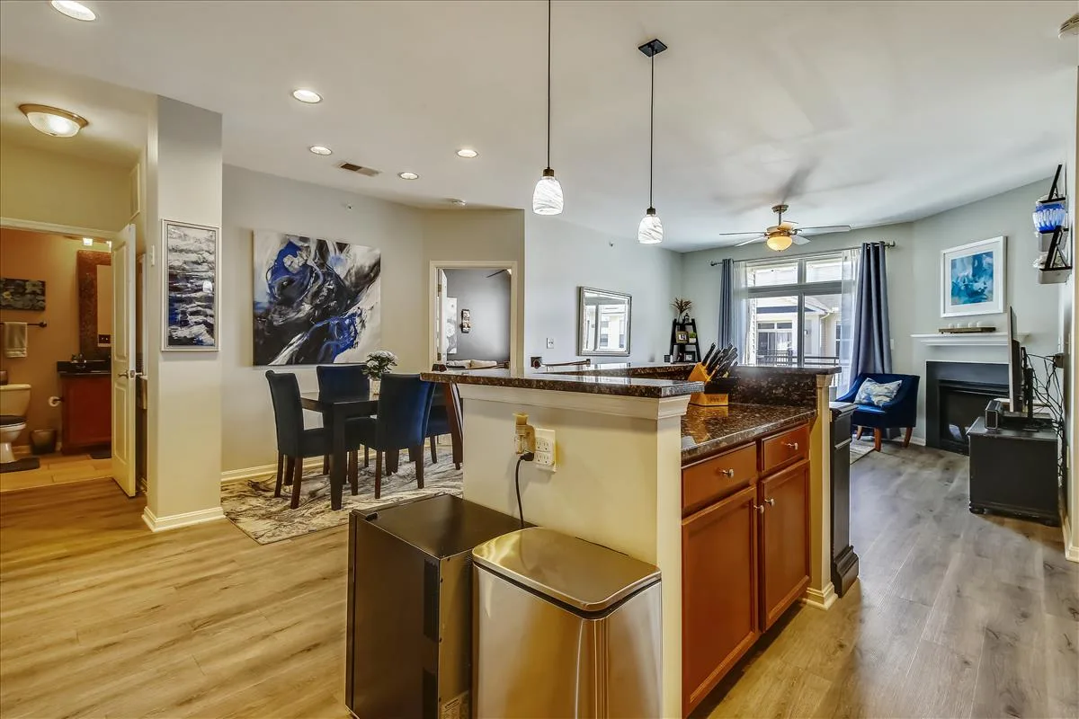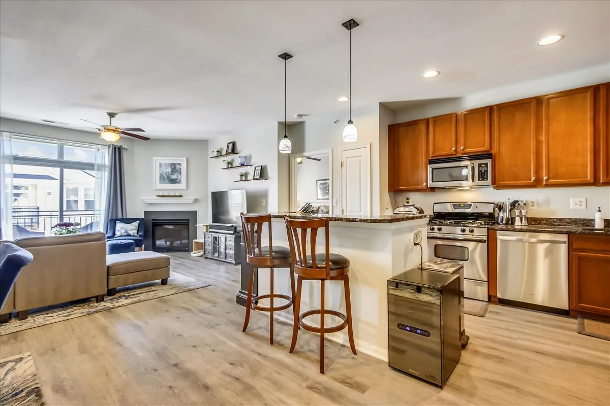 Beautiful 2 bedroom, 2 bathroom top floor condo in Fairfax! This light-filled home features an open floor plan with updated flooring & neutral paint throughout. The living room is accented with a gas fireplace with a mantle and sliding glass door access to the coveted private & serene balcony overlooking the community courtyard. The kitchen features tall modern cabinetry, granite countertops, an island with a breakfast bar & pendant lighting, and stainless steel appliances, including a new microwave (2023) & newer refrigerator (2020). A separate dining area large enough to fit a full-sized dining table completes the main living area.