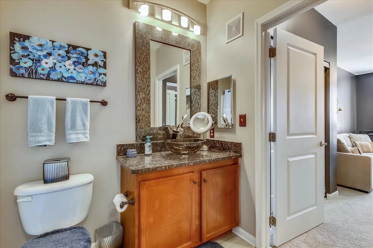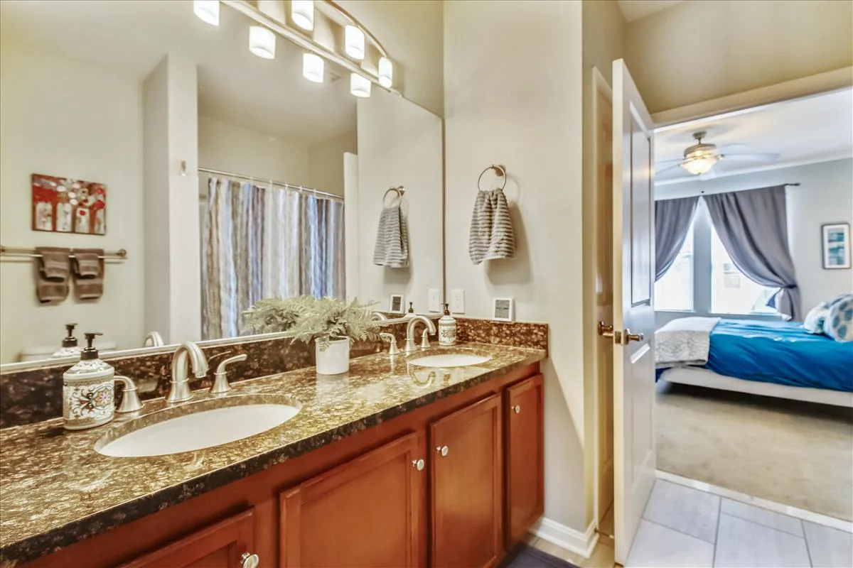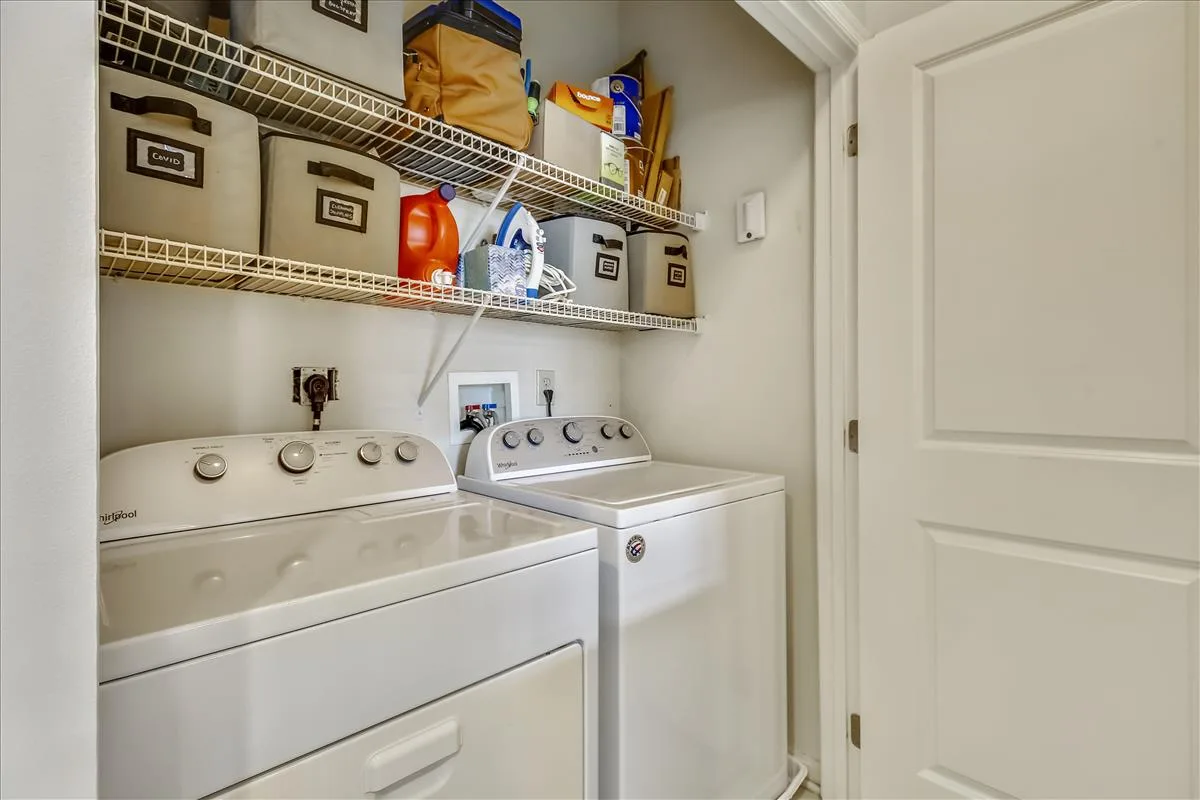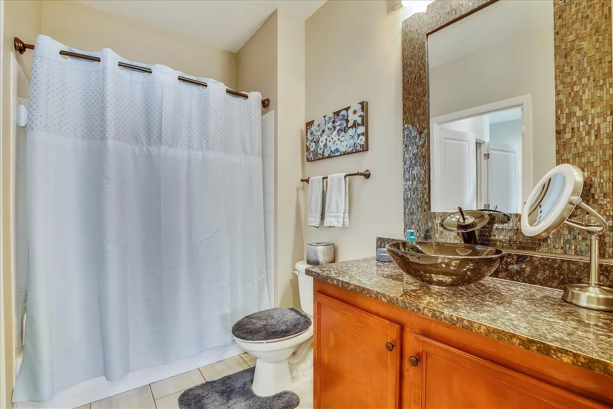 The spacious primary bedroom has more than enough room to fit a king bedroom set and is accented with plush carpeting and a ceiling fan with light. It features an ensuite bathroom with upgraded flooring, a granite-topped double vanity, & a sparkling white shower with jetted soaking tub, plus a HUGE walk-in closet with tons of storage options. The second bedroom features large dual closets, a ceiling fan with light, & ensuite access to the second bathroom, accented with upgraded flooring, a granite-topped vanity with contemporary vessel sink, & a sparkling white shower. A laundry closet with full-sized washer & dryer (2019) and plenty of storage shelving completes this home. Other home features include a newer water heater (2021) and a recently replaced roof over the unit (2021).