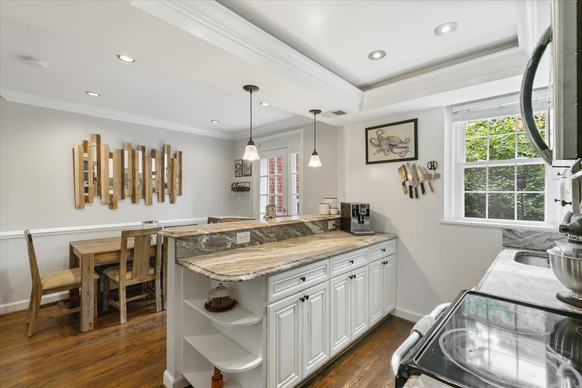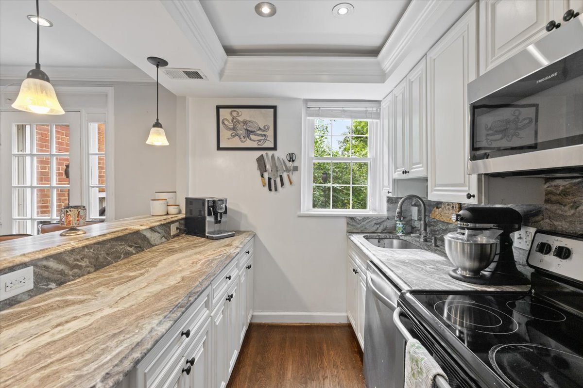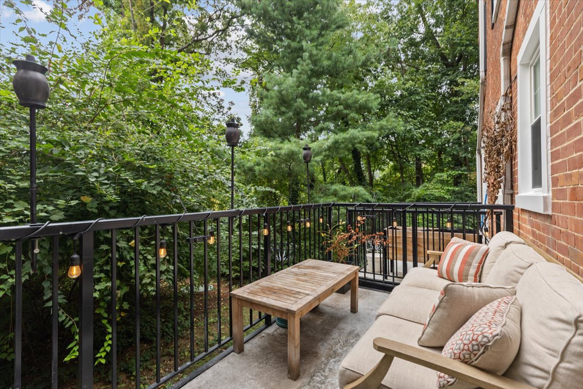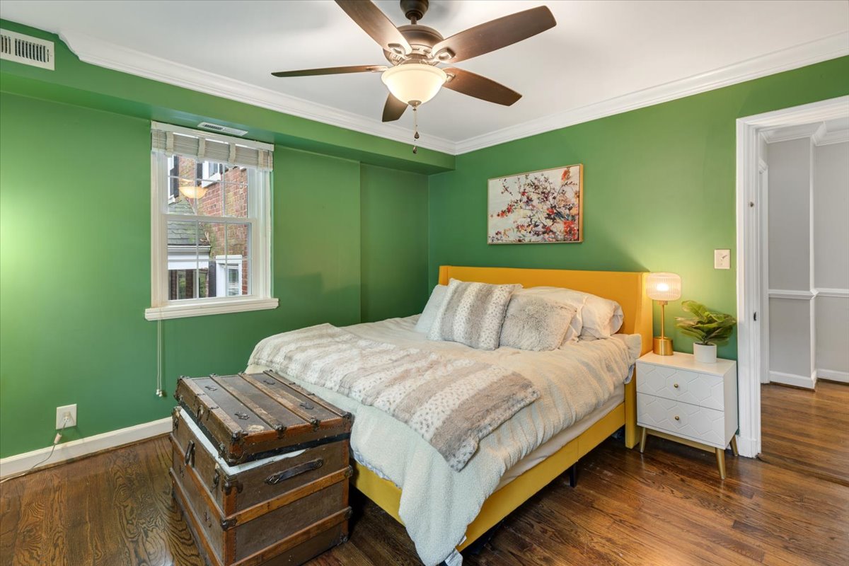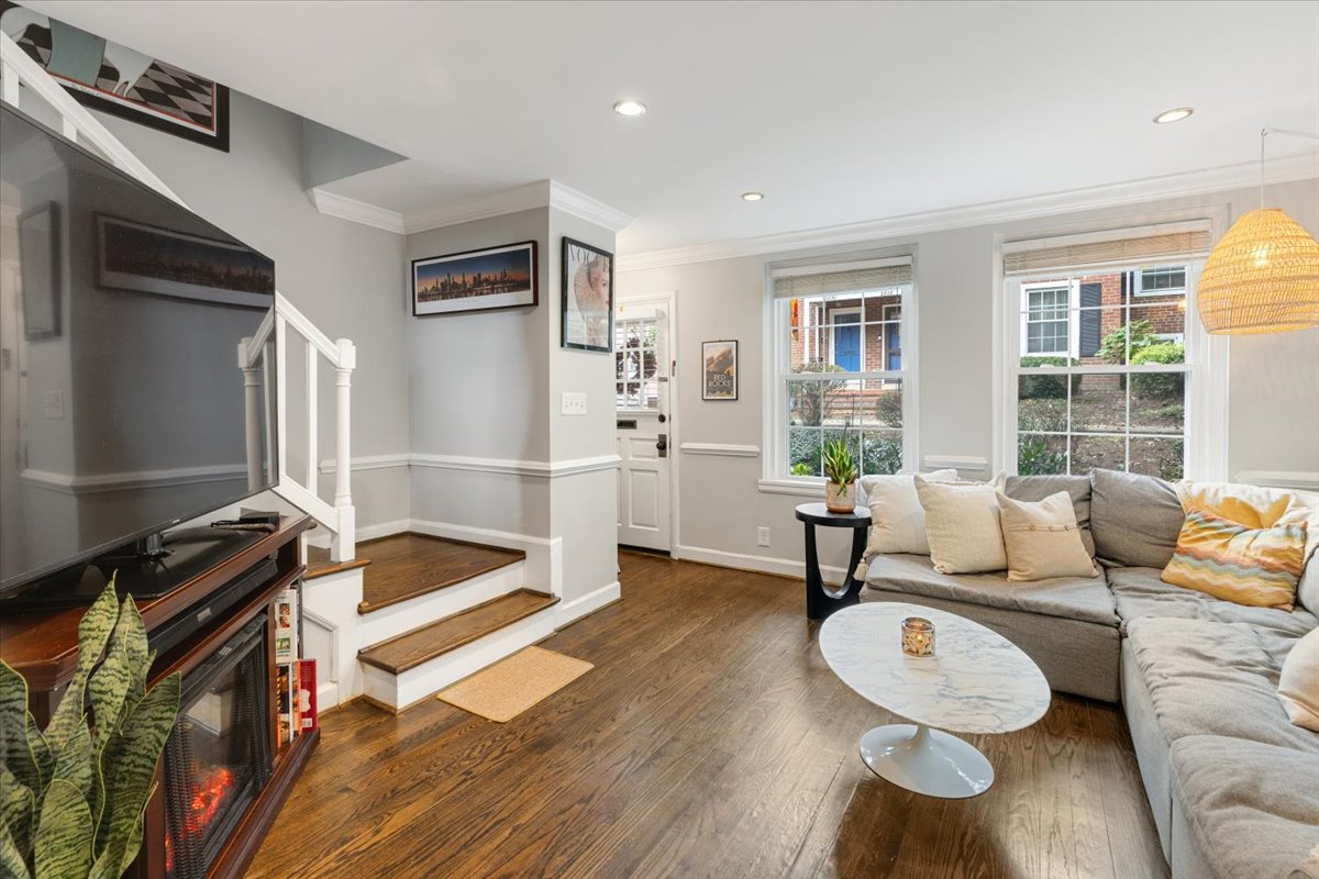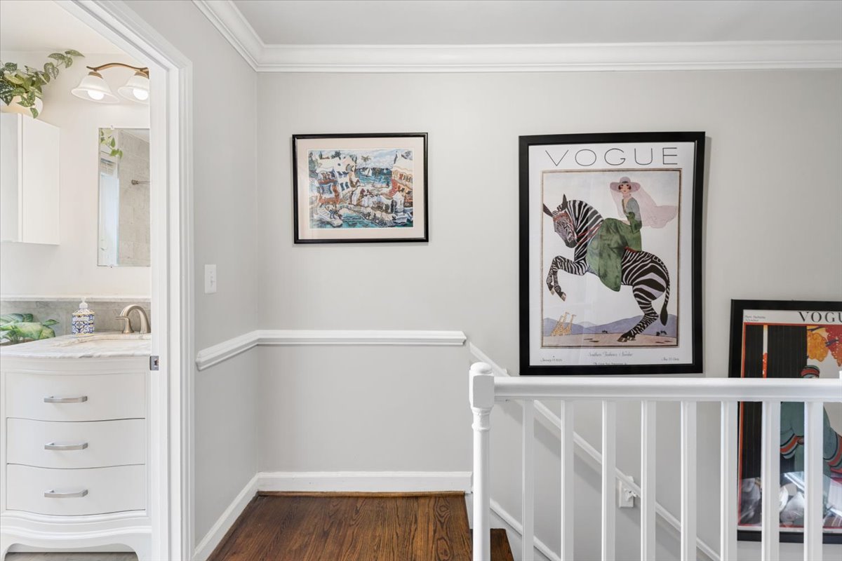Stunning 2-bedroom, 2-bathroom Clarendon II model townhome nestled in Fairlington Villages! This partial end unit features a light-filled living room with windows on two walls, and gleaming hardwood floors, crown & chair rail molding, & recessed lighting throughout the main level. The renovated open kitchen is accented with custom cabinetry, granite countertops & backsplash, stainless steel appliances including a new refrigerator & microwave (2025), a tray ceiling with cove lighting, & a breakfast bar with pendant lighting. A separate dining area features a French door that provides access to the private & serene balcony. The upper level also features hardwood floors & crown molding throughout the primary bedroom with a ceiling fan & walk-in closet & secondary bedroom. A lovely renovated bathroom features a white marble-topped vanity, a custom tiled shower, recessed lighting, & a large over-toilet medicine cabinet for extra storage.