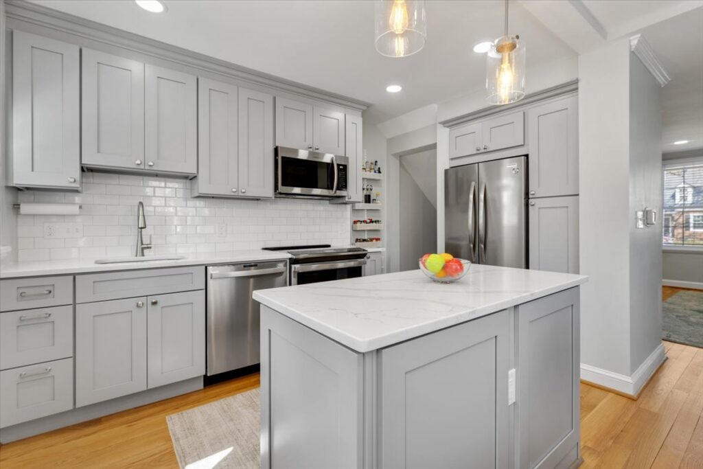 Gorgeous 2-bedroom, 2-bathroom Clarendon II model townhome nestled in Fairlington Villages! This beautifully updated home features refinished & richly stained hardwood floors on the main & upper floors, updated bannisters, spindles, & door hardware throughout. The spacious living room flows into the dining area, which are both accented with crown molding & recessed lighting – creating the perfect space for everyday living or entertaining. The renovated open kitchen showcases updated gray cabinetry, stone countertops, a gray subway tile backsplash, stainless steel appliances including newer dishwasher (2025), a peninsula with pendant lighting, & pantry cabinets for excellent storage. Just off the kitchen, step outside to the private back patio with a newly installed fence (2025) – ideal for relaxing, grilling, or enjoying time outdoors.