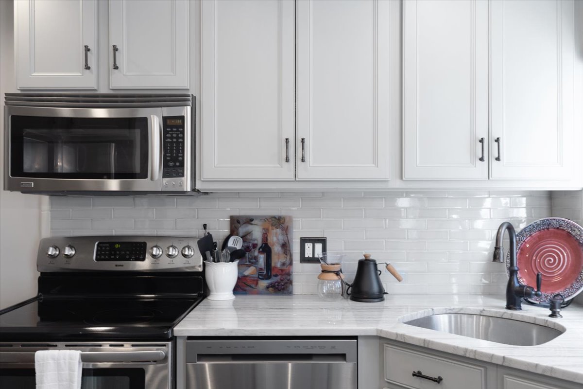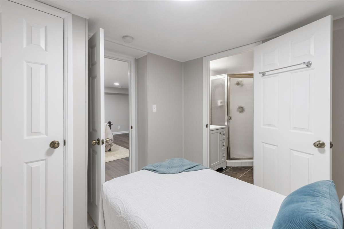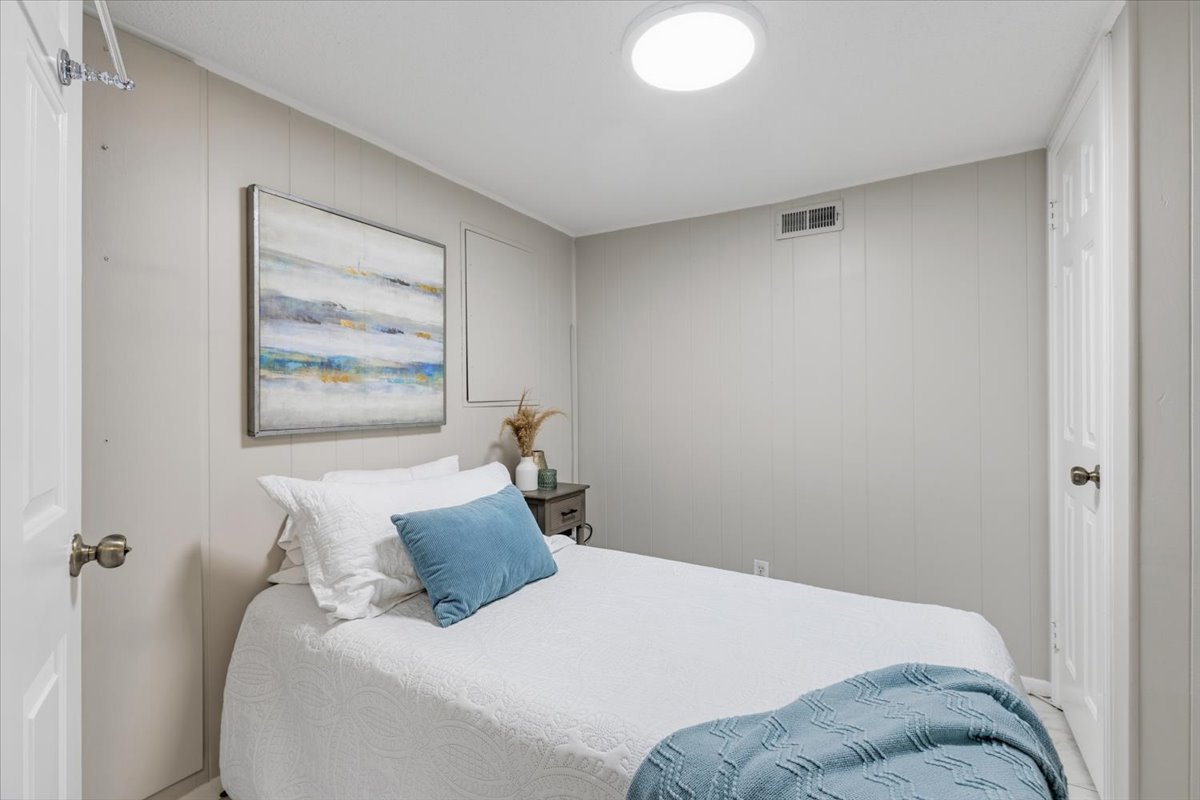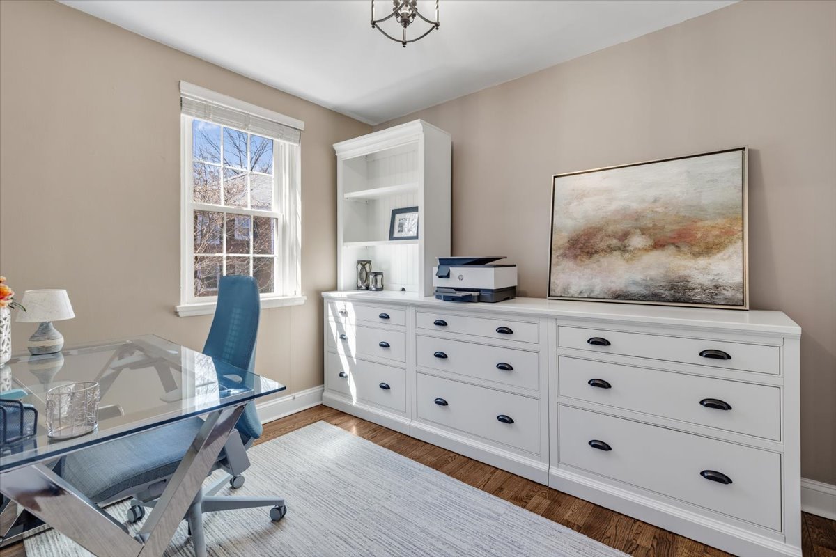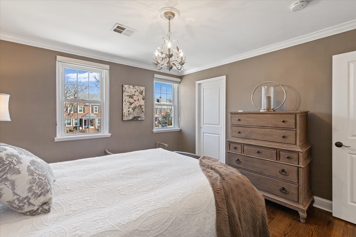 Upstairs, the beautifully updated bathroom features tile flooring, a white stone-topped vanity, and a white tiled shower with convenient corner shelving. The spacious primary bedroom is accented with crown molding, contemporary paint, a chandelier, & includes a large walk-in closet with custom built-ins. The second bedroom also offers a closet with built-in organization and plenty of natural light.