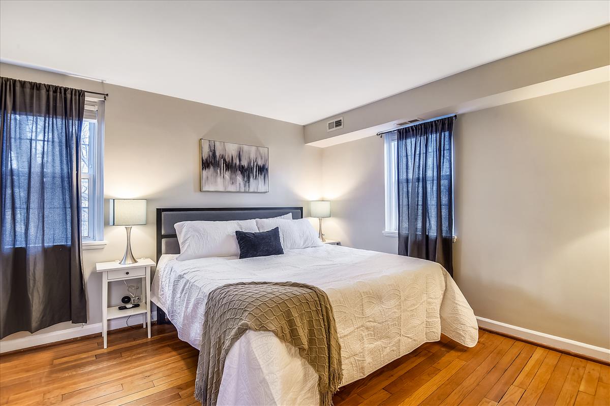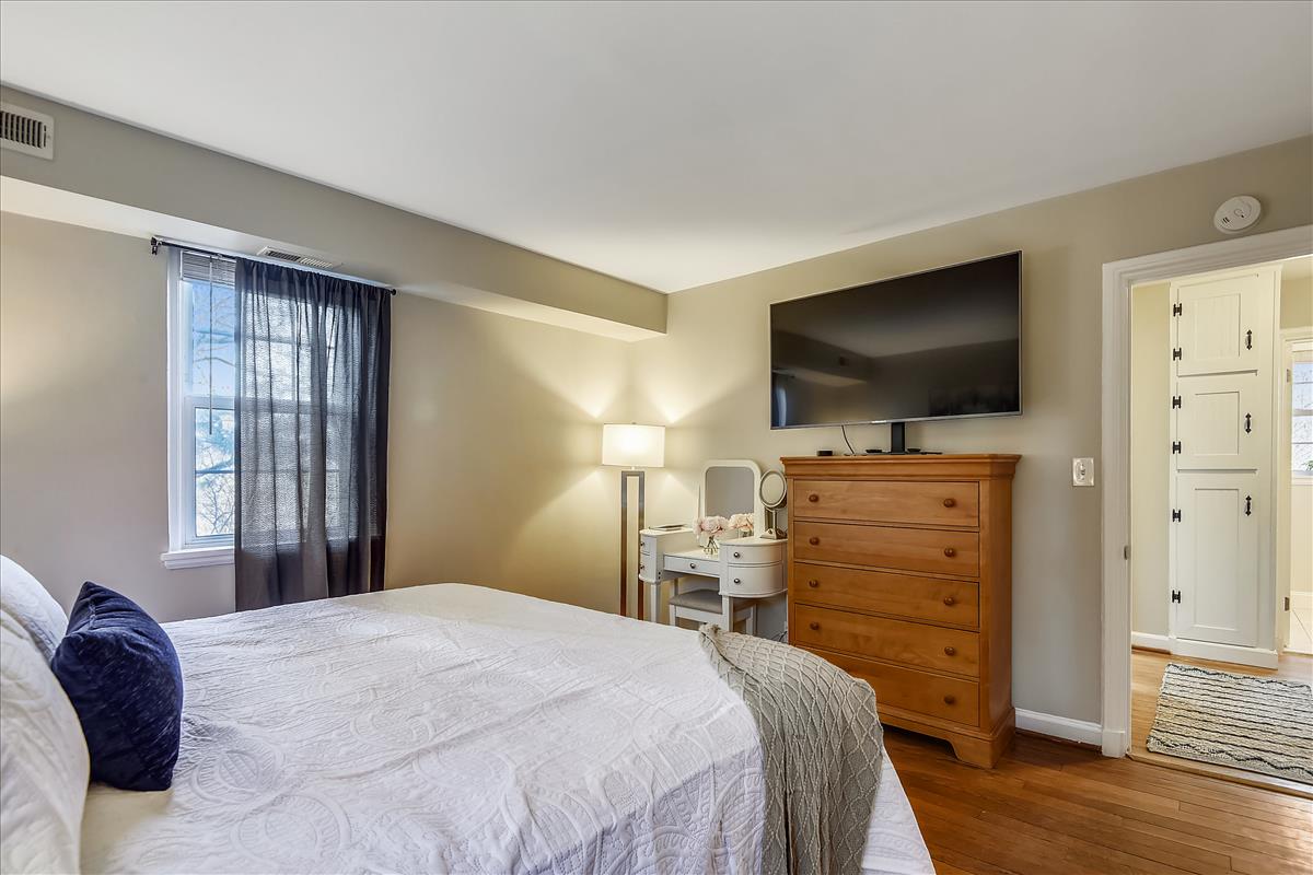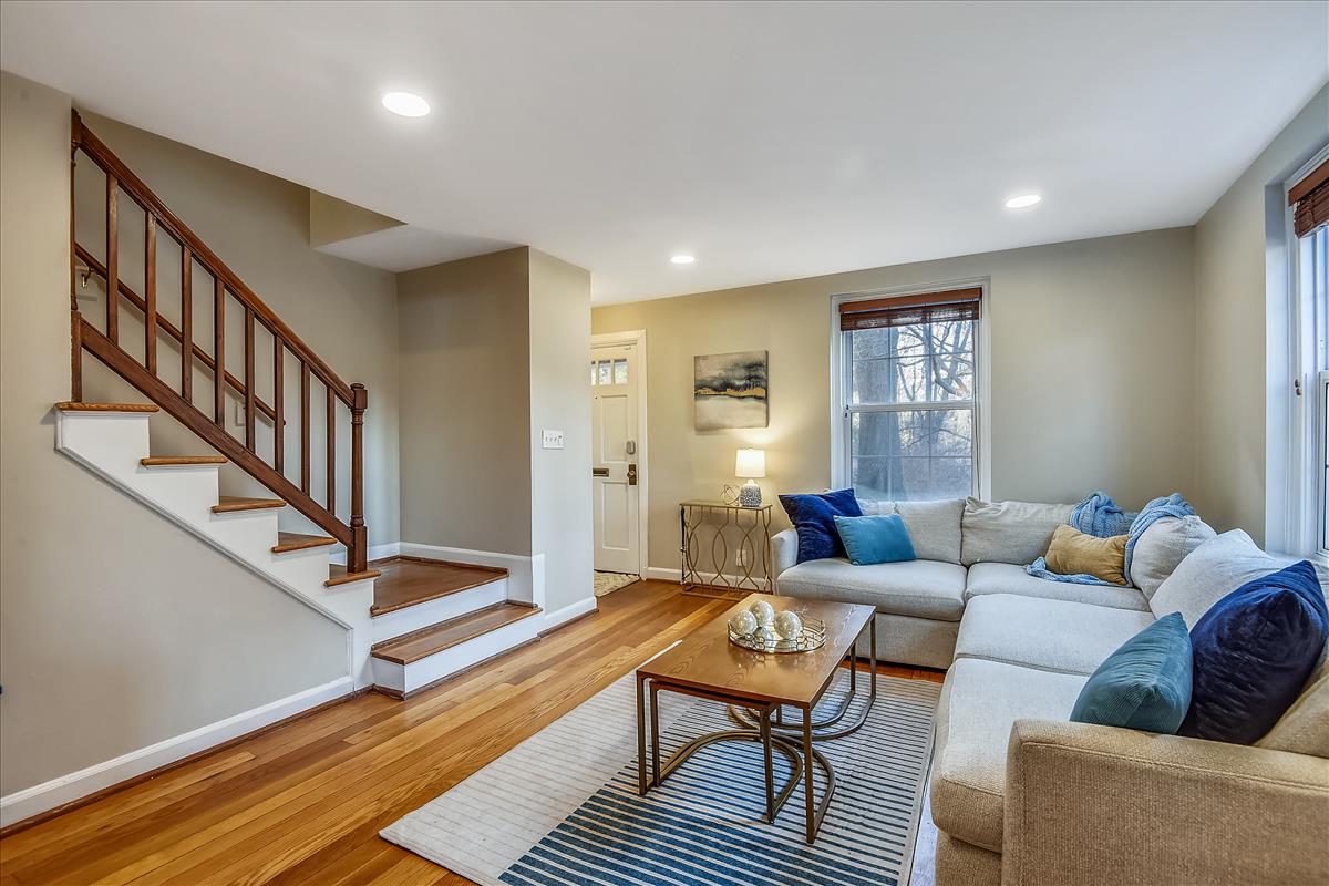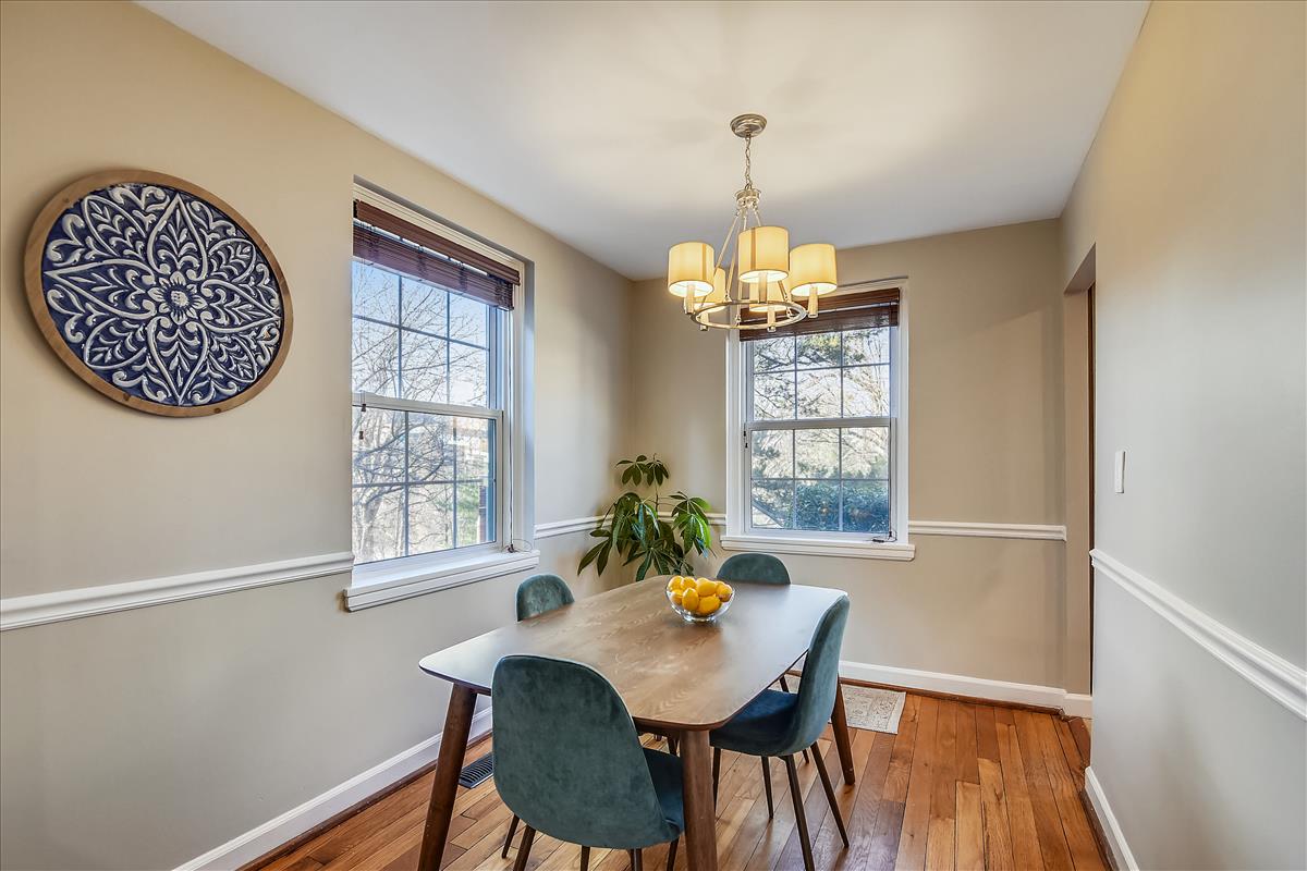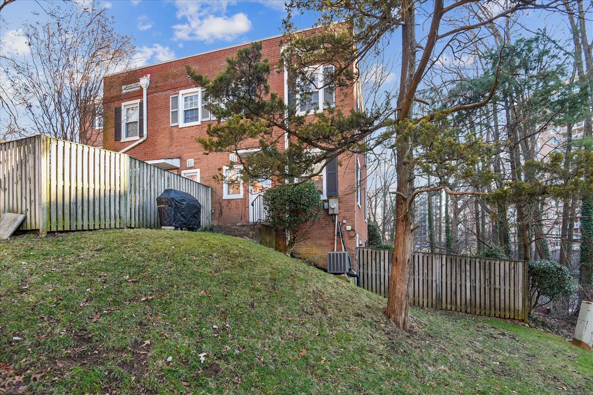 Beautiful 2 bedroom, 2 bathroom Clarendon II model townhome nestled in Fairlington Villages! This light-filled end unit features fresh paint throughout the home and gleaming hardwood floors & recessed lighting on the main level. The kitchen is accented with updated cabinets, quartz countertops, tile backsplash, stainless steel appliances (including a NEW stove & microwave), & a spacious separate dining area. The upper level includes two bedrooms & a full bathroom. The primary bedroom features a closet with custom build-outs and a modern barn door. The second bedroom also has a closet with custom shelving and is perfect to use as either a home office or bedroom. The full bathroom with a vessel-topped vanity, matching storage cabinet, & tiled shower completes this level. The lower level is accented with gorgeous engineered hardwood flooring throughout the spacious recreation room with a good-sized utility/storage closet and bonus room. The full bathroom is accented with a custom glass-enclosed shower with niche shelving & a laundry nook with a full-sized washer/dryer and overhead shelving. This home features newer windows and RARE double access to the outdoors – one to the private, relaxing patio and another to an expansive green space behind the house. Fairlington Villages amenities include 6 pools, lighted tennis courts, tot lots, walking trails, & MORE! Great location near I-395, & the shops and restaurants of Shirlington Village.