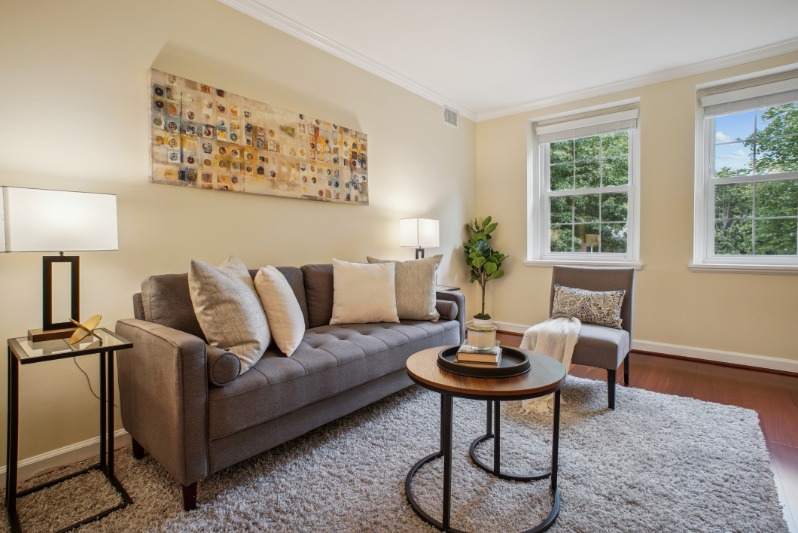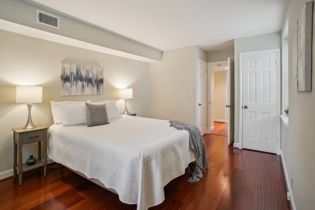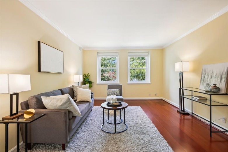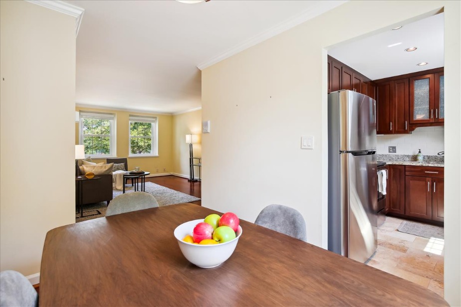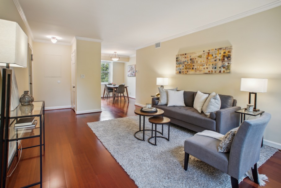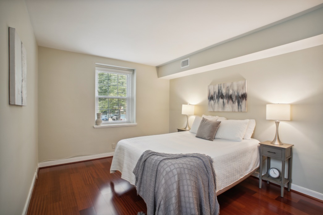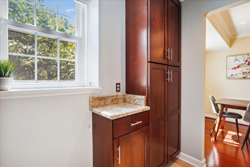 Gorgeous 1 bedroom, 1 bathroom Braddock model home nestled in Fairlington Villages! This fully-renovated home features a coat closet in the home entryway and a spacious living room with beautiful cherry hardwood flooring & crown molding. The kitchen is accented with travertine tile flooring, recessed lighting, updated cabinetry, granite countertops, stainless steel appliances, subway tile backsplash, & large pantry cabinets. The separate dining area features a contemporary light fixture and is spacious enough to fit a full-size dining table. The back hallway features a utility/laundry closet with a full-sized stackable washer & dryer. The spacious & light-filled bedroom is large enough to fit a king bedroom set and features two closets, including one large walk-in with overhead lighting. The updated bathroom (2019) is accented with tile flooring, a gray vanity with soft-close drawers, a modern light fixture, a medicine cabinet, & a floor-to-ceiling tiled walk-in shower with glass doors, niche shelving, polished rock detailing, & a corner bench. Other home features include a newer water heater (2020), newer HVAC (2020), updated vinyl windows & blinds (2019), and two reserved parking spaces. Fairlington Villages amenities include six pools, lighted tennis courts, tot lots/playgrounds, walking paths, & MORE! Great location near I-395 & the shops and restaurants of The Village at Shirlington, West Alex, Baileys Crossroads, Del Ray, & Old Town Alexandria.