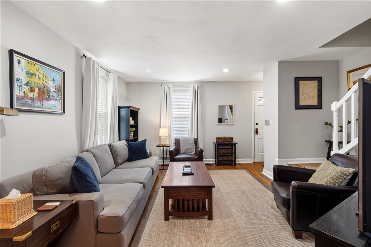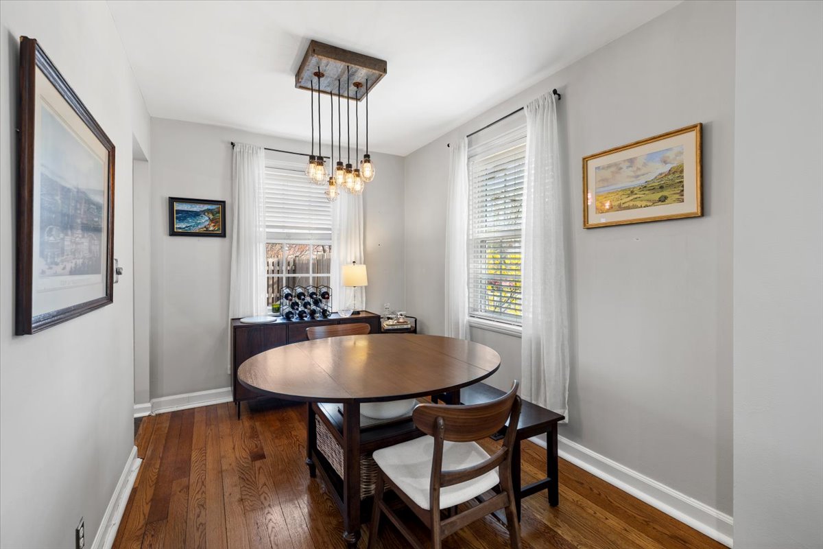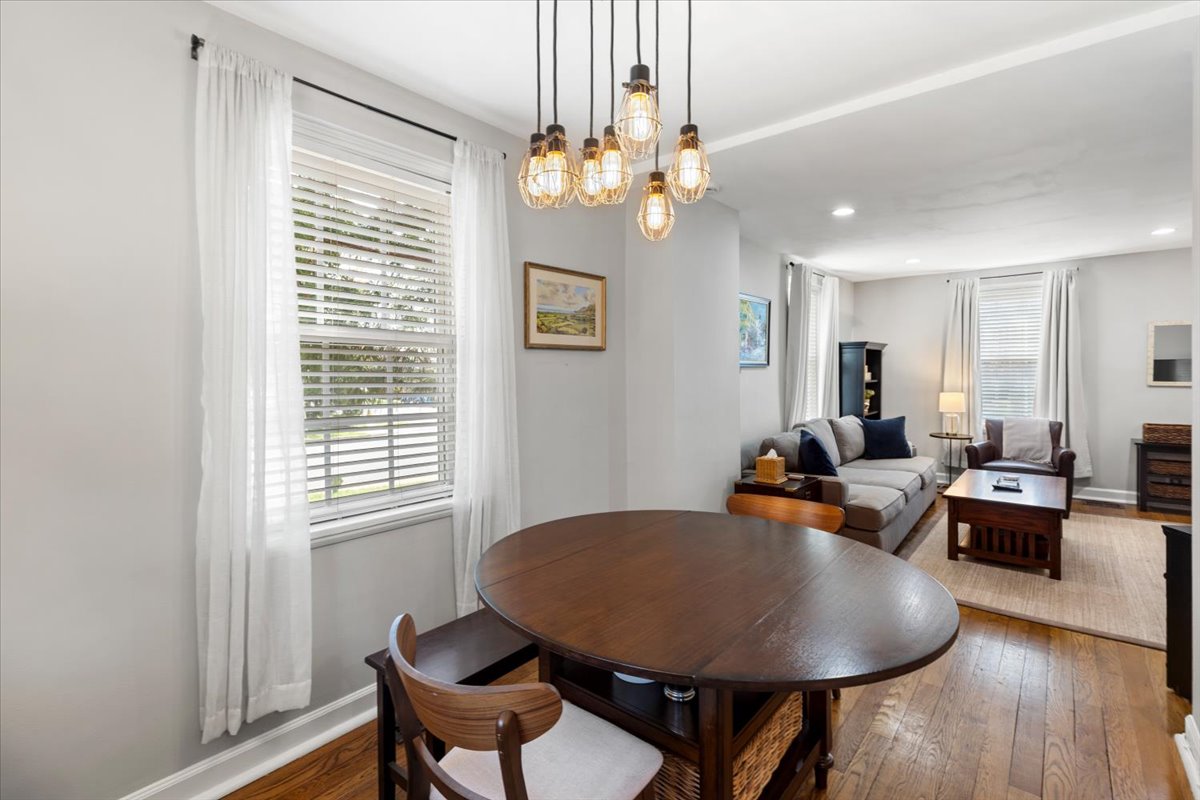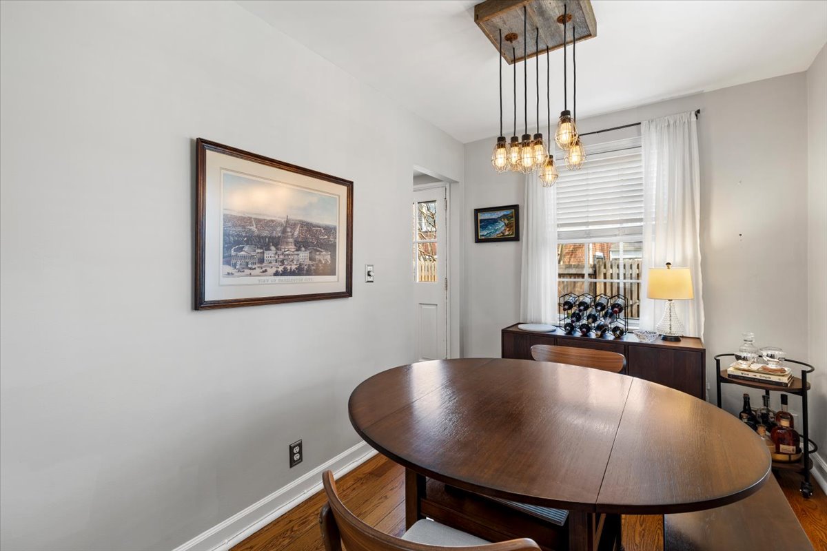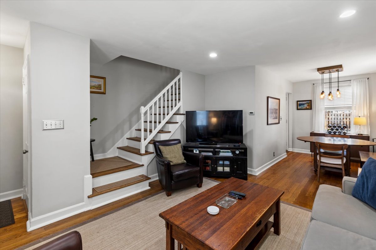 Beautiful 2-bedroom, 2-bathroom Clarendon II townhome nestled in sought-after Fairlington Villages! This desirable end-unit offers added privacy and is filled with natural light throughout. The main level features gleaming hardwood floors, neutral paint, & a spacious living room with recessed lighting – perfect for both relaxing & entertaining. The dining area showcases a stylish industrial light fixture & overlooks the private, fully fenced back patio – ideal for outdoor dining, grilling, or unwinding. The kitchen is both functional & well-appointed with tile flooring, granite countertops, off-white cabinetry, stainless steel appliances, & recessed lighting.