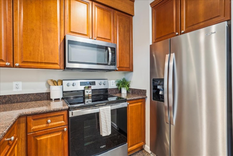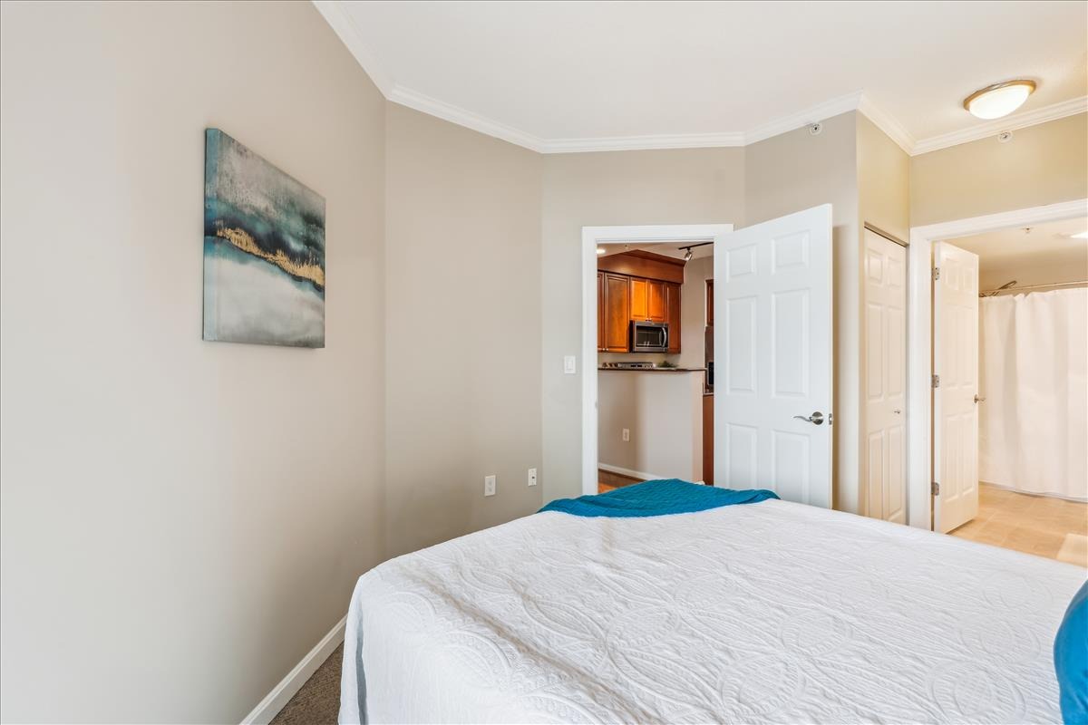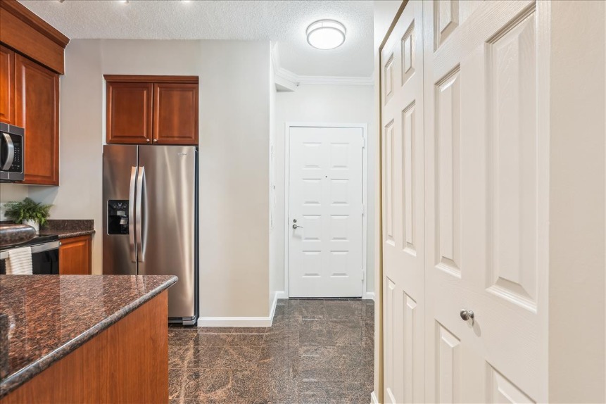 Beautiful 1-bedroom, 1-bathroom penthouse condo, perfectly perched in the sought-after Northampton Place community. Inside, you’ll find tile flooring in the entry with a coat closet, tall ceilings, and crown molding throughout. The kitchen features granite countertops, cherry wood cabinetry, stainless steel appliances – including a newer refrigerator, dishwasher, and microwave (2023) and disposal (2022), track & recessed lighting, and a breakfast bar. The open-concept living and dining areas with hardwood floors and a tray ceiling are ideal for both relaxing and entertaining. A large sliding glass door fills the space with natural light and leads to the balcony, the perfect spot to enjoy your morning coffee and watch the sunrise. A laundry closet with a newer stacked washer & dryer (2023) completes the main living area. A spacious bedroom with dual closets & a large window with balcony views, and a bathroom with an oversized stone-topped vanity, large medicine cabinet mirror, sparkling white shower, heat lamp, & tile flooring complete this lovely home.