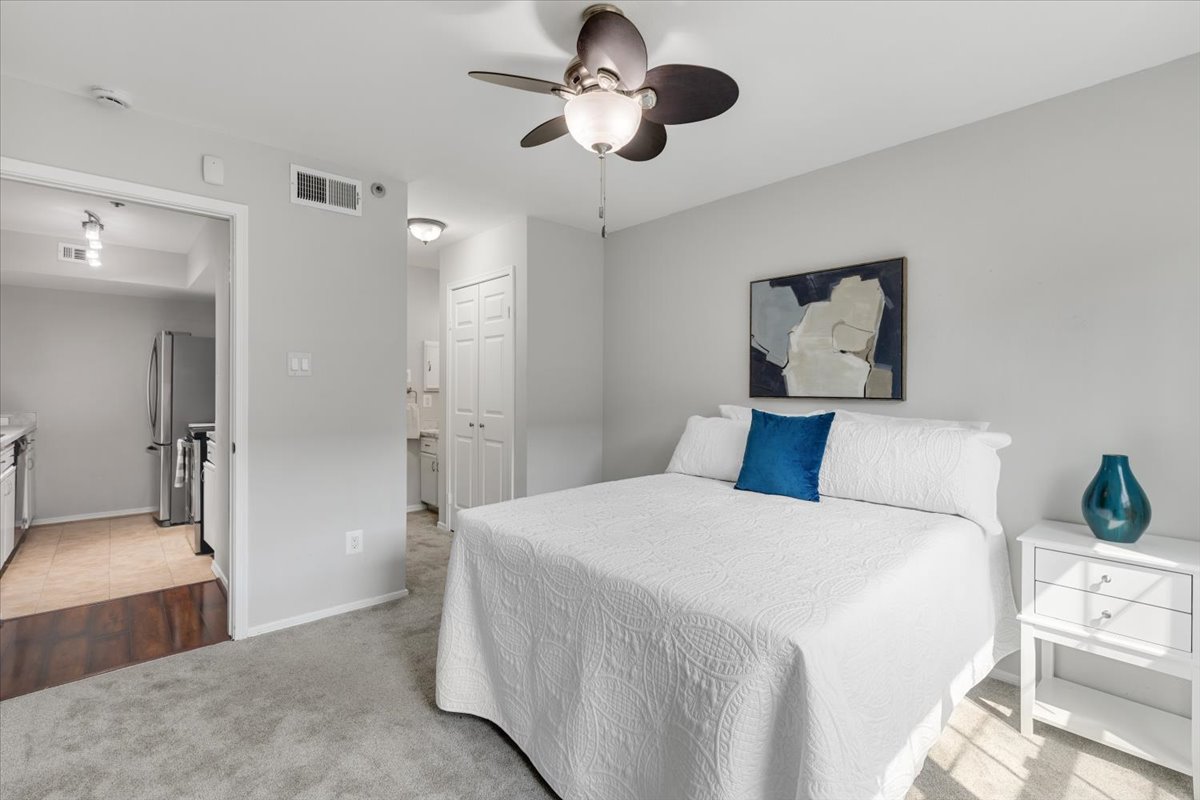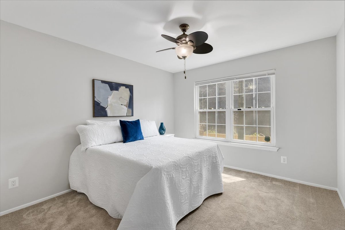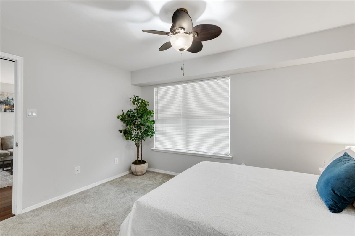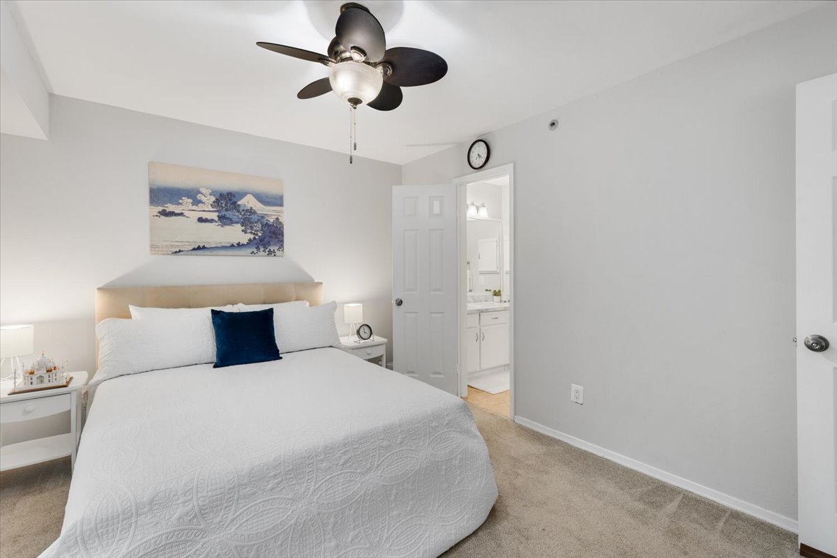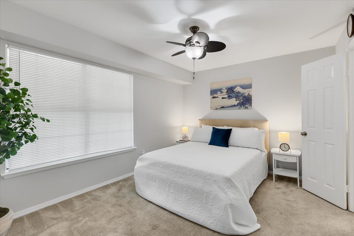 The primary bedroom is a comfortable retreat with plush carpeting, a large window, &a ceiling fan with overhead lighting. It also features a spacious walk-in closet & an en-suite bathroom complete with an oversized vanity, large mirror, medicine cabinet, & a sparkling white shower. The 2nd bedroom includes a ceiling fan with overhead light, two large closets, & its own en-suite bathroom with a separate vanity. A laundry closet with a full-sized washer & dryer + overhead shelving completes the thoughtful layout.