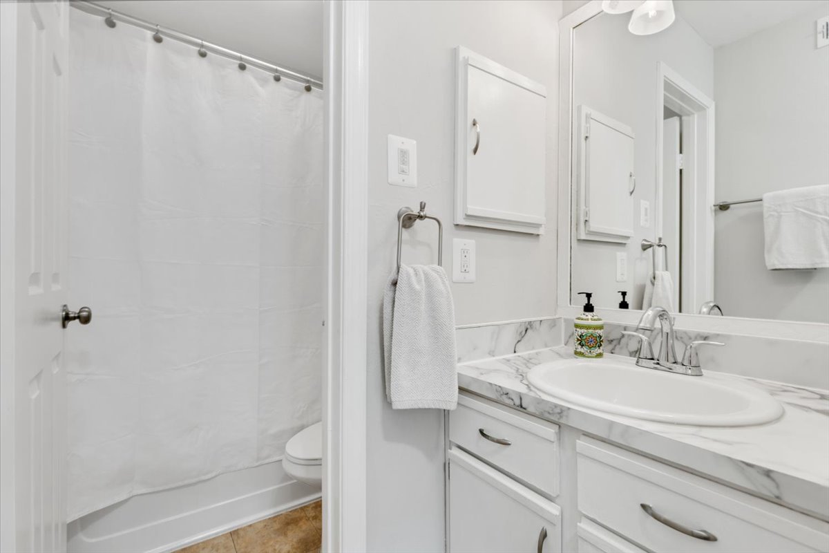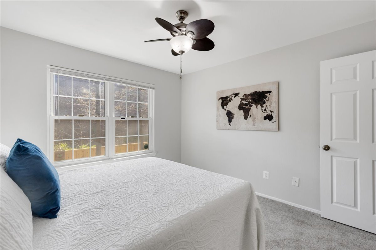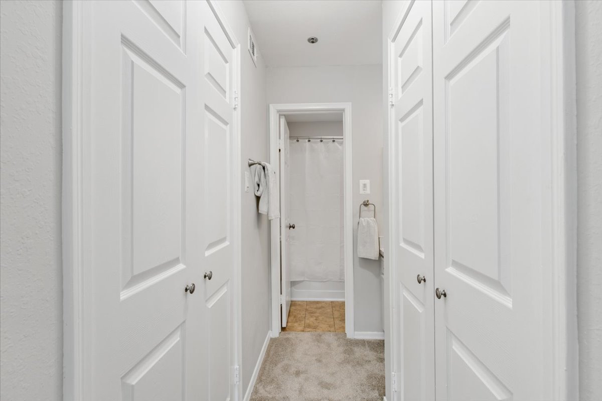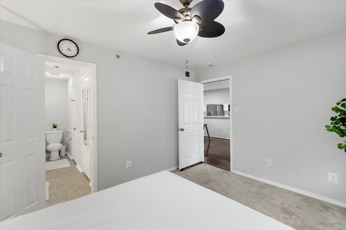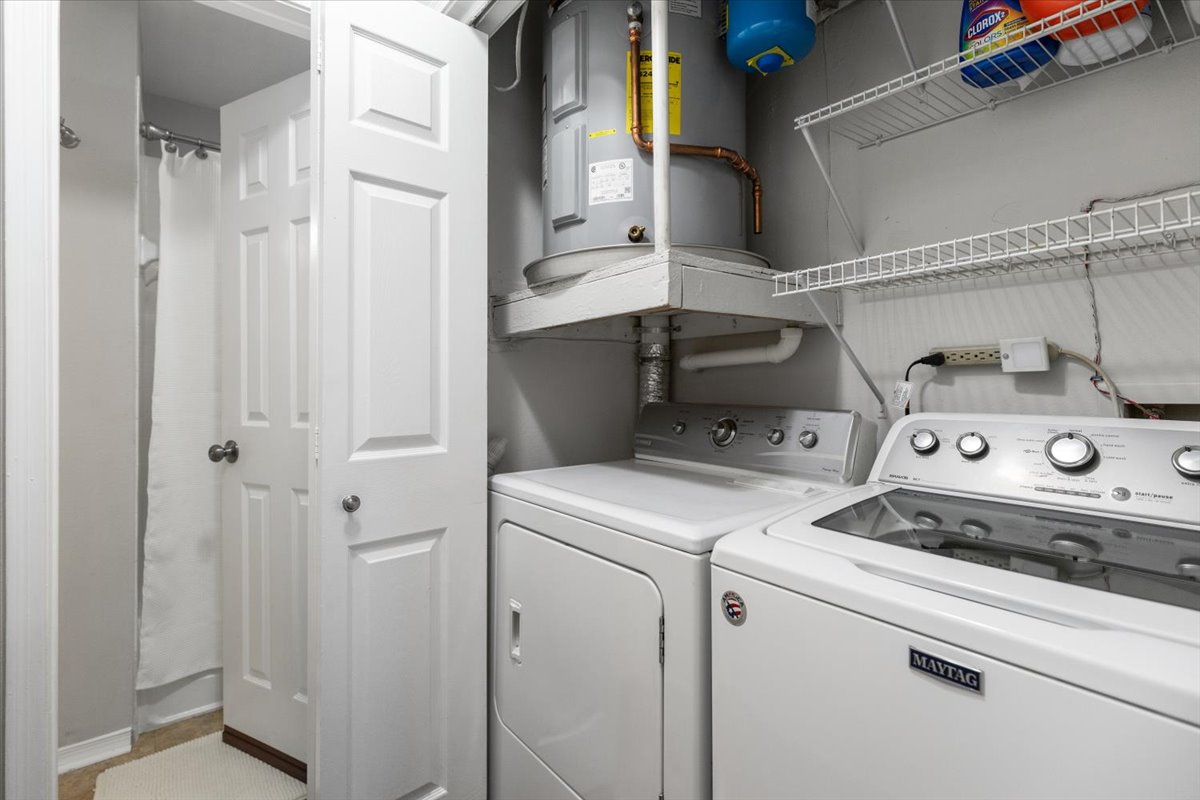 The primary bedroom is a comfortable retreat with plush carpeting, a large window, &a ceiling fan with overhead lighting. It also features a spacious walk-in closet & an en-suite bathroom complete with an oversized vanity, large mirror, medicine cabinet, & a sparkling white shower. The 2nd bedroom includes a ceiling fan with overhead light, two large closets, & its own en-suite bathroom with a separate vanity. A laundry closet with a full-sized washer & dryer + overhead shelving completes the thoughtful layout.
