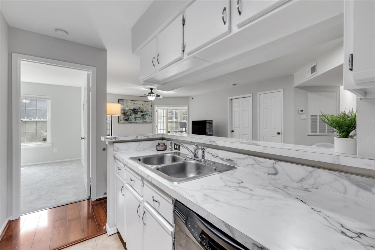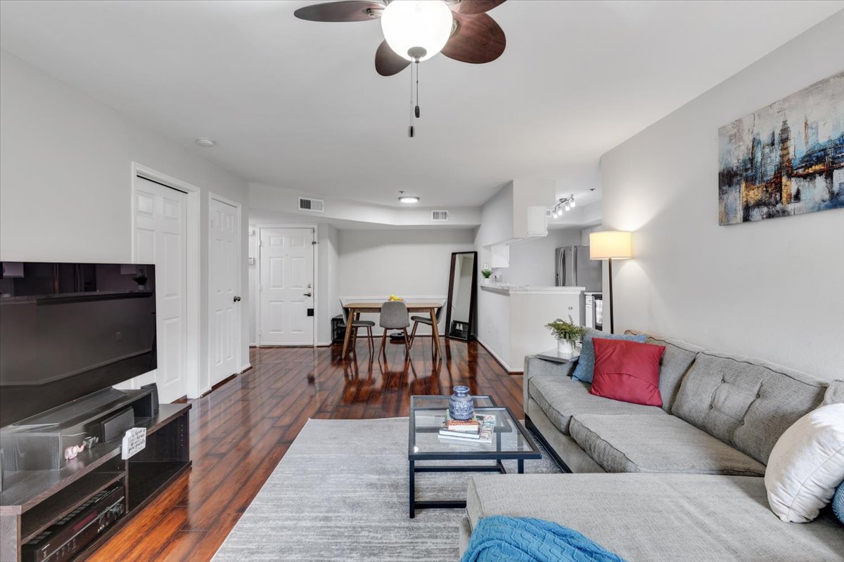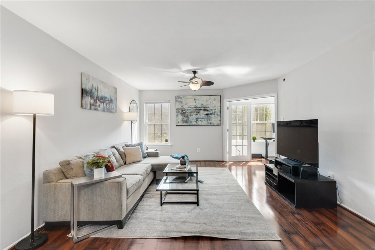 Beautiful 2-bedroom, 2-bathroom end-unit condo at the Point at Park Center Condominium in Alexandria West! The open-concept main living area features gleaming hardwood floors, neutral paint, & a seamless flow from the dining area with overhead lighting, into the spacious living room with a ceiling fan and overhead light. A convenient coat/storage closet adds everyday functionality right at the entry. The kitchen is both stylish and practical, offering tile flooring, white cabinetry, & stainless steel appliances. Just off the living room, the enclosed sunroom provides a versatile bonus space with a storage closet – perfect for a home office, workout area, or cozy sitting room.