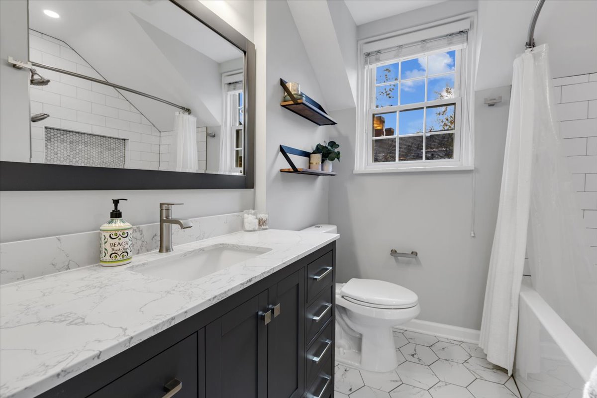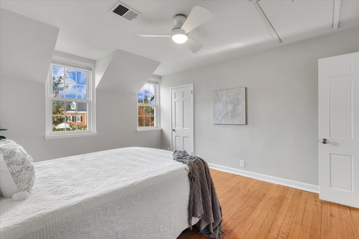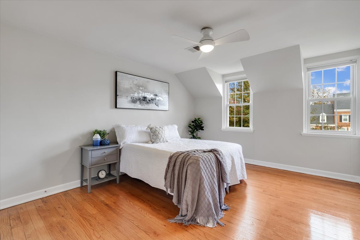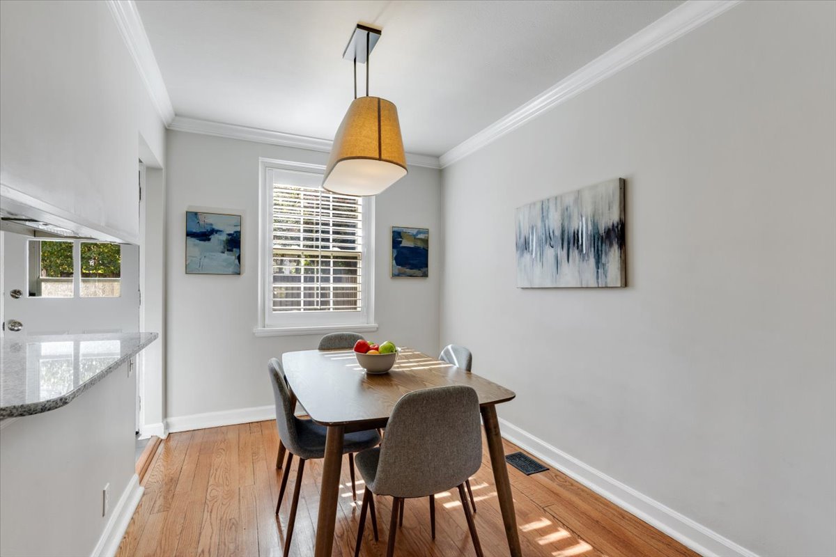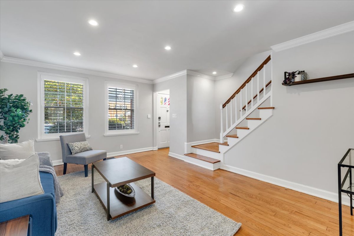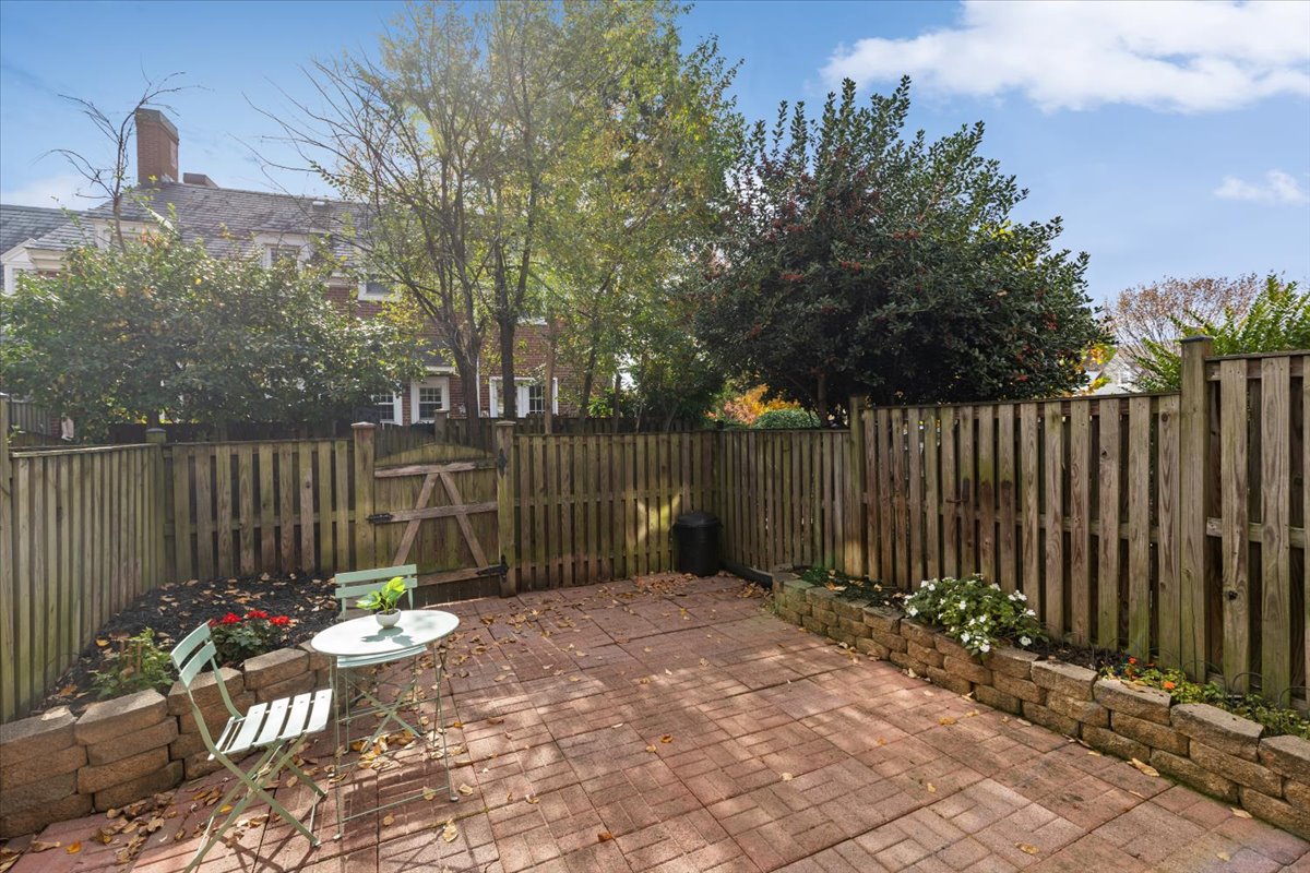 Gorgeous 2-bedroom, 2-bathroom Clarendon I model townhome nestled in Fairlington Arbor. The light-filled main level features gleaming hardwood flooring, crown molding, custom wood shutters, & neutral paint throughout the living room with recessed lighting & separate dining area with modern fabric shade chandelier. The partially open kitchen is accented with granite countertops, tile backsplash, recessed lighting, tile flooring, stainless steel appliances including a new Fisher & Paykel refrigerator (2024), & a new disposal (2025). The back door leads to the private & serene brick patio with elevated gardening beds – the perfect spot to relax or entertain! The upper level features a spacious primary bedroom with a custom closet & a ceiling fan with overhead lighting. A second bedroom with recessed lighting & a ceiling fan, and a renovated bathroom with oversized stone-topped vanity, hexagon tile flooring, & a subway tile shower with niche shelving completes this level.