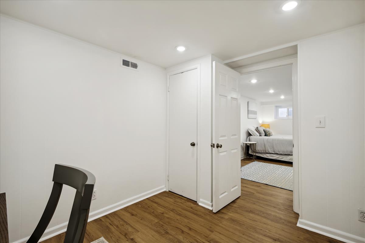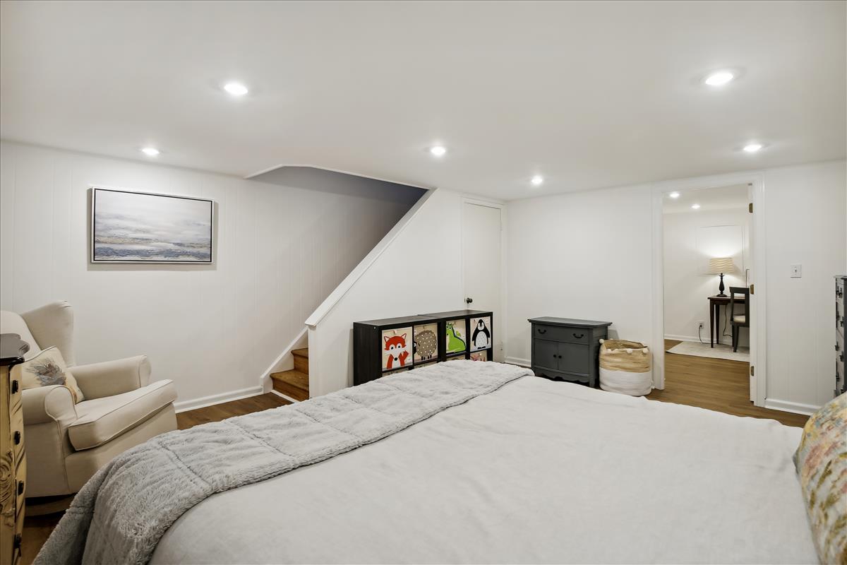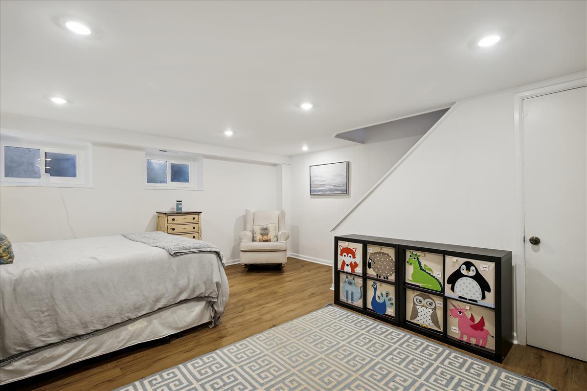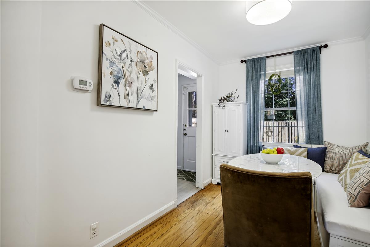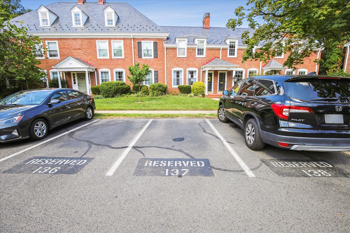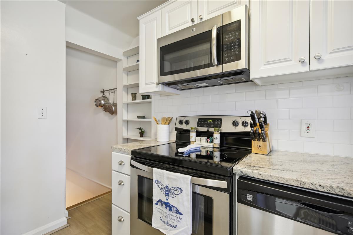 The light-filled main level features gleaming hardwood floors, crown molding & white paint throughout. The updated kitchen is accented with white cabinetry, granite countertops, stainless steel appliances (2017), subway tile backsplash, & open shelving for extra storage! The spacious separate dining area overlooks the private & serene back patio with updated bluestone pavers. The upper level features a spacious primary bedroom with a ceiling fan & two closets (one with new closet organizers). The second bedroom also includes a ceiling fan & a closet with new organizers. A full bathroom with pocket door entry, black & white floor tile, a pedestal sink, & a sparkling white tiled shower completes this level. The lower level features upgraded LVP flooring & recessed lighting throughout the large recreation room & bonus room, commonly used for guests or as a home office. The updated bathroom with pedestal sink, updated glass-enclosed corner shower, & laundry nook with full-sized washer & dryer (2017) + additional overhead storage completes this level. Other home features include a floored attic for extra storage space & one assigned parking space (#137).