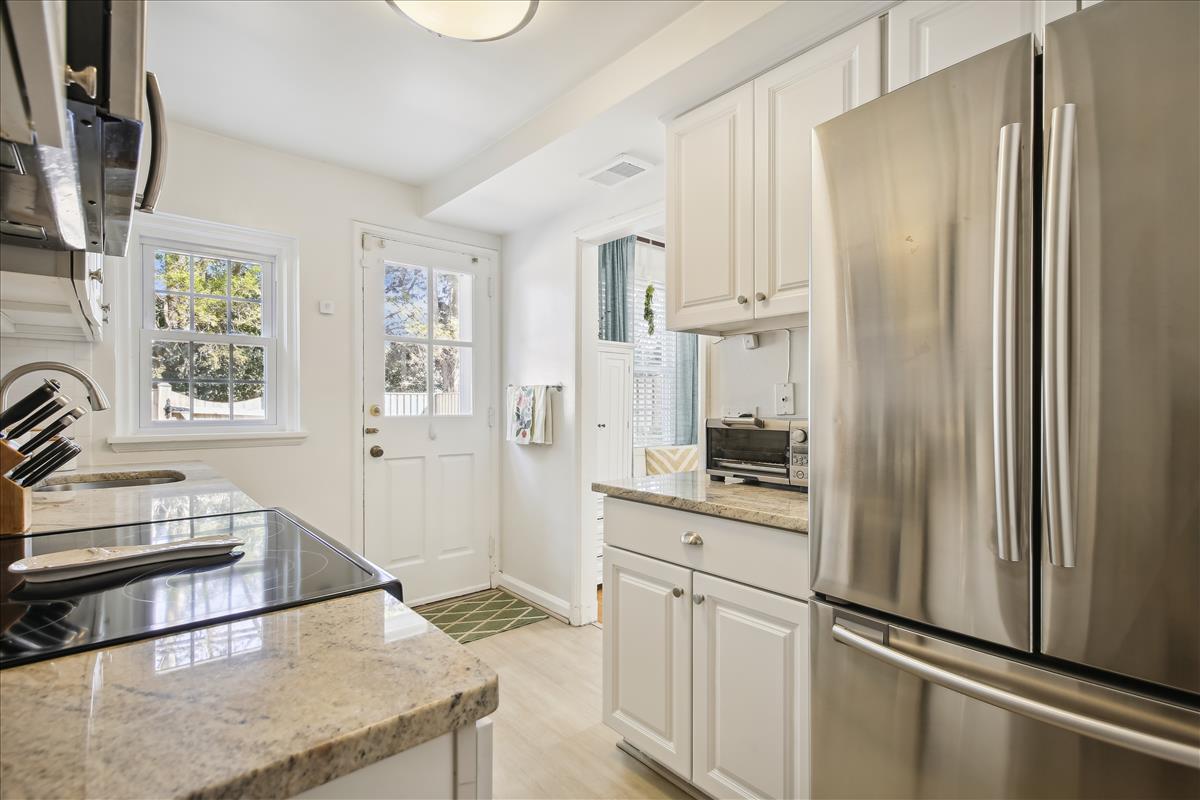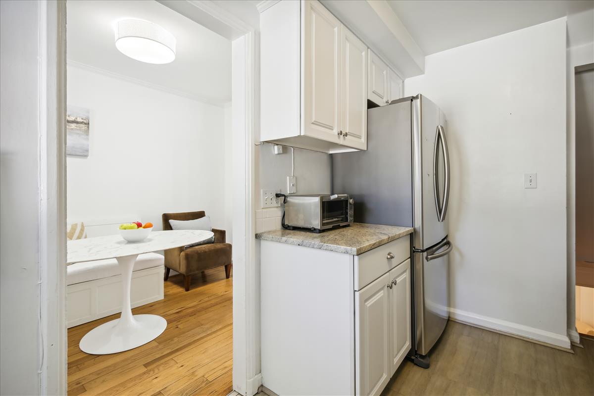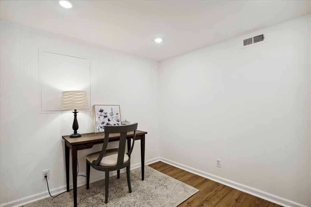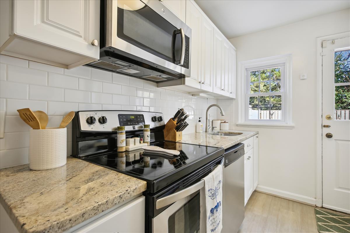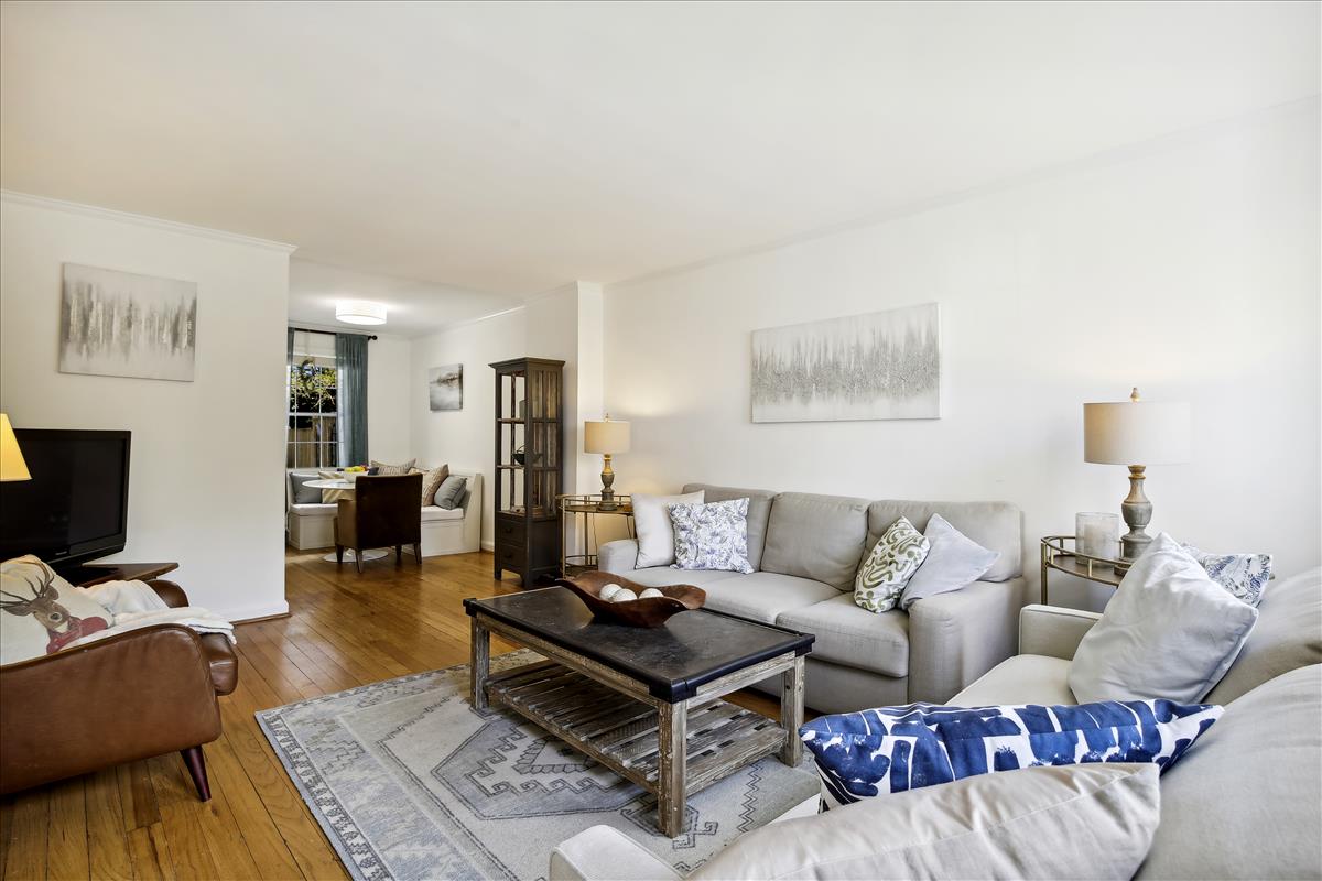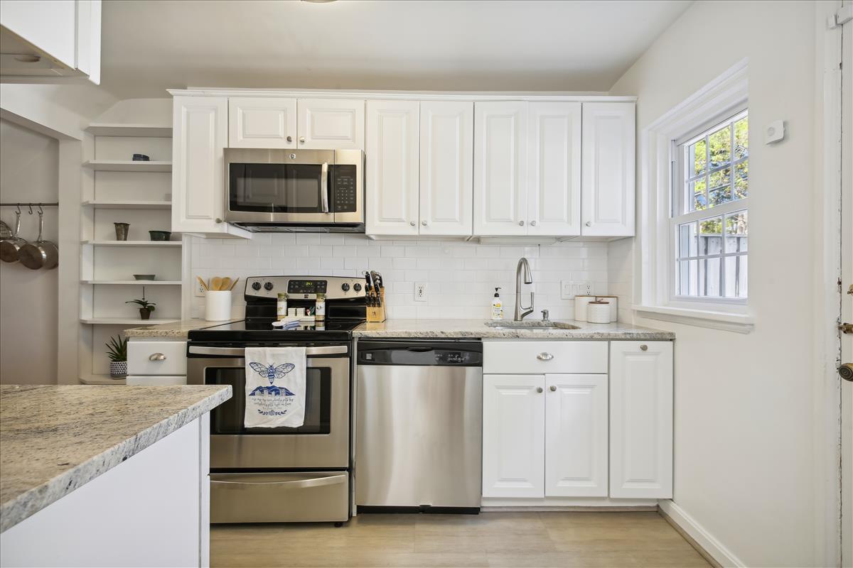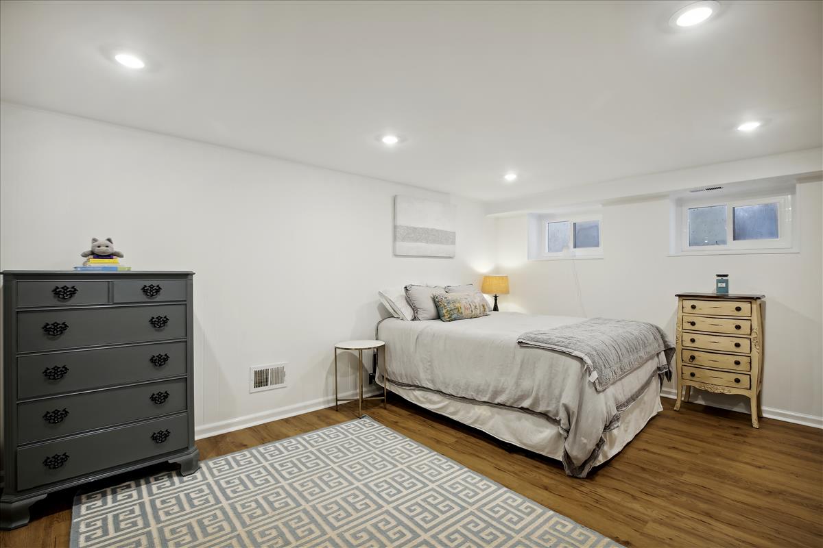 The light-filled main level features gleaming hardwood floors, crown molding & white paint throughout. The updated kitchen is accented with white cabinetry, granite countertops, stainless steel appliances (2017), subway tile backsplash, & open shelving for extra storage! The spacious separate dining area overlooks the private & serene back patio with updated bluestone pavers. The upper level features a spacious primary bedroom with a ceiling fan & two closets (one with new closet organizers). The second bedroom also includes a ceiling fan & a closet with new organizers. A full bathroom with pocket door entry, black & white floor tile, a pedestal sink, & a sparkling white tiled shower completes this level. The lower level features upgraded LVP flooring & recessed lighting throughout the large recreation room & bonus room, commonly used for guests or as a home office. The updated bathroom with pedestal sink, updated glass-enclosed corner shower, & laundry nook with full-sized washer & dryer (2017) + additional overhead storage completes this level. Other home features include a floored attic for extra storage space & one assigned parking space (#137).