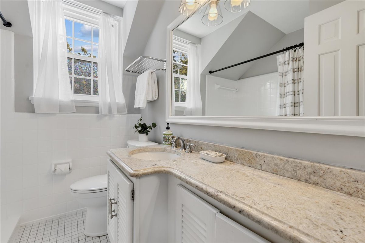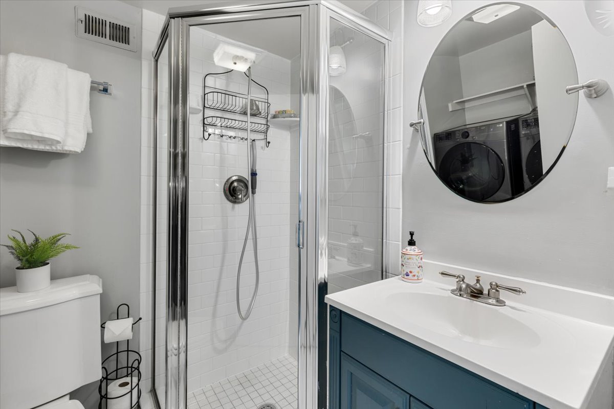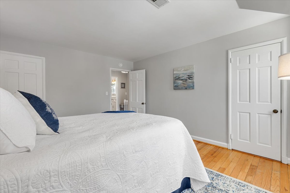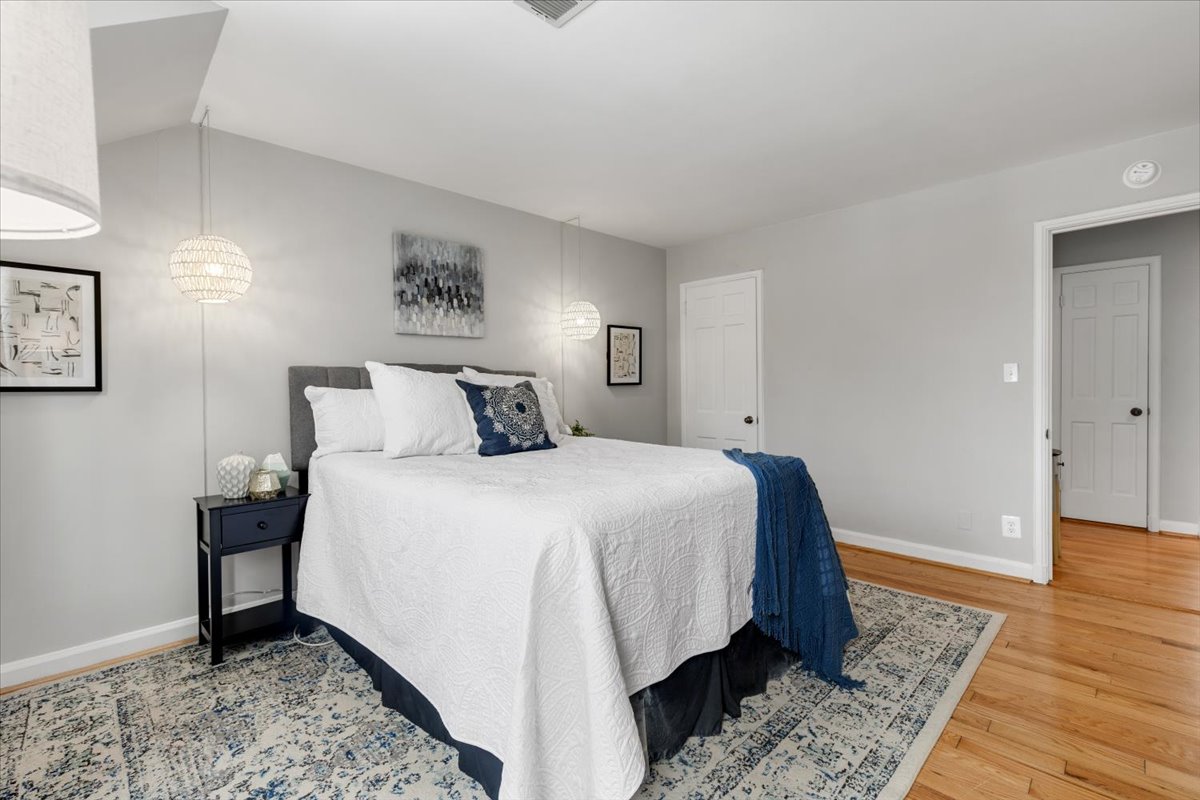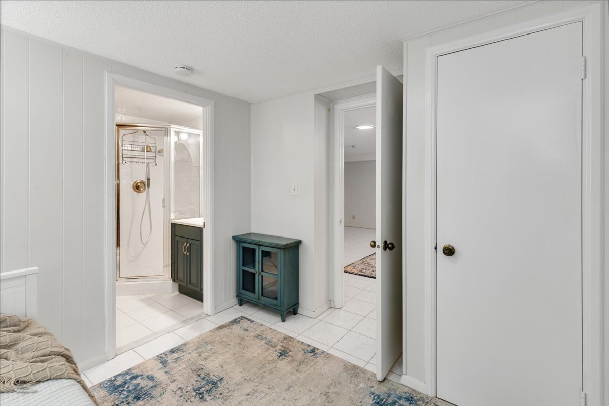Upstairs, the hallway is illuminated by a modern light fixture and features a convenient linen closet. The full bathroom is accented with tile flooring, an oversized stone-topped vanity with a large mirror, & a sparkling white walk-in shower. The spacious primary bedroom boasts two closets, including one large walk-in closet with lighting. The 2nd bedroom offers a generously sized closet & abundant natural light.