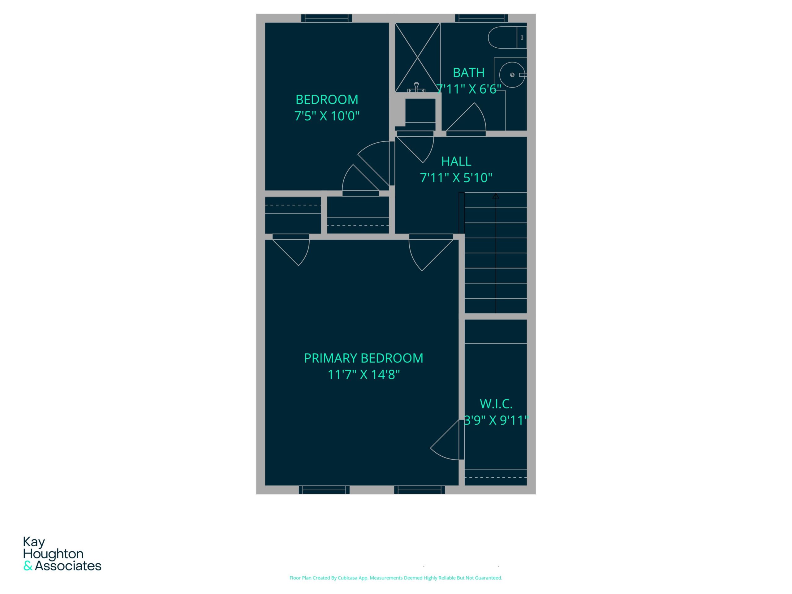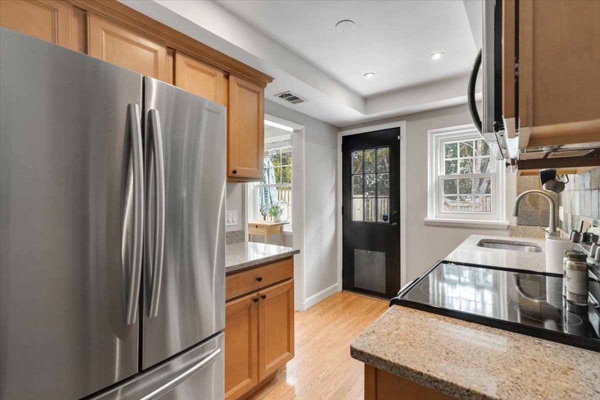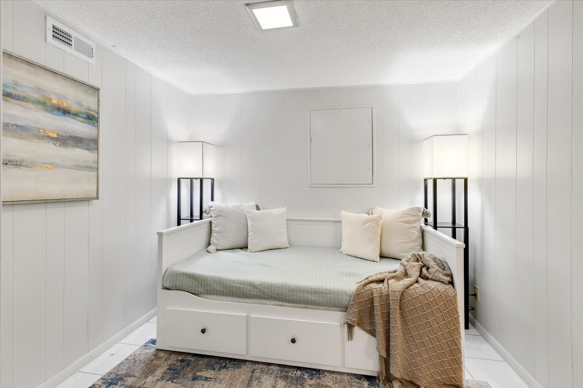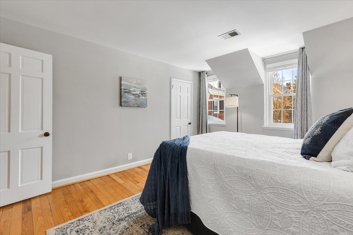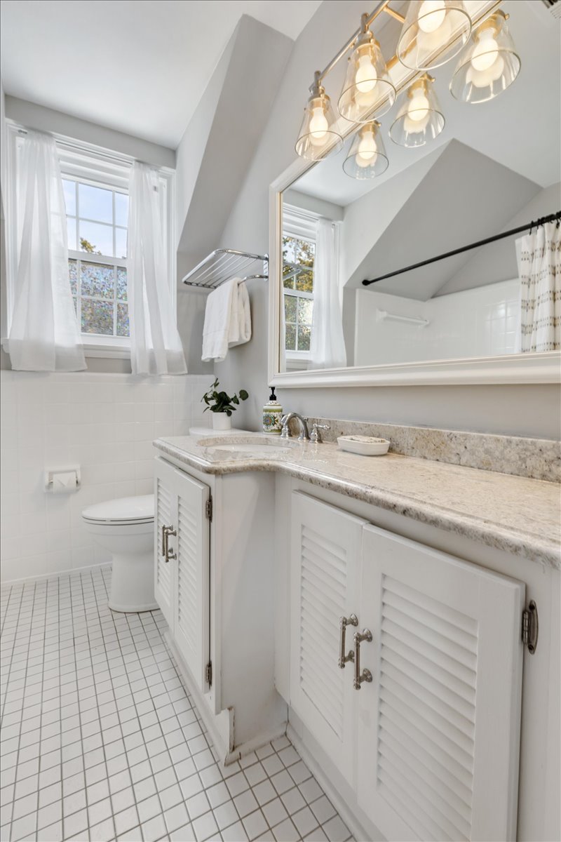 Upstairs, the hallway is illuminated by a modern light fixture and features a convenient linen closet. The full bathroom is accented with tile flooring, an oversized stone-topped vanity with a large mirror, & a sparkling white walk-in shower. The spacious primary bedroom boasts two closets, including one large walk-in closet with lighting. The 2nd bedroom offers a generously sized closet & abundant natural light.
