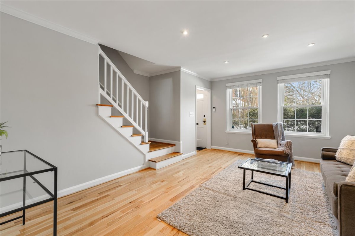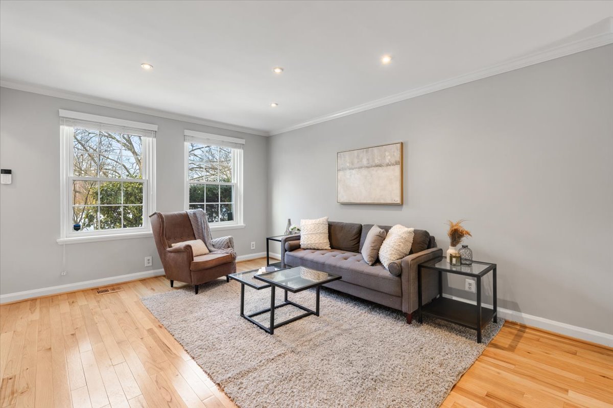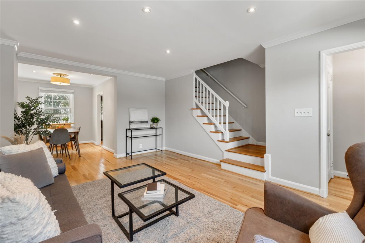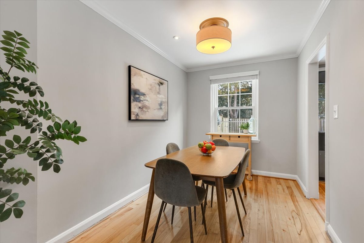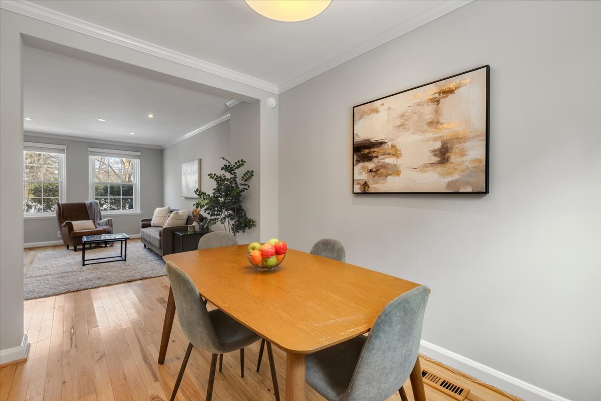 Beautiful 2-bedroom, 2-bathroom Clarendon I model townhome located in one of the most charming courts in Fairlington Glen! This home welcomes you with an entryway coat closet, gleaming hardwood floors, updated vinyl windows, dimmable recessed lighting, crown molding, & fresh, neutral paint throughout the main level. The updated kitchen features soft-close cabinetry, Silestone countertops, a tile backsplash, & stainless steel appliances including a range with a double oven! Just off the kitchen, a large back patio with updated pavers offers the perfect spot for relaxing or entertaining. The sophisticated separate dining area accented with a modern light fixture with linen shade completes this level.