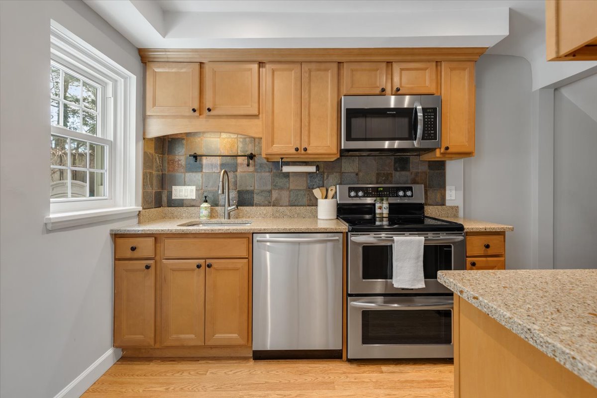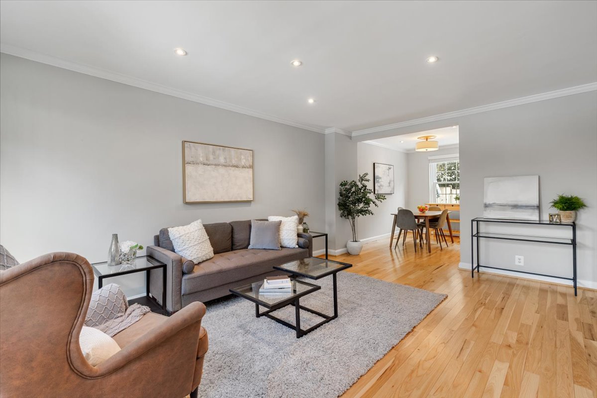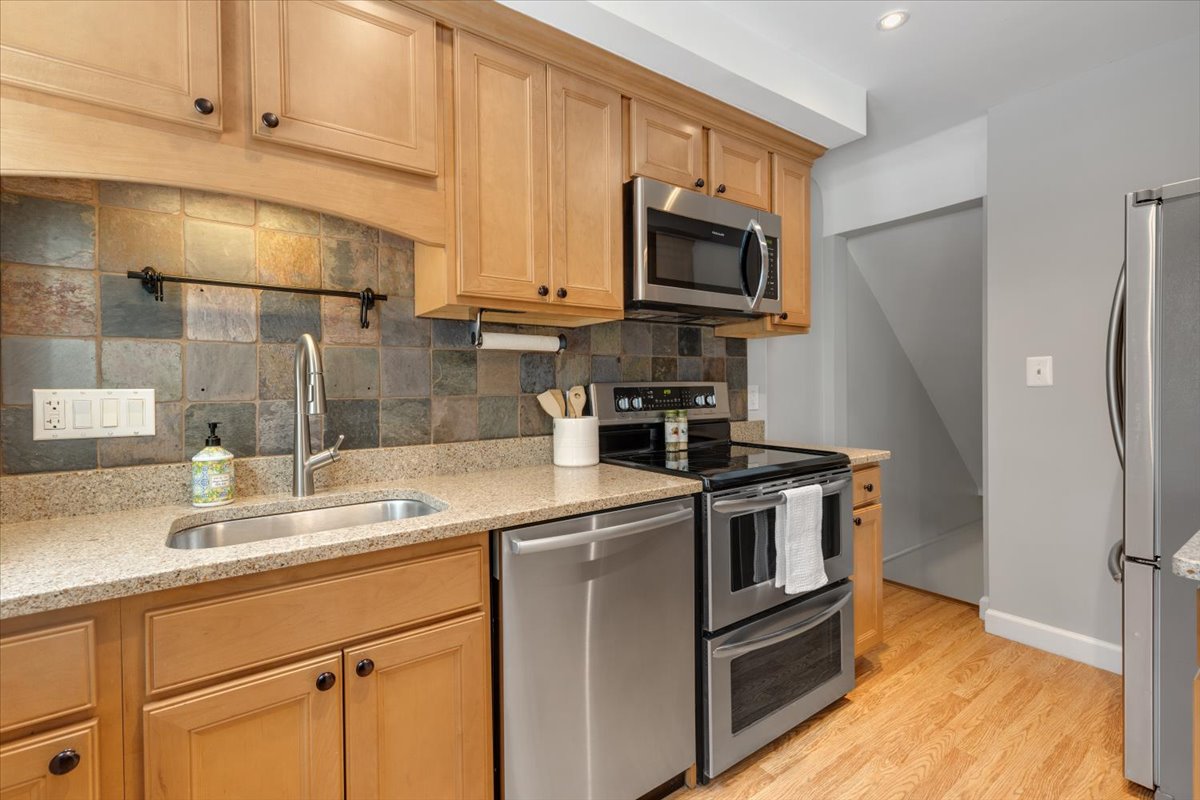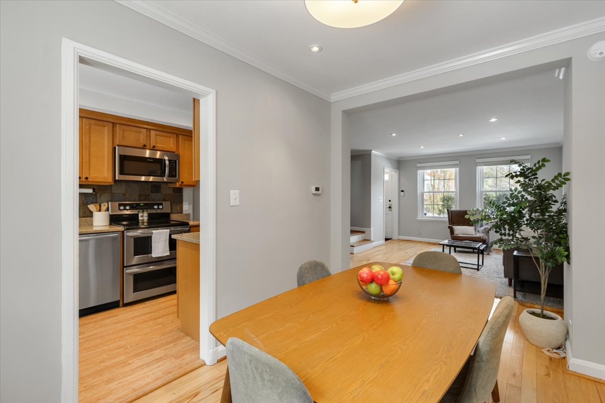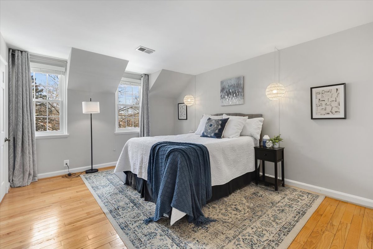 Beautiful 2-bedroom, 2-bathroom Clarendon I model townhome located in one of the most charming courts in Fairlington Glen! This home welcomes you with an entryway coat closet, gleaming hardwood floors, updated vinyl windows, dimmable recessed lighting, crown molding, & fresh, neutral paint throughout the main level. The updated kitchen features soft-close cabinetry, Silestone countertops, a tile backsplash, & stainless steel appliances including a range with a double oven! Just off the kitchen, a large back patio with updated pavers offers the perfect spot for relaxing or entertaining. The sophisticated separate dining area accented with a modern light fixture with linen shade completes this level.
