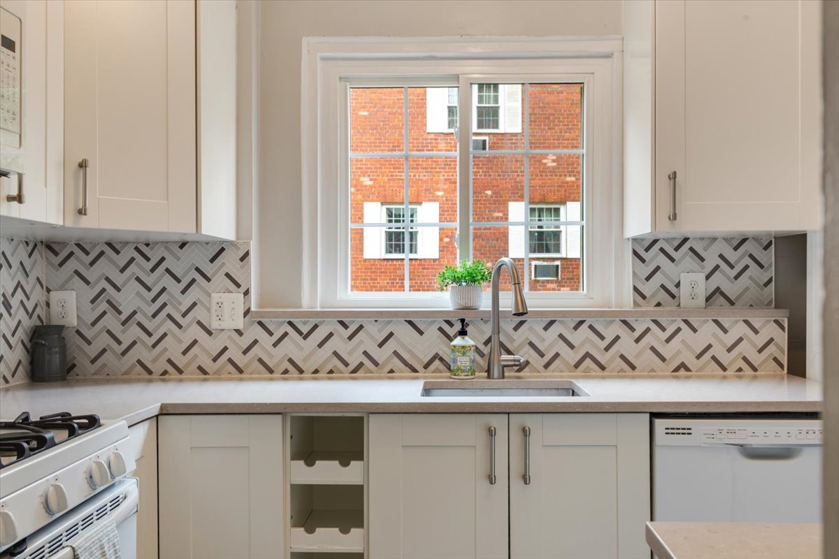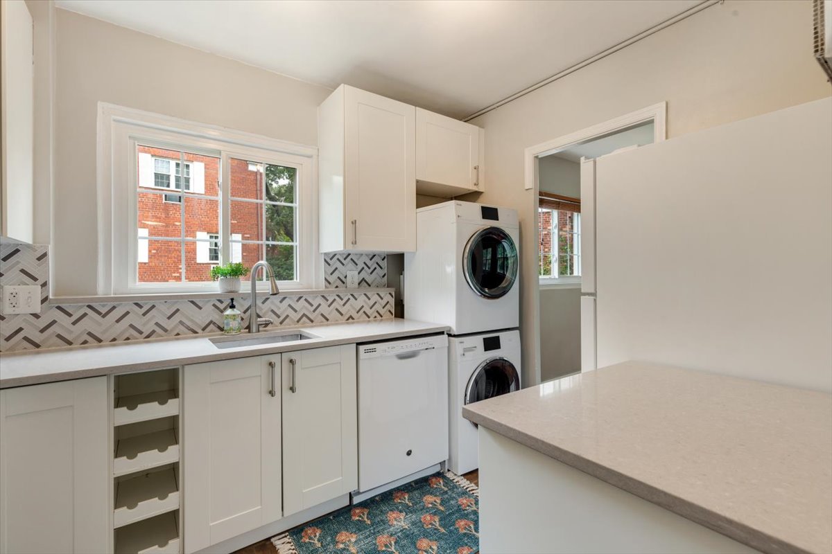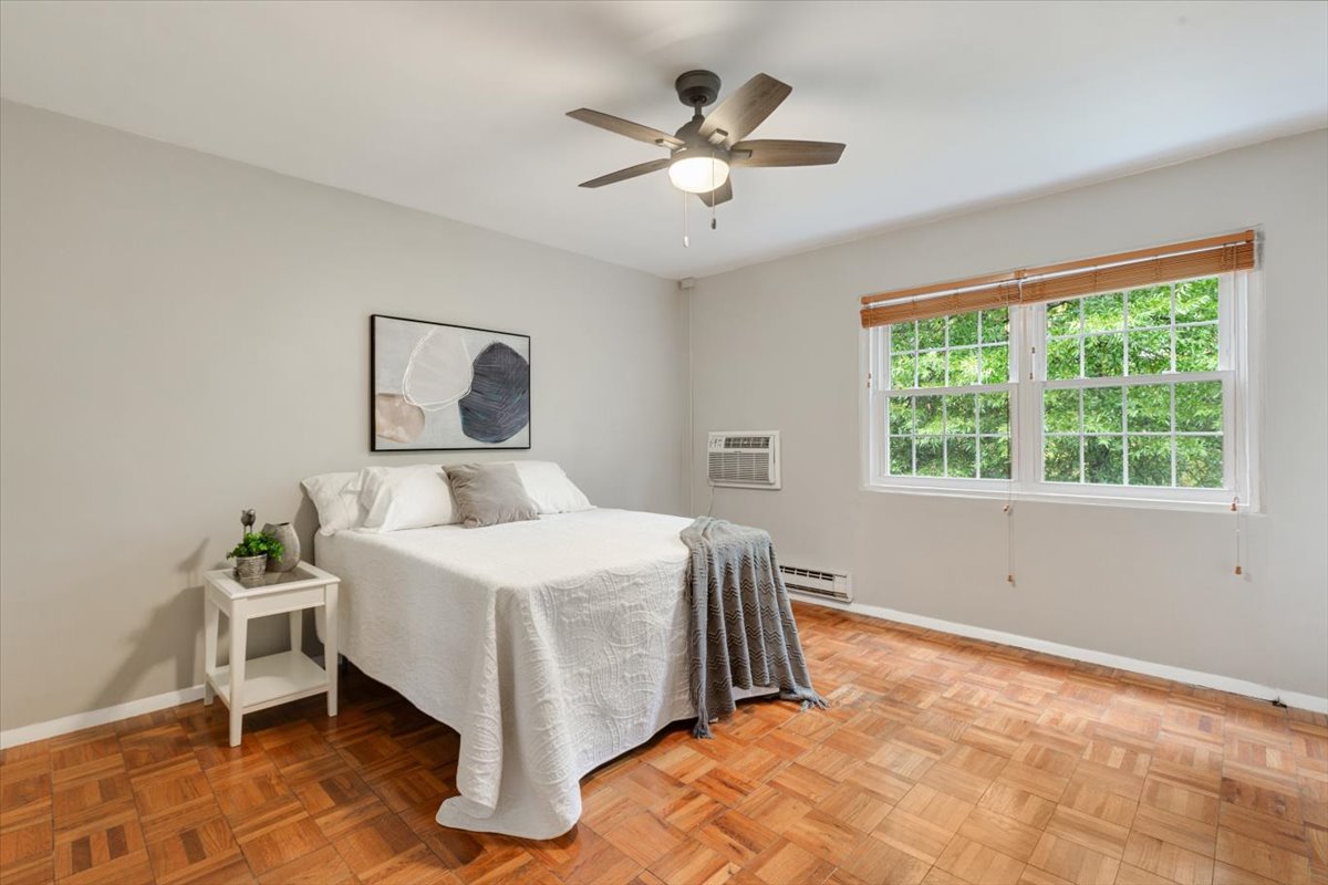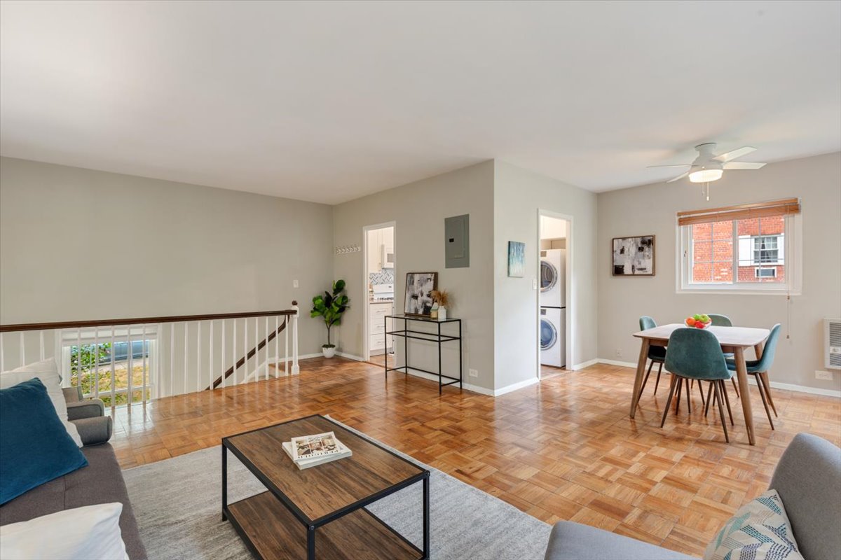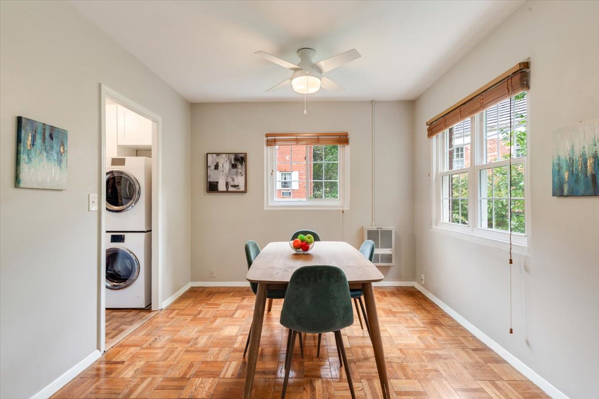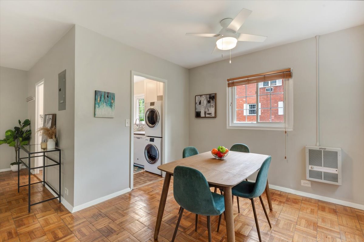 Beautiful one-bedroom Monroe model home in sought-after Parkfairfax! This light-filled home features a stairway leading up to an open floor plan with vinyl windows, hardwood flooring, & neutral paint throughout. The spacious living room is lined with large windows, allowing for tons of natural light to shine into the home. The kitchen is accented with updated white soft-close cabinetry, stone countertops, herringbone tile backsplash, & a newer stacked washer & dryer (2023). The separate dining area is accented with a ceiling fan with overhead lighting and overlooks the serene Parkfairfax grounds. The back hallway has a deep storage closet, as well as a linen closet, and leads to the incredibly spacious primary bedroom with a ceiling fan with overhead lighting & TWO closets. A full bathroom with new marble-inspired LVP flooring, a pedestal sink, a medicine cabinet mirror, & a sparkling white tiled shower completes this home. Parkfairfax amenities include 3 swimming pools, 2 volleyball courts, a basketball court, 7 tennis courts, an exercise facility, tot lots, a party room, a car wash/maintenance yard, laundry rooms, & walking trails! This home is in a PRIME location – close to I-395, the shops & restaurants of The Village at Shirlington, and just a short drive to Del Ray, Old Town, & DC!