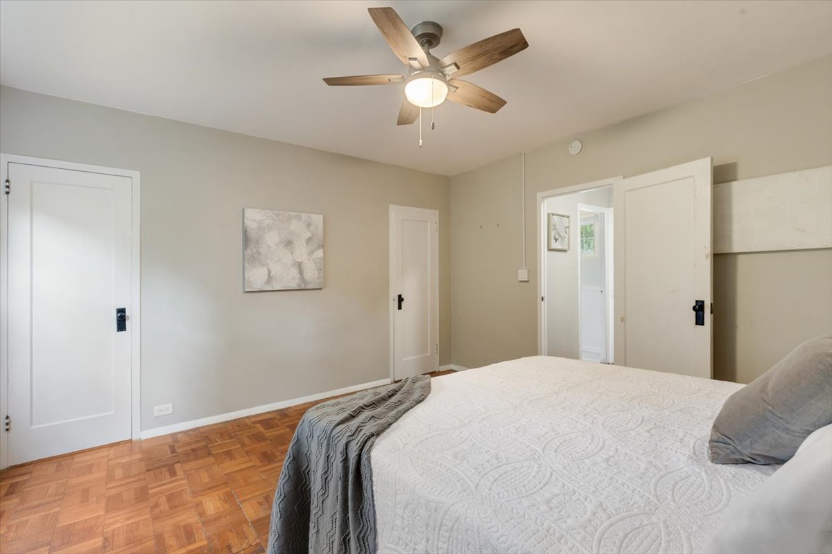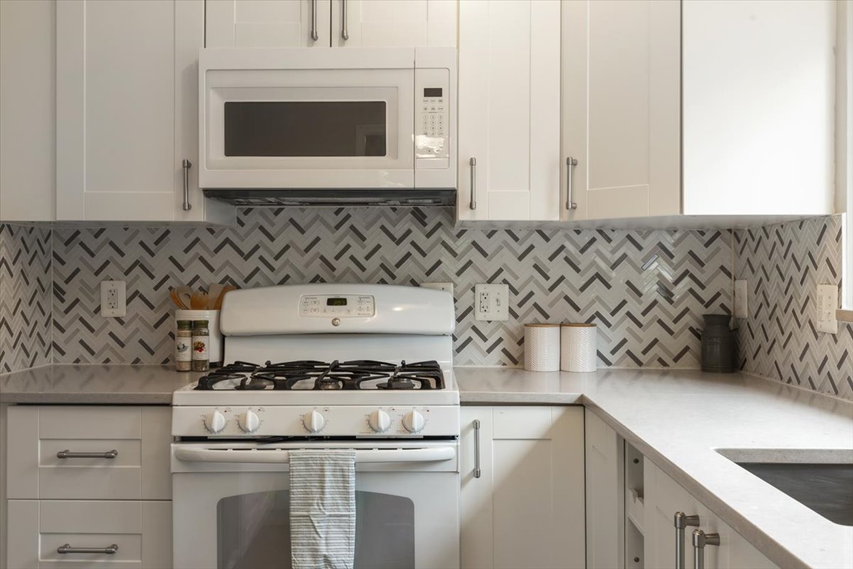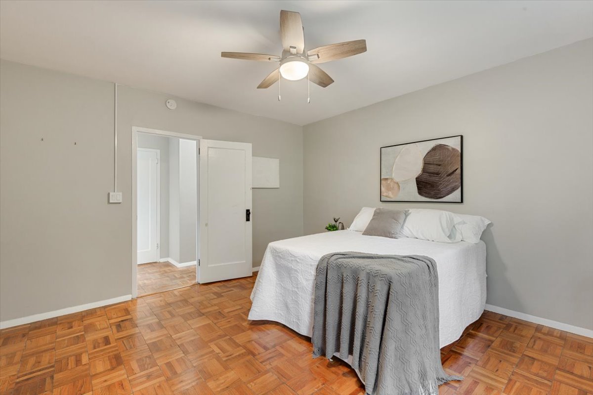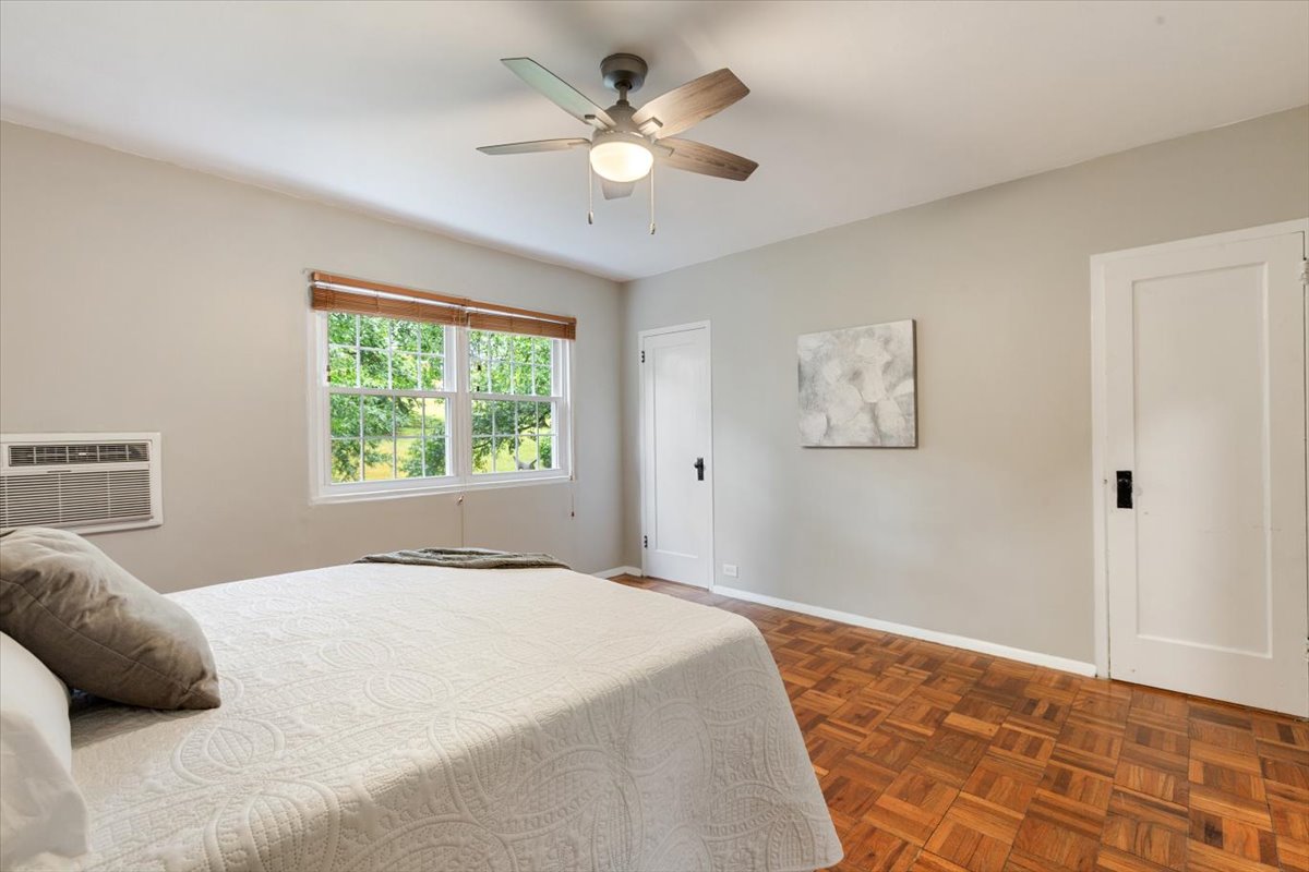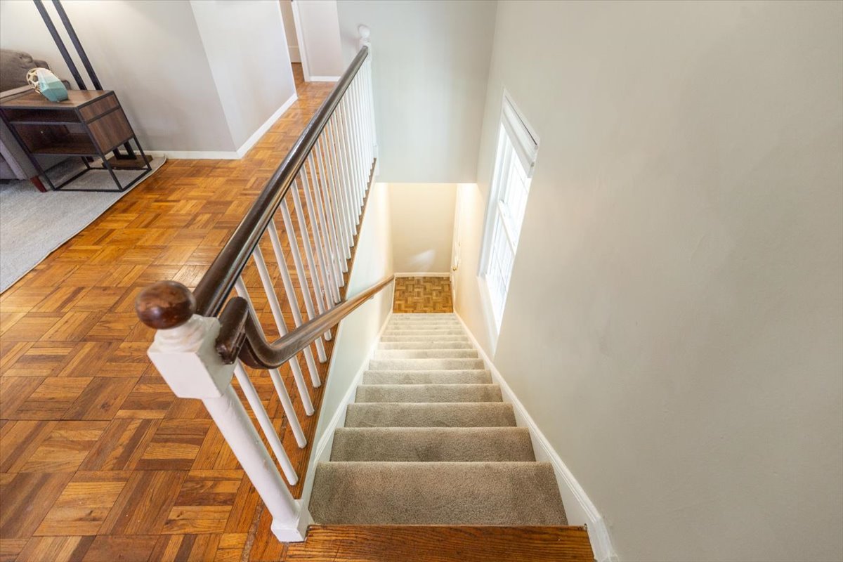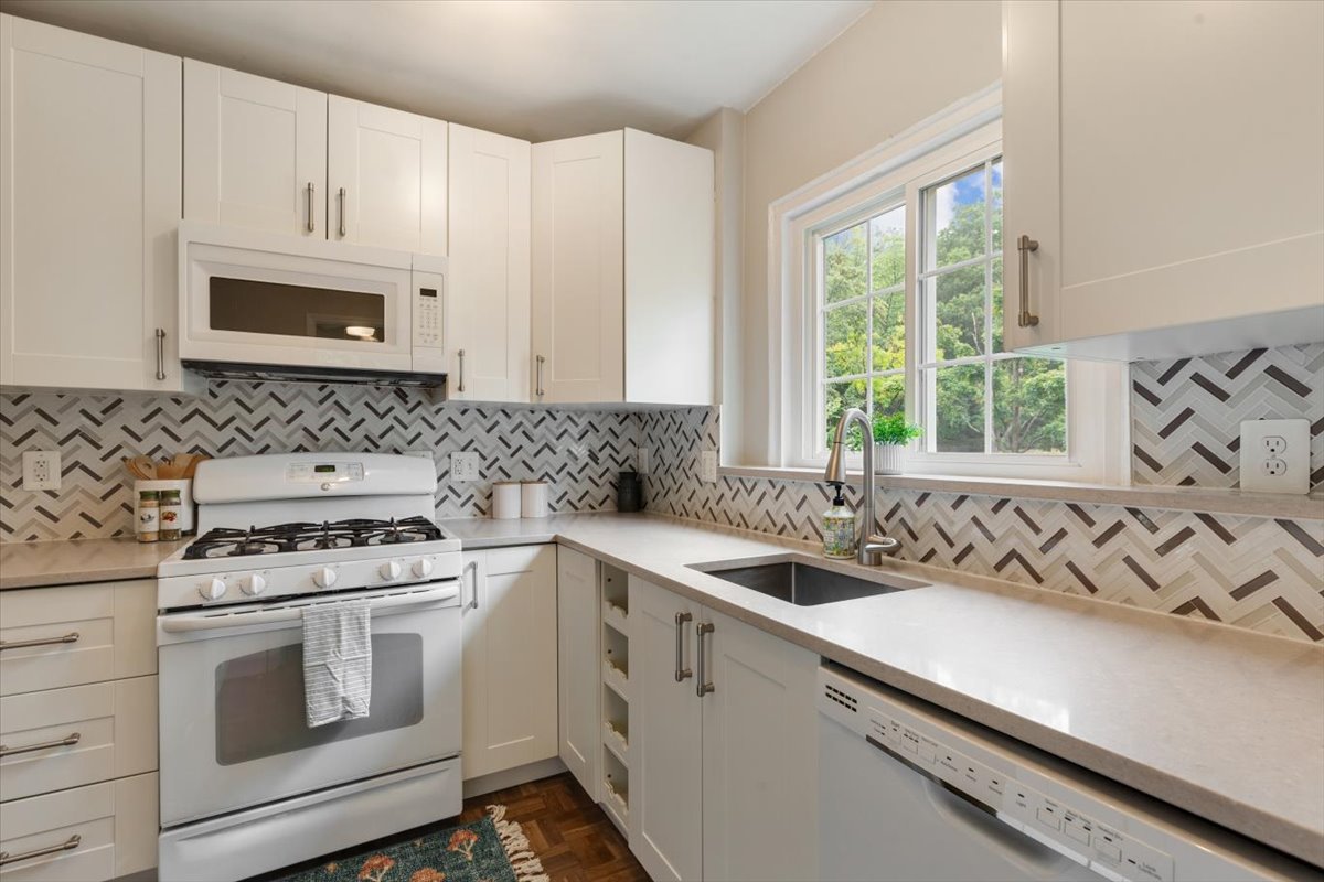 Beautiful one-bedroom Monroe model home in sought-after Parkfairfax! This light-filled home features a stairway leading up to an open floor plan with vinyl windows, hardwood flooring, & neutral paint throughout. The spacious living room is lined with large windows, allowing for tons of natural light to shine into the home. The kitchen is accented with updated white soft-close cabinetry, stone countertops, herringbone tile backsplash, & a newer stacked washer & dryer (2023). The separate dining area is accented with a ceiling fan with overhead lighting and overlooks the serene Parkfairfax grounds. The back hallway has a deep storage closet, as well as a linen closet, and leads to the incredibly spacious primary bedroom with a ceiling fan with overhead lighting & TWO closets. A full bathroom with new marble-inspired LVP flooring, a pedestal sink, a medicine cabinet mirror, & a sparkling white tiled shower completes this home. Parkfairfax amenities include 3 swimming pools, 2 volleyball courts, a basketball court, 7 tennis courts, an exercise facility, tot lots, a party room, a car wash/maintenance yard, laundry rooms, & walking trails! This home is in a PRIME location – close to I-395, the shops & restaurants of The Village at Shirlington, and just a short drive to Del Ray, Old Town, & DC!