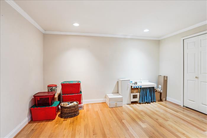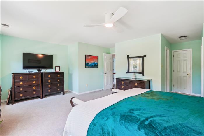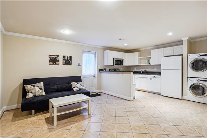 Upstairs, the primary suite includes plush carpeting, modern ceiling fan with overhead lighting, a walk-in closet, and an en-suite bathroom with dual stone-topped vanity, a soaking tub, & a separate shower. Three additional carpeted bedrooms with overhead lighting share a full hall bathroom with vanity & tiled shower. The finished lower level boasts a large laundry area with full-sized stacked washer & dryer and a bonus room with recessed lighting & a closet – perfect for guests, a home office, or workout room. The lower level also adds flexibility with its own private entrance, a large recreation room, separate full kitchen with its own full-sized washer & dryer, a fifth bedroom, a full bath, & plenty of storage. Outside, there’s a detached two-car garage, a solar power car charger, a fully fenced backyard, and a large driveway for extra parking. The location offers quick access to Columbia Pike, Route 50, and Glebe Road, making commutes to National Landing, the Pentagon, and DC easy. Nearby parks, shops, and dining options make this a convenient and comfortable place to call home.