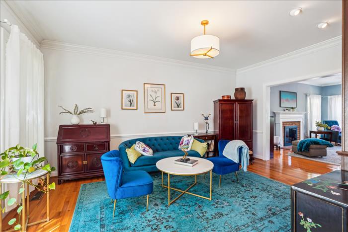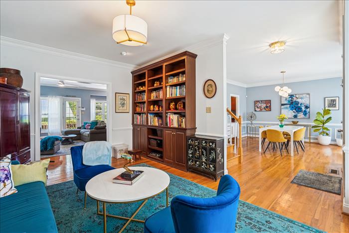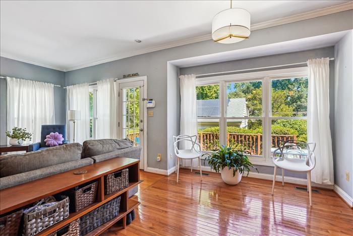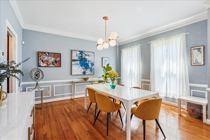 Spacious 5 bedroom, 3.5 bathroom colonial home in the quiet and convenient Alcova Heights neighborhood of Arlington! This three-level home offers over 3,500 sq ft of living space with a practical layout and contemporary updates. The light-filled main level features gleaming hardwood floors, crown molding, & abundant windows throughout. Upon entry you will be greeted by the formal living room with built-in bookcase & the formal dining room with modern chandelier. The open eat-in kitchen is accented with ample cabinetry, granite countertops, stainless steel appliances, & a center island with pendant lighting. Just off the kitchen is a bright family room with a gas fireplace and direct access to a large rear deck – perfect for outdoor dining or relaxing. A powder room with vanity & modern light fixture completes this level.