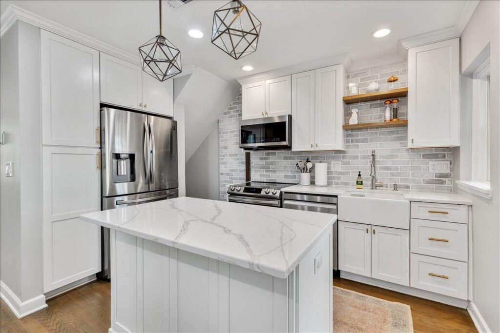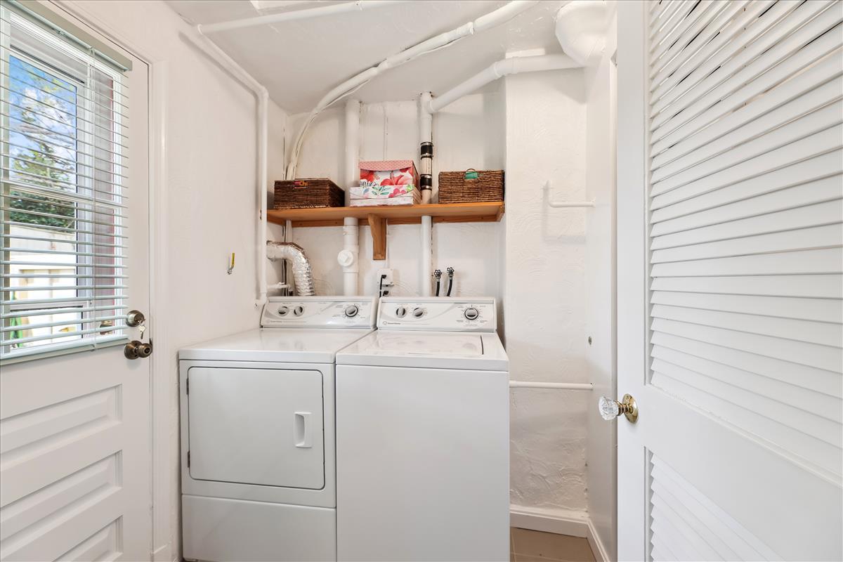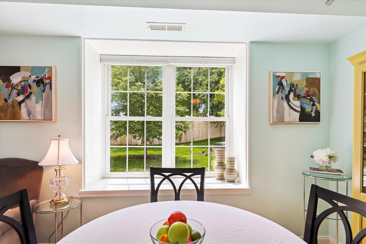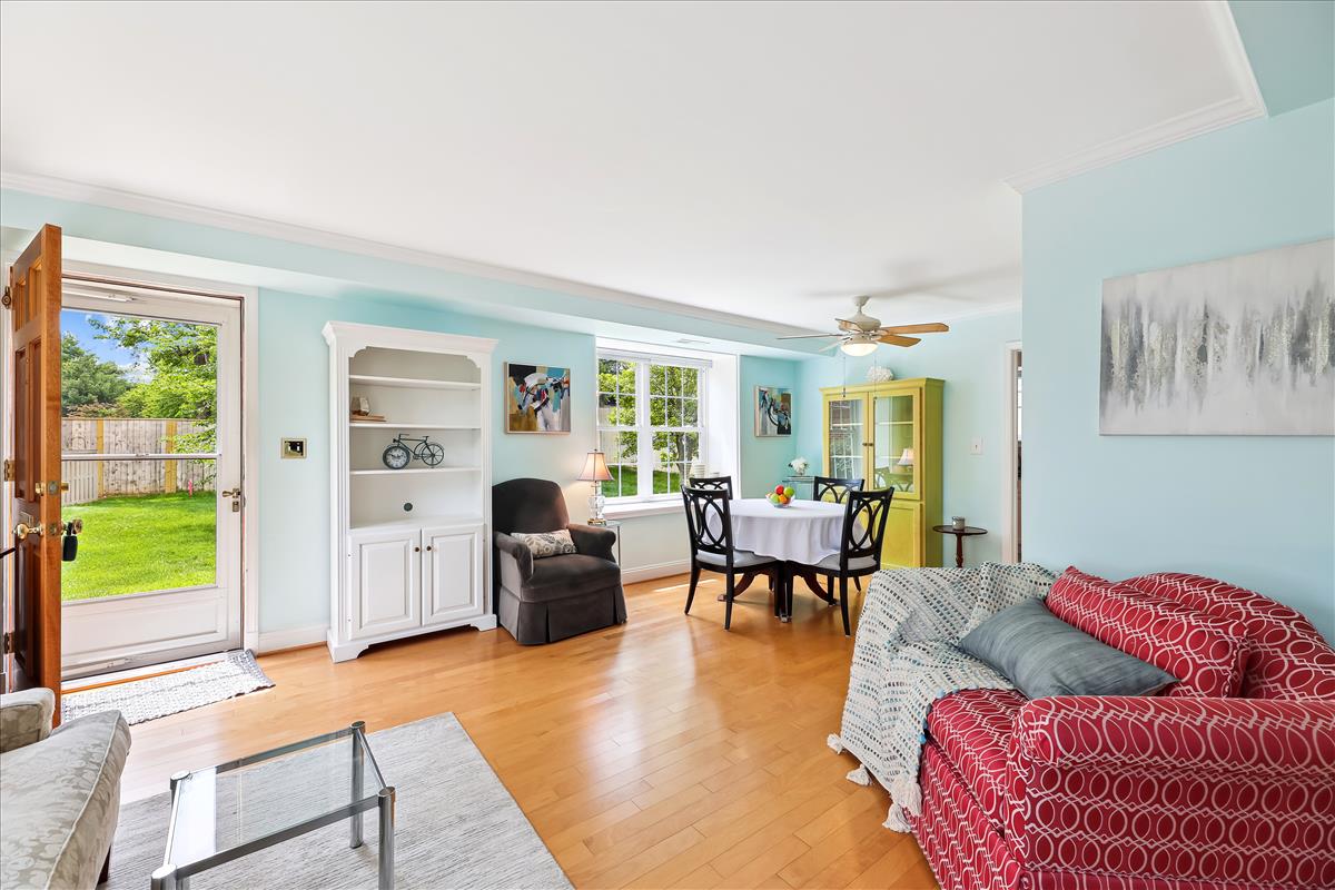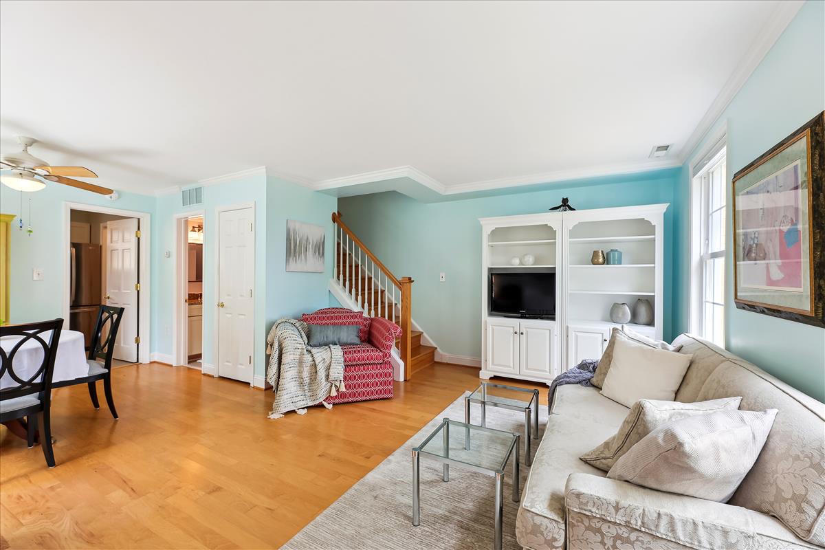 Lovely 2 bedroom, 1.5 bathroom end-unit townhome in sought-after Fairlington Towne! The open living room & separate dining area boast plenty of natural light, gleaming hardwood floors, crown molding, a beautiful bay window, and a ceiling fan. The remodeled kitchen features ample white cabinetry with modern pulls & soft-close drawers, gray tile flooring, granite countertops, a mosaic tile backsplash, & stainless steel appliances including a newer refrigerator (2022) and microwave (2021). The large window over the sink overlooks the private & serene bricked back patio – perfect for relaxing on a warm summer day! The laundry nook, near the back door, includes a full-sized washer/dryer & overhead shelving for storage. A coat closet and a half bathroom with a spacious granite-topped vanity & storage nook complete this level.