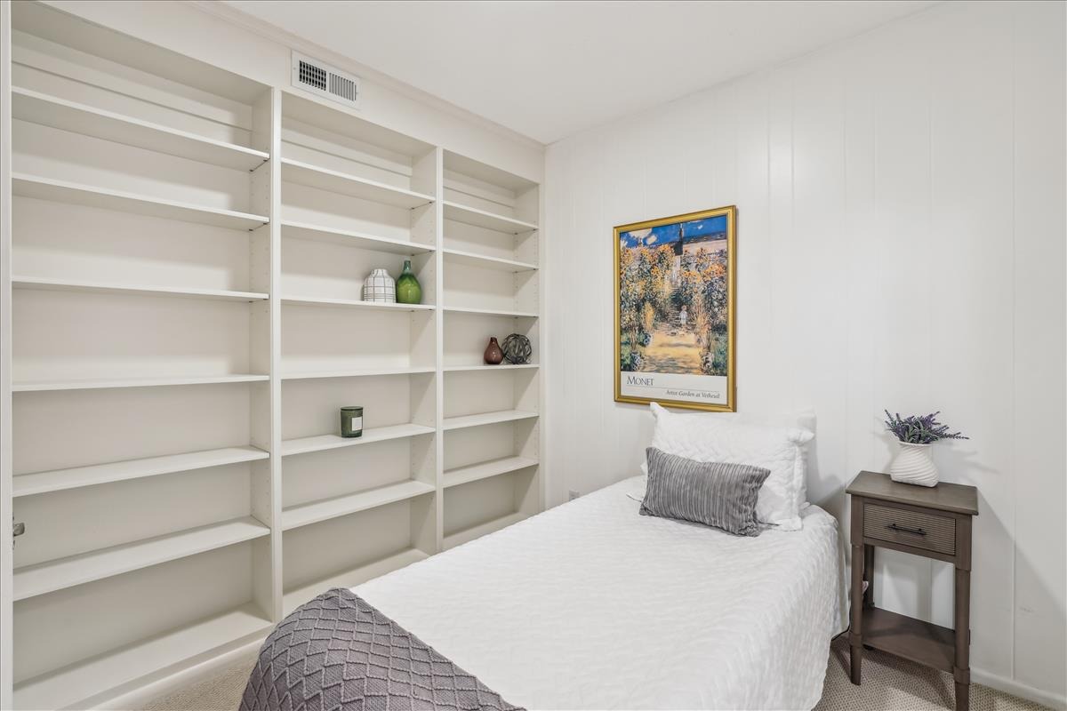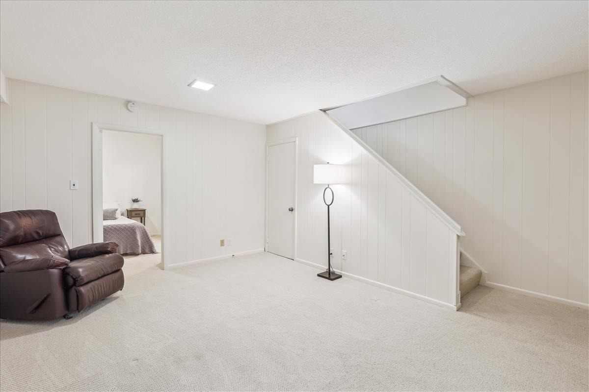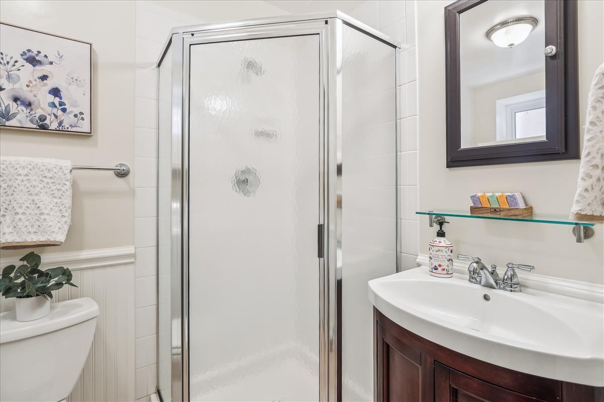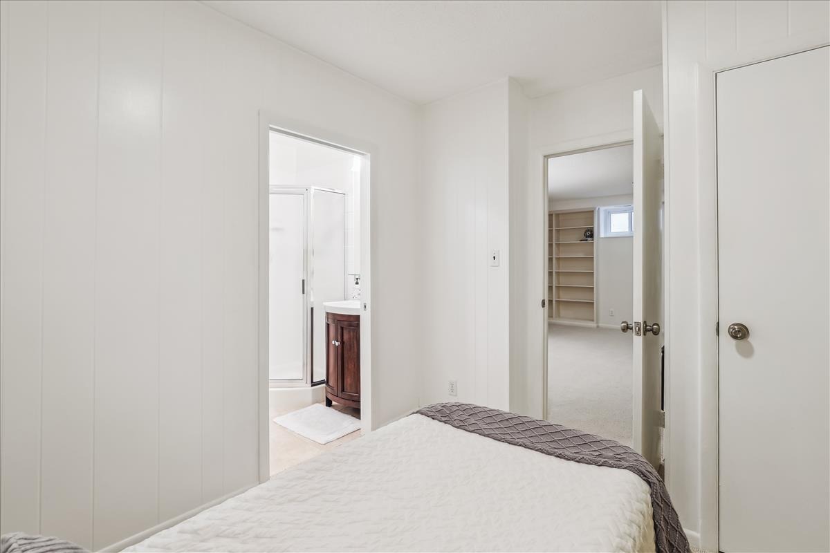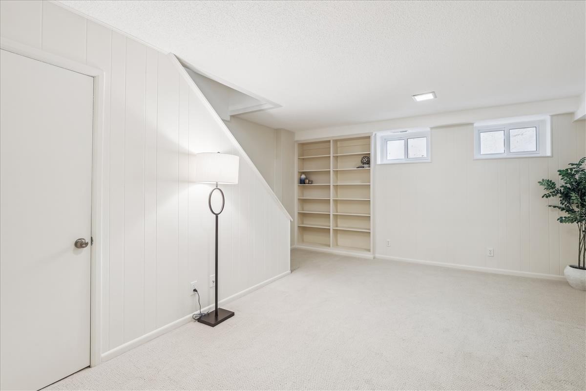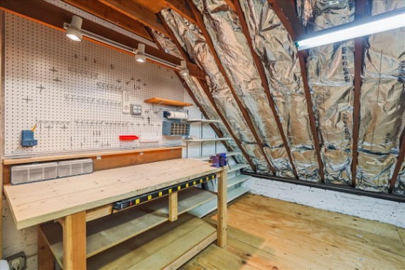 The upper level features a spacious primary bedroom with crown molding, a ceiling fan, and two closets including a large walk-in. The 2nd bedroom also features crown molding and generous natural light. A bathroom with classic white hexagon tile flooring, an oversized stone-topped vanity, vinyl window shutters, and a sparkling white subway-tiled shower with niche shelving completes this level. The lower level offers tall ceilings, plush carpeting (2023), overhead lighting, and built-in bookshelves throughout the large recreation room and versatile bonus room – ideal for guests, a home office, or workout space. A 2nd full bathroom with tile flooring, an upgraded vanity, a sparkling white tiled corner shower, and a laundry nook with a full-size washer and dryer & overhead cabinetry completes this level. This home also boasts a huge floored attic with abundant storage space and its very own workshop – complete with workbench, peg board, & ample lighting.