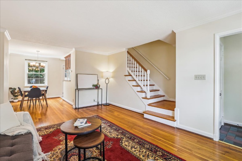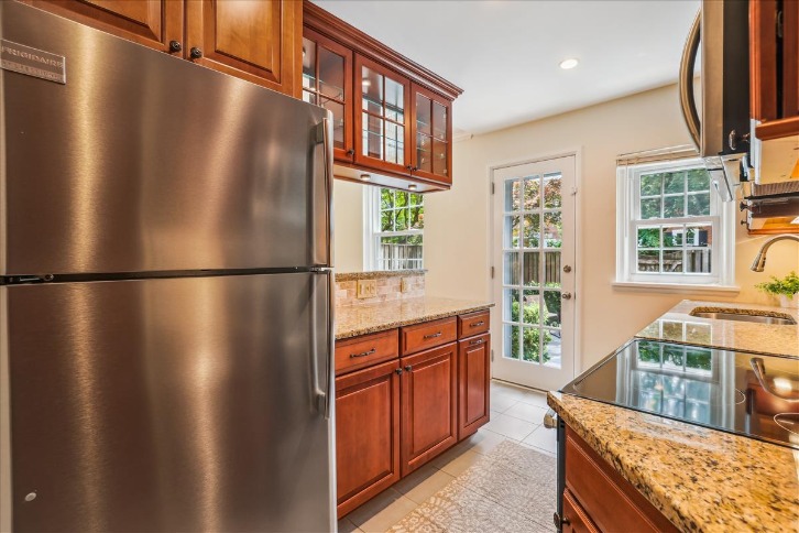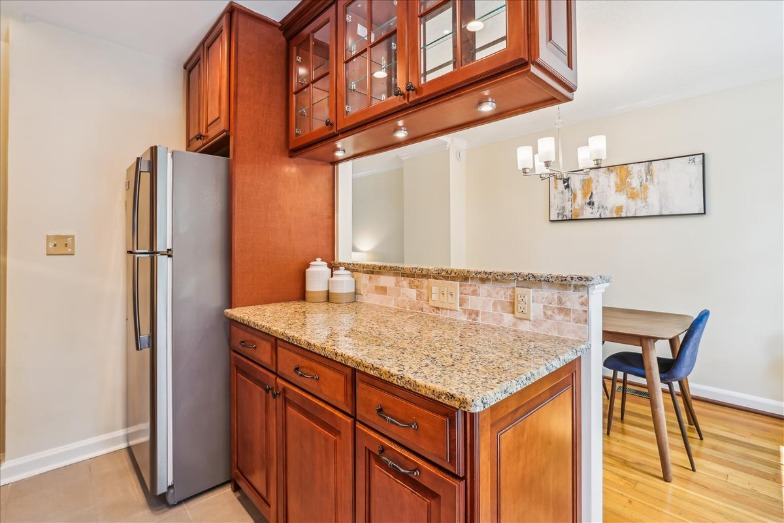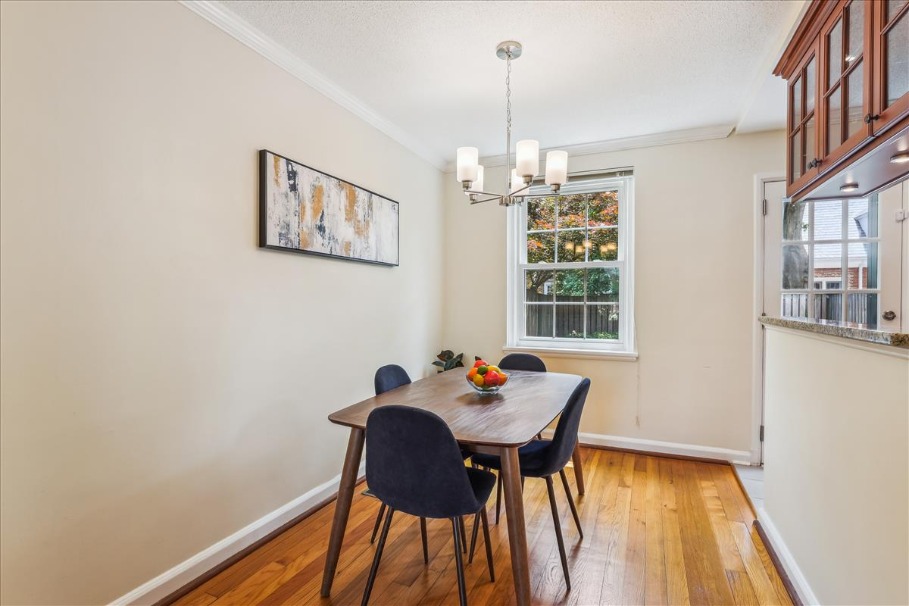 Beautiful 2-bedroom, 2-bathroom Clarendon I model townhome nestled in Fairlington Glen! This charming and thoughtfully updated home offers a tiled entryway and convenient coat closet. Gleaming hardwood floors flow throughout the open living room and dining area, where a brand-new chandelier adds a touch of elegance. The partially open kitchen features tile flooring, recessed lighting, soft-close custom cabinetry with under-cabinet, granite countertops, tile backsplash, and stainless steel appliances. A set of French doors opens to a beautifully landscaped paver patio – perfect for relaxing, entertaining, or enjoying a quiet morning outdoors.