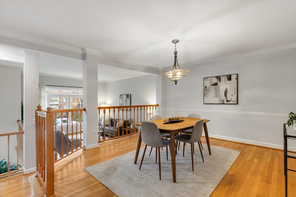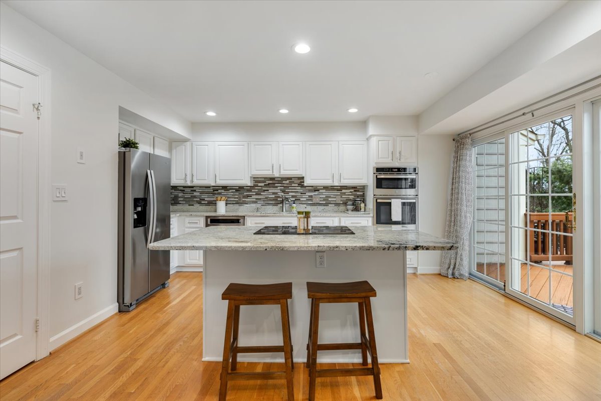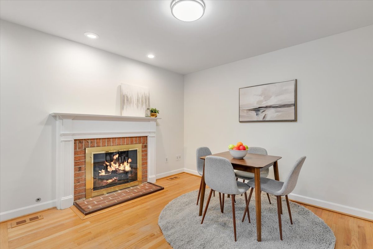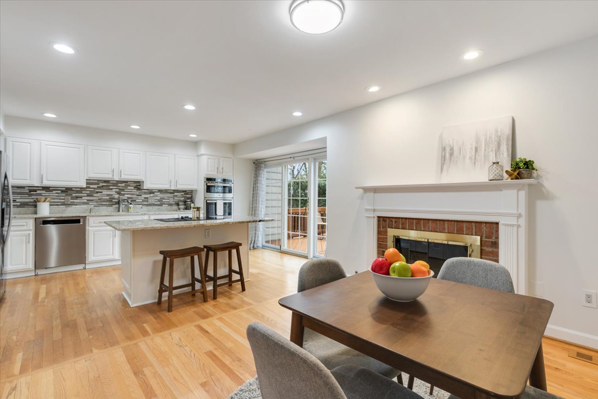 Beautiful 3-bedroom, 2-full bath, 2-half bath townhome in the sought-after Barcroft neighborhood of South Arlington! Gleaming hardwood floors, crown molding, soaring ceilings, & abundant natural light welcome you inside. The main level features a bright living room with a large window overlooking the neighborhood, a spacious dining room with chair rail detailing & chandelier, & an impressive eat-in kitchen with white cabinetry, granite countertops, mosaic tile backsplash, stainless steel appliances including a newer double oven with built-in microwave (2023) and dishwasher (2023), a large island with electric cooktop & seating, a pantry, & a cozy gas fireplace in the breakfast nook. A sliding glass door opens to a spacious deck overlooking lush, community-maintained green space – perfect for relaxing or entertaining. A convenient powder room completes this level.