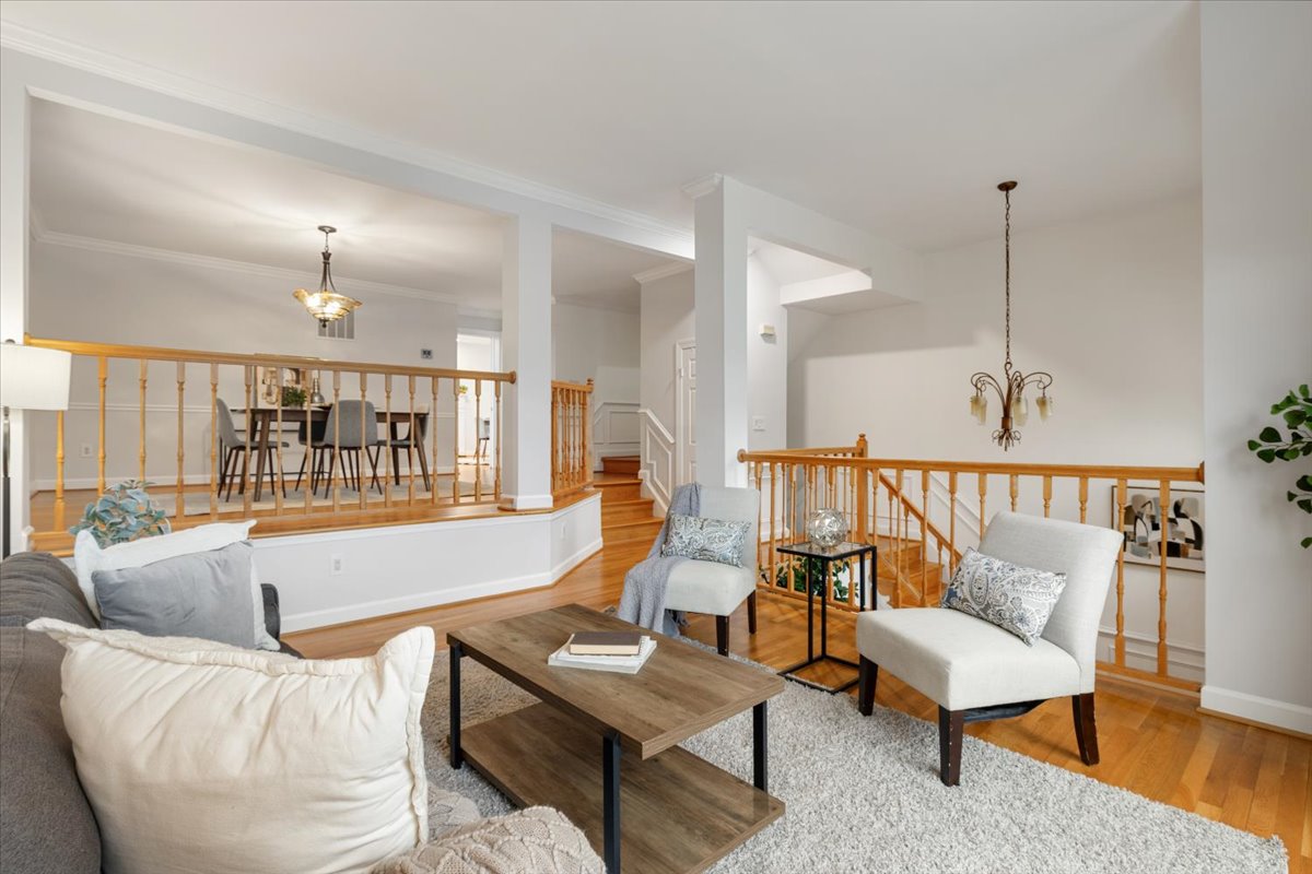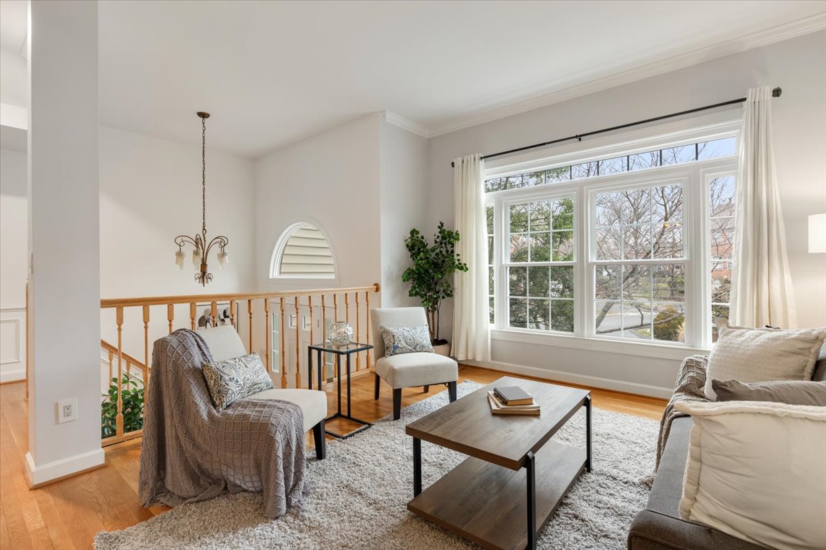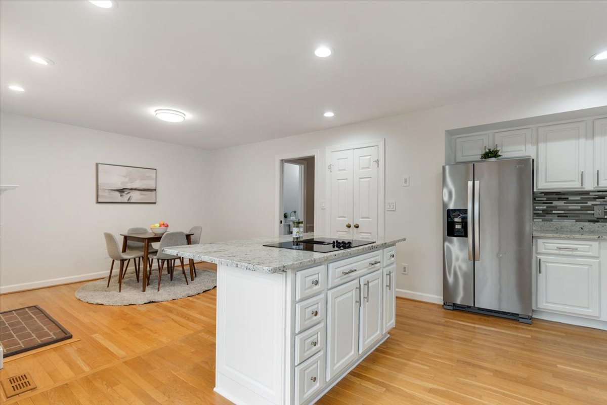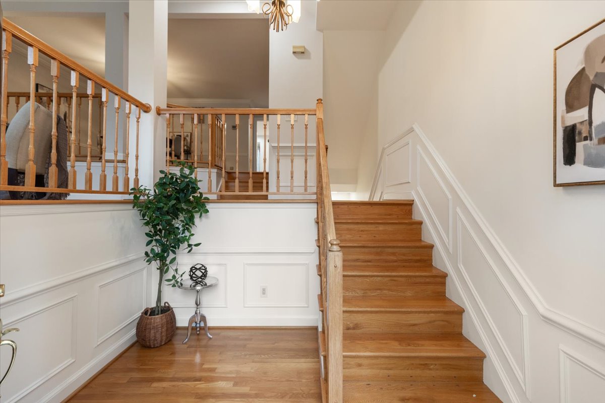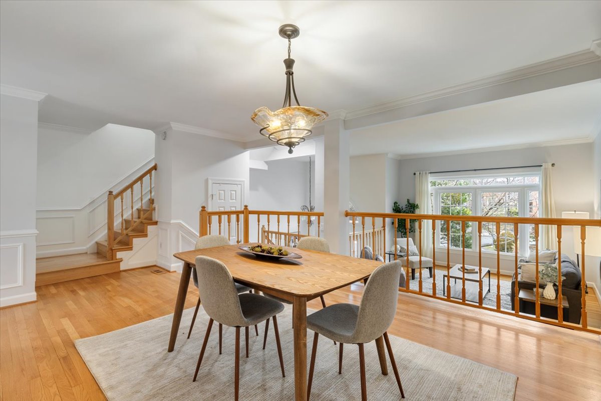 Beautiful 3-bedroom, 2-full bath, 2-half bath townhome in the sought-after Barcroft neighborhood of South Arlington! Gleaming hardwood floors, crown molding, soaring ceilings, & abundant natural light welcome you inside. The main level features a bright living room with a large window overlooking the neighborhood, a spacious dining room with chair rail detailing & chandelier, & an impressive eat-in kitchen with white cabinetry, granite countertops, mosaic tile backsplash, stainless steel appliances including a newer double oven with built-in microwave (2023) and dishwasher (2023), a large island with electric cooktop & seating, a pantry, & a cozy gas fireplace in the breakfast nook. A sliding glass door opens to a spacious deck overlooking lush, community-maintained green space – perfect for relaxing or entertaining. A convenient powder room completes this level.