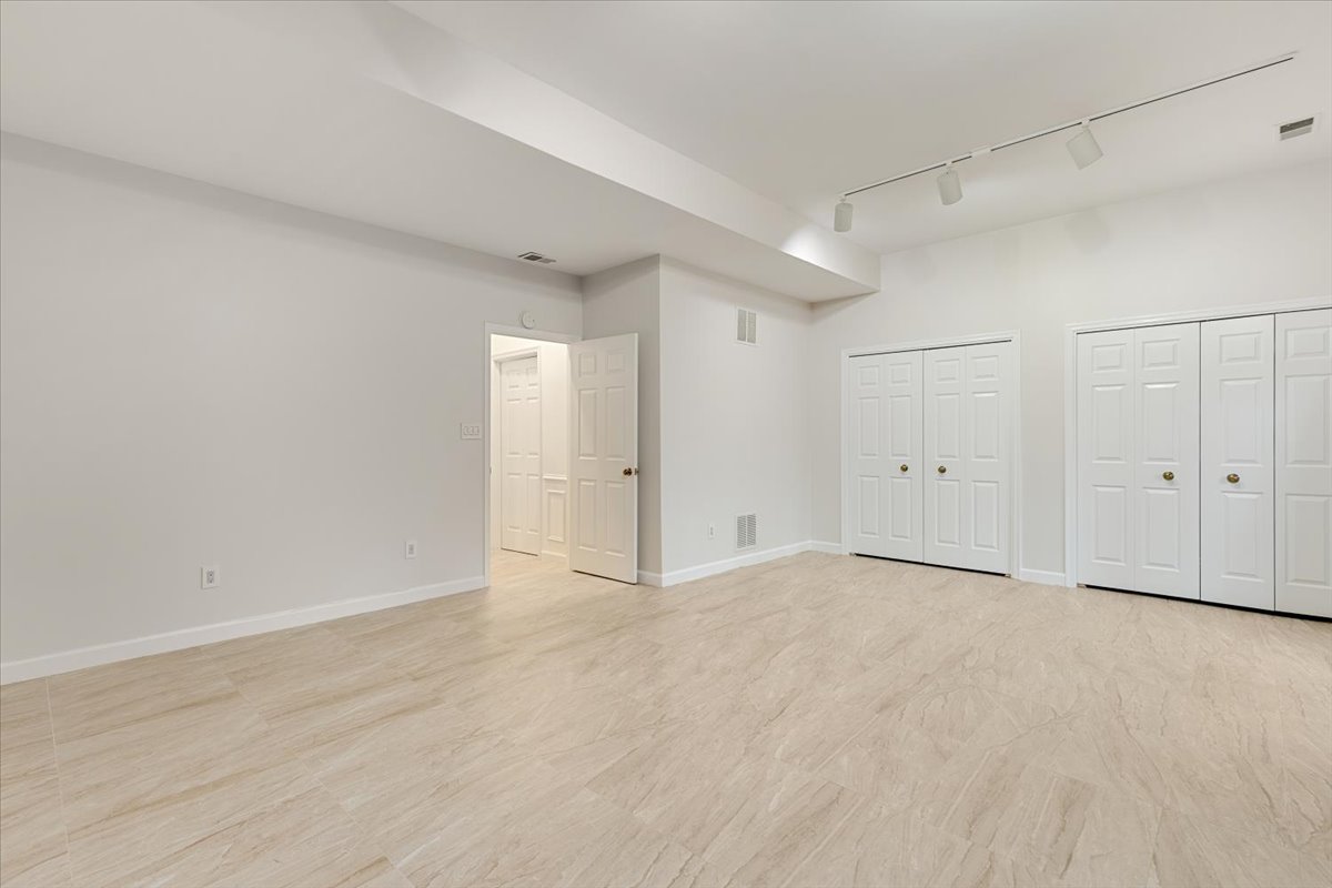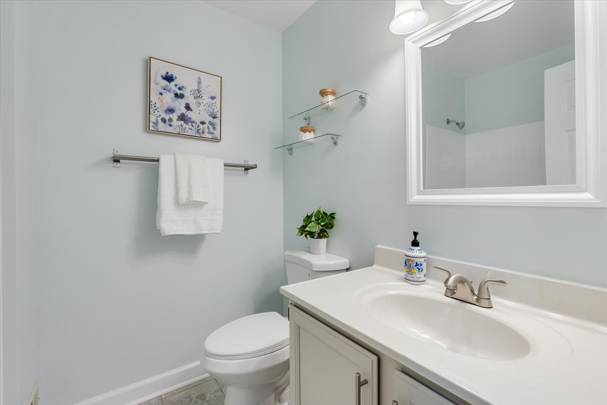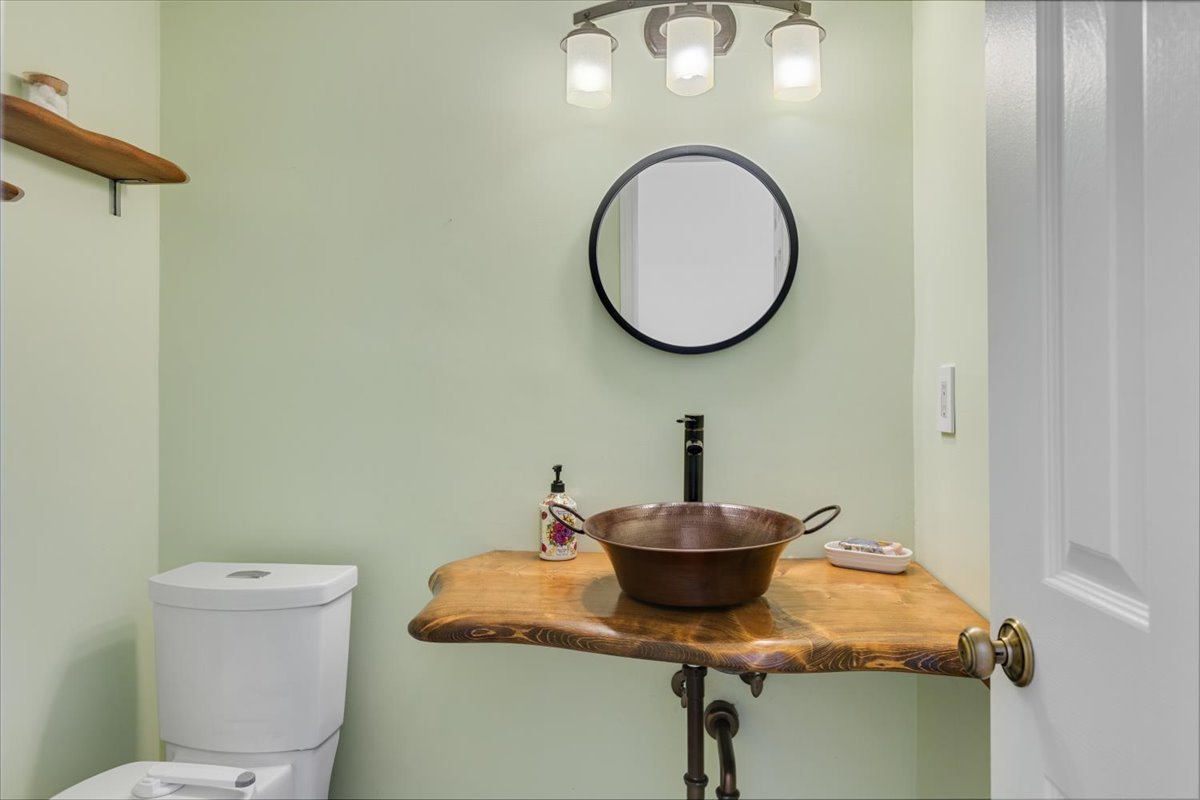 The lower level boasts oversized tile flooring & soaring ceilings throughout the recreation room with gas fireplace, overhead lighting, & wall-to-wall closets. This is an amazing second living space and works perfectly for guests! A stylish half bath with floating live-edge wood countertop and vessel sink, plus a laundry/utility room with full-size washer, dryer, & extra refrigerator, add convenience. French doors lead to a fully fenced lower deck with built-in bench & stairs to the upper deck – your own private outdoor retreat.