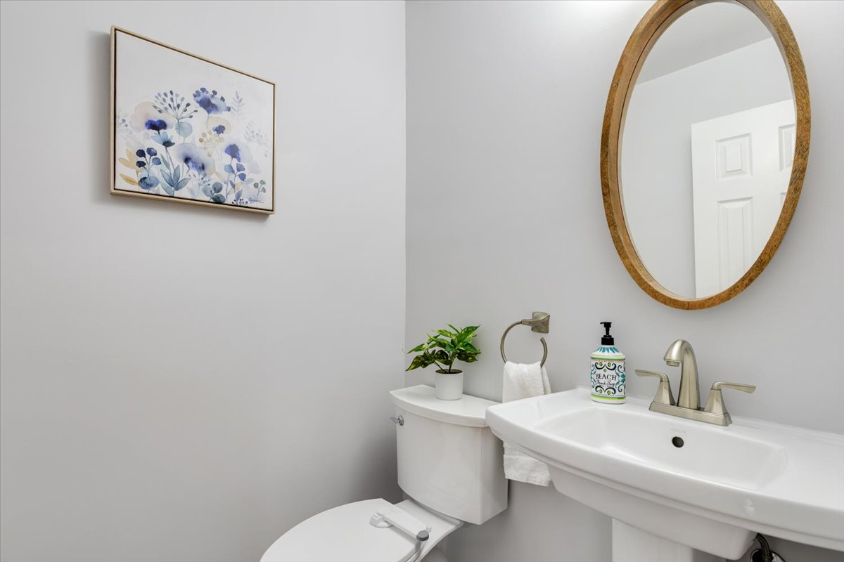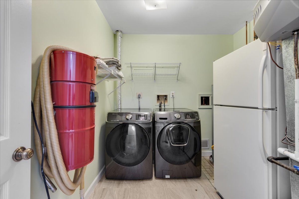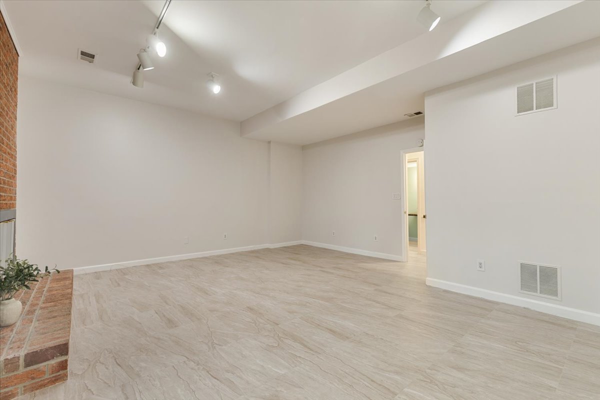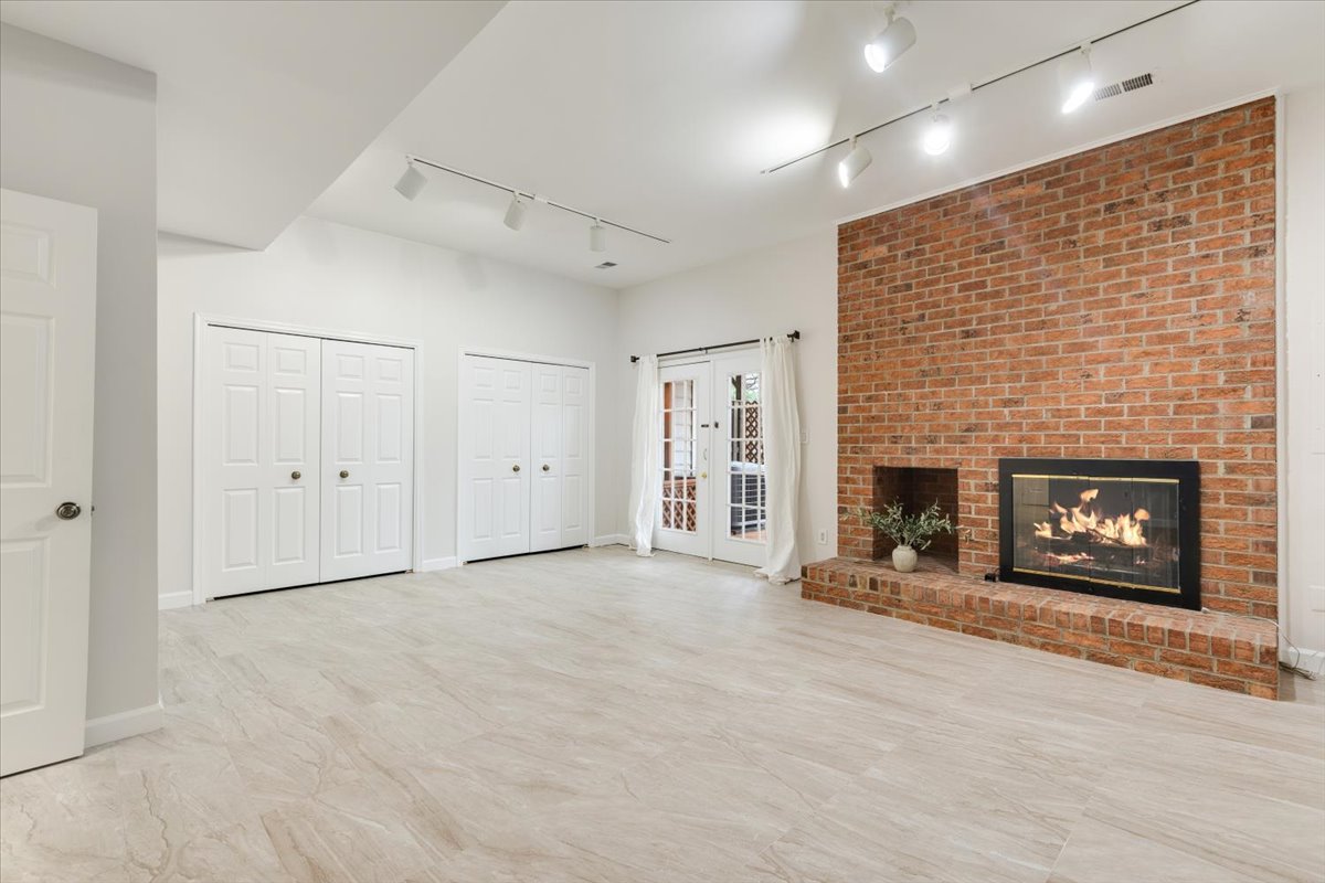 The lower level boasts oversized tile flooring & soaring ceilings throughout the recreation room with gas fireplace, overhead lighting, & wall-to-wall closets. This is an amazing second living space and works perfectly for guests! A stylish half bath with floating live-edge wood countertop and vessel sink, plus a laundry/utility room with full-size washer, dryer, & extra refrigerator, add convenience. French doors lead to a fully fenced lower deck with built-in bench & stairs to the upper deck – your own private outdoor retreat.