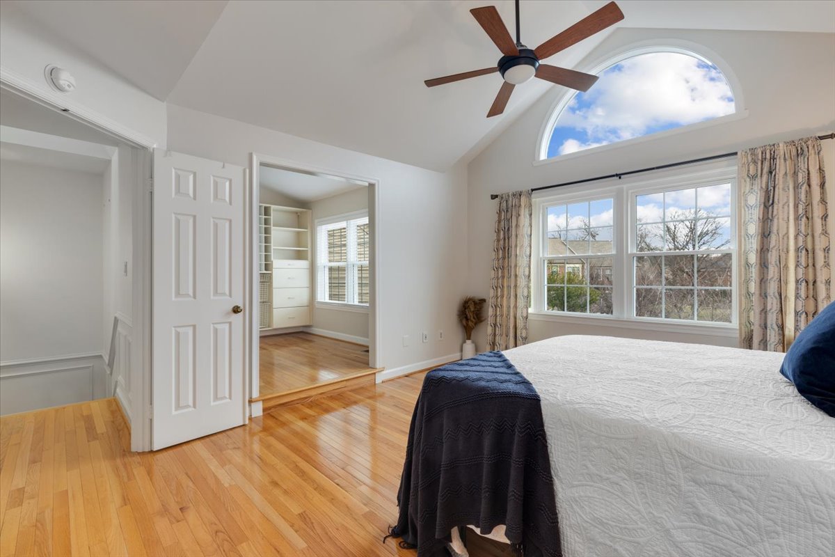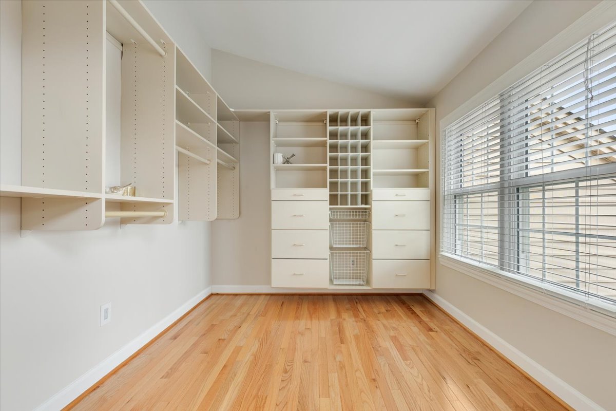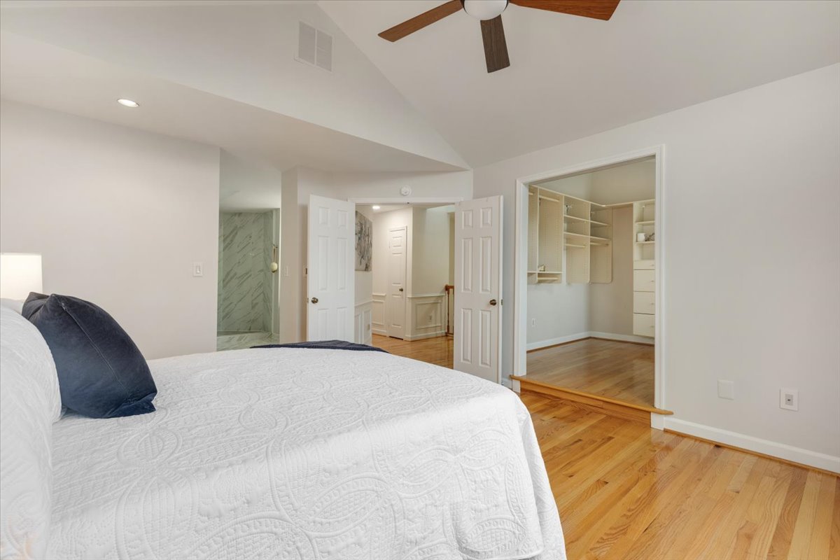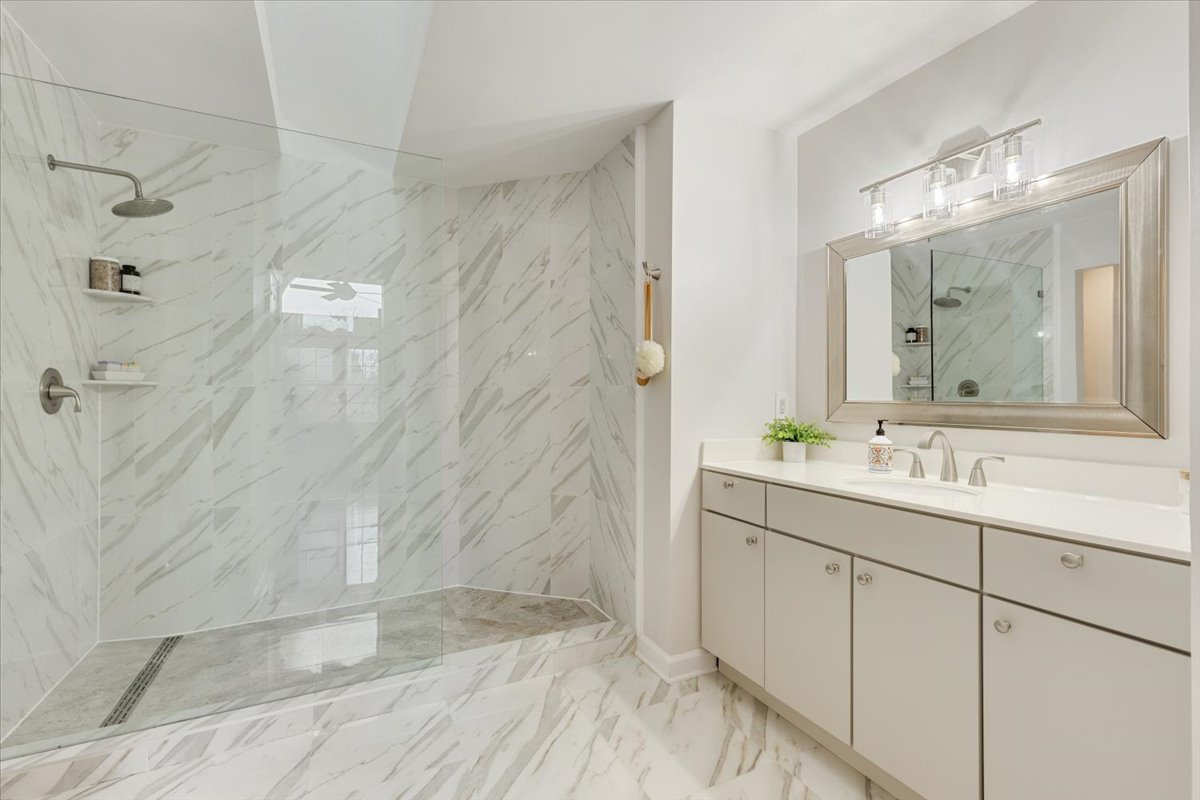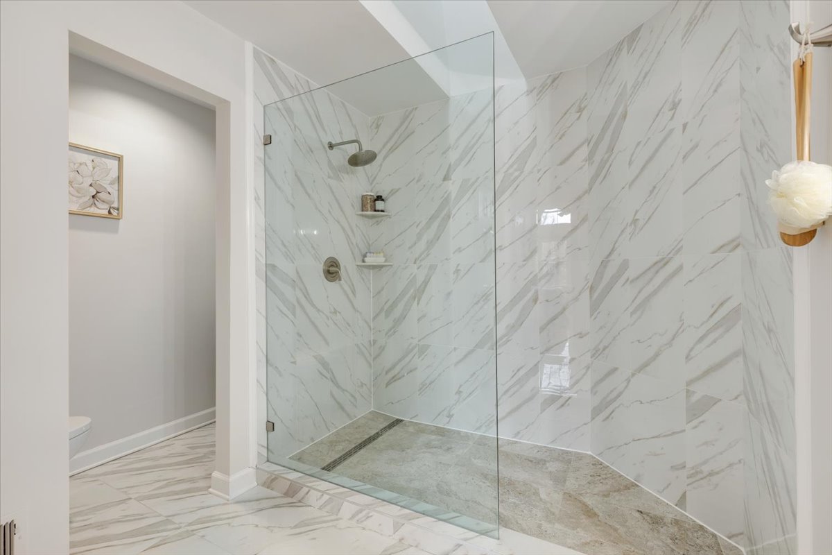 Upstairs, the light-filled primary suite offers a vaulted ceiling, ceiling fan with overhead lighting, & an expansive custom walk-in closet. The stunning ensuite bath features marble tile flooring, an oversized vanity, linen closet, additional walk-in closet, spa-like glass-enclosed marble shower with rain showerhead, linear drain, & skylight, and a private water closet with a washer/dryer combo. Two additional bedrooms with hardwood floors and generous closets (including one cedar-lined closet) share a full hallway bath with a vanity & white tub/shower.
