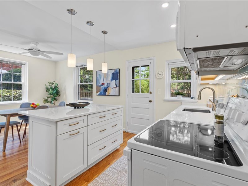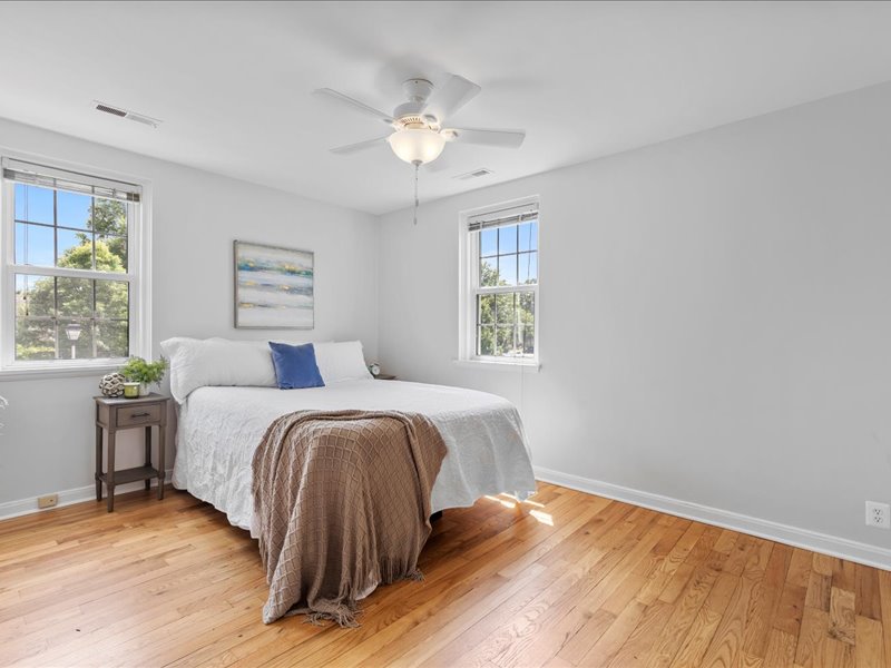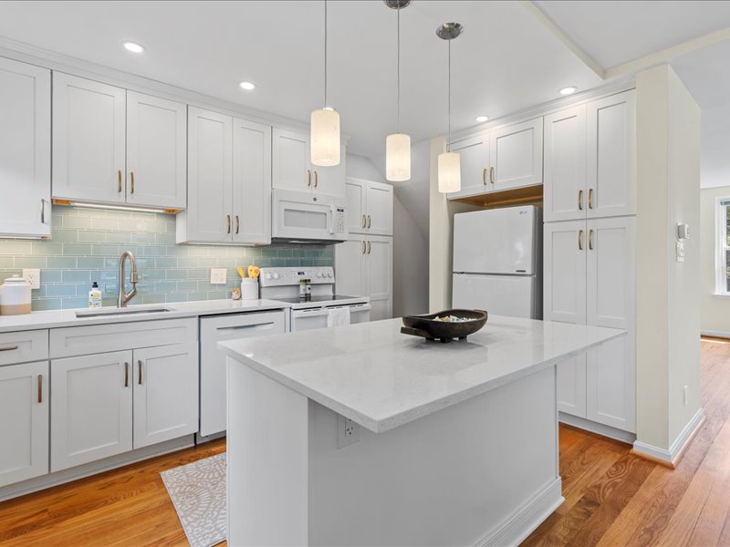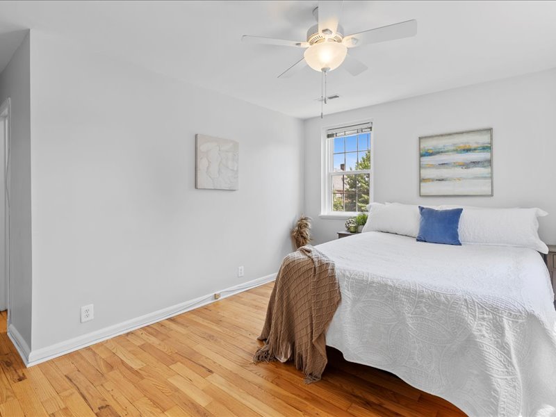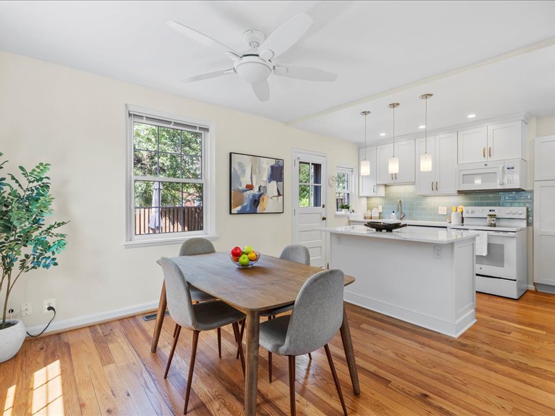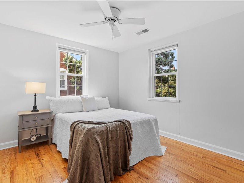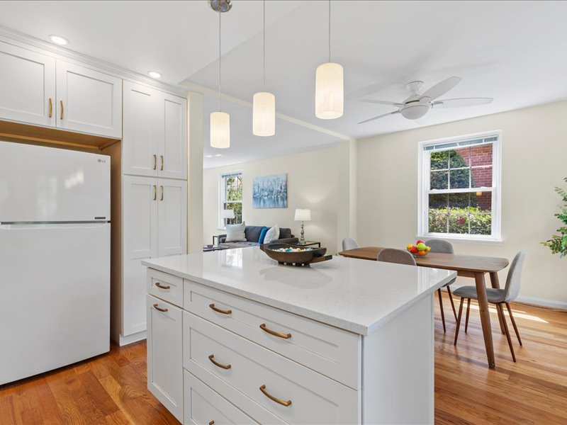 Beautiful 2-bedroom, 3-bathroom Dominion model townhome nestled in Fairlington Commons! This light-filled end unit offers three spacious levels of updated living, starting with hardwood floors, neutral paint, & a welcoming open layout on the main level. The dining area features a ceiling fan and flows seamlessly into the renovated open kitchen (2020), which boasts an island with pendant lighting & stool seating, soft-close white cabinetry, quartz countertops, a bold blue tile backsplash, & pantry cabinets with pull-out shelving. The back door leads to the private & serene, fully fenced paver patio, ideal for entertaining or unwinding with a cup of coffee. The upper level features a spacious primary suite with two closets, a dressing area, and a beautifully-updated en-suite bathroom (2023) with tile flooring, a stone-topped soft-close dual vanity, & glass-enclosed custom tiled shower with designer-inspired niche shelving. A second bedroom overlooking the patio with a ceiling fan and a generous closet, and a beautifully updated hall bathroom with wood-look tile flooring, an oversized quartz-topped vanity with soft-close cabinets, contemporary medicine cabinet for extra storage, & a custom-tiled shower with niche shelving completes this level.