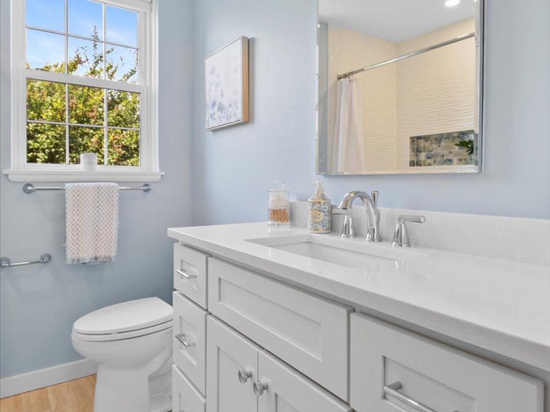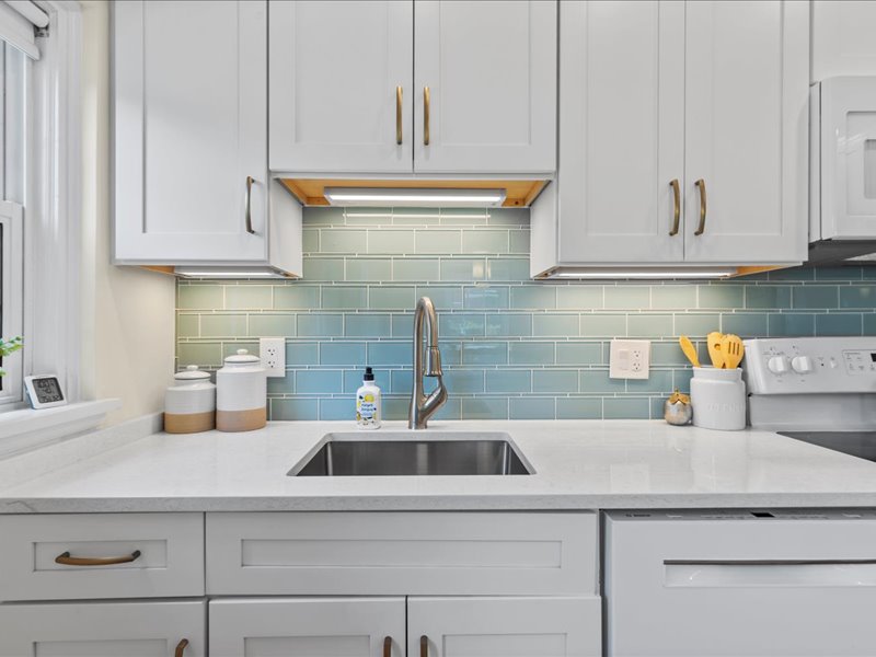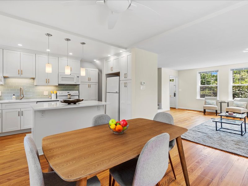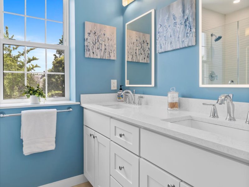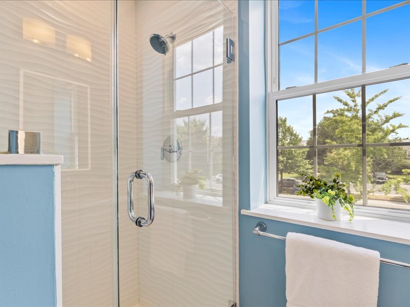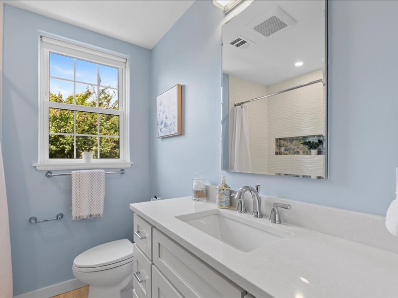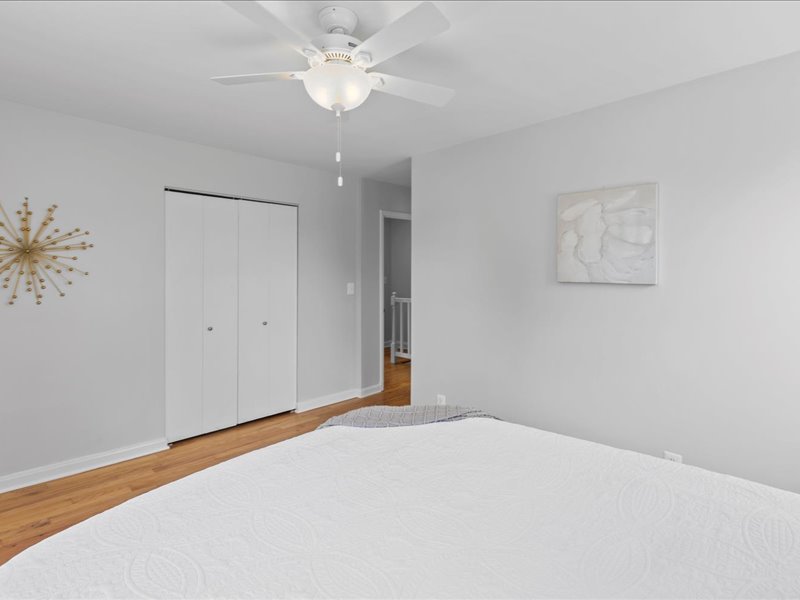 Beautiful 2-bedroom, 3-bathroom Dominion model townhome nestled in Fairlington Commons! This light-filled end unit offers three spacious levels of updated living, starting with hardwood floors, neutral paint, & a welcoming open layout on the main level. The dining area features a ceiling fan and flows seamlessly into the renovated open kitchen (2020), which boasts an island with pendant lighting & stool seating, soft-close white cabinetry, quartz countertops, a bold blue tile backsplash, & pantry cabinets with pull-out shelving. The back door leads to the private & serene, fully fenced paver patio, ideal for entertaining or unwinding with a cup of coffee. The upper level features a spacious primary suite with two closets, a dressing area, and a beautifully-updated en-suite bathroom (2023) with tile flooring, a stone-topped soft-close dual vanity, & glass-enclosed custom tiled shower with designer-inspired niche shelving. A second bedroom overlooking the patio with a ceiling fan and a generous closet, and a beautifully updated hall bathroom with wood-look tile flooring, an oversized quartz-topped vanity with soft-close cabinets, contemporary medicine cabinet for extra storage, & a custom-tiled shower with niche shelving completes this level.