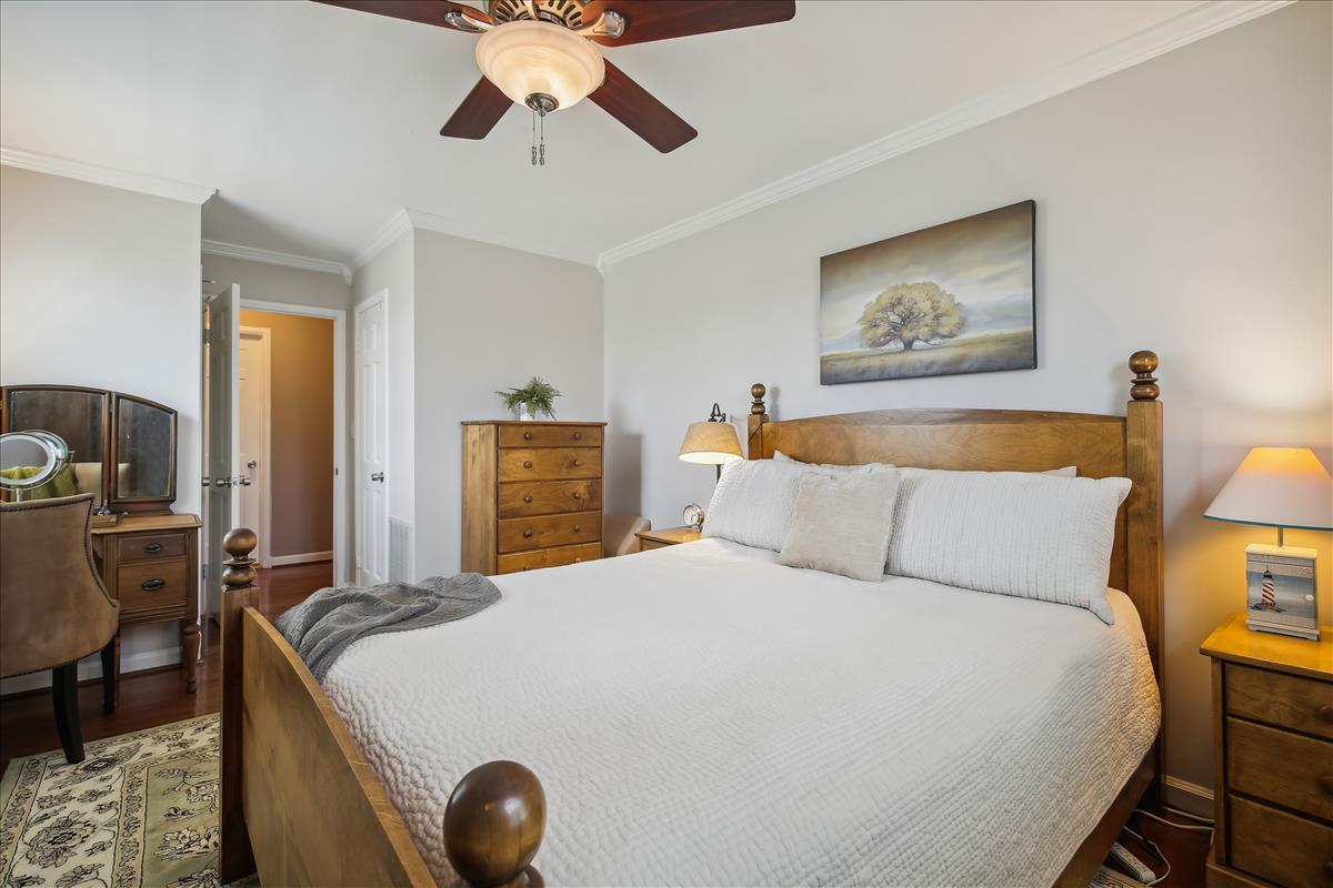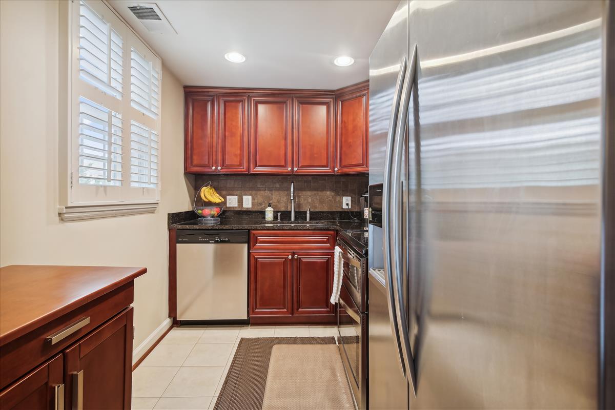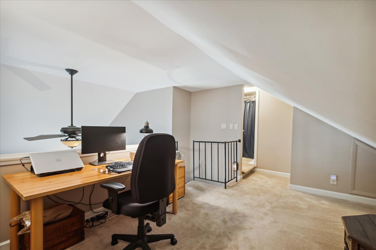 Beautiful 2 bedroom, 2 bathroom converted Bradford model home nestled in Fairlington Villages! This 2-level, light-filled home features vaulted ceilings, new hardwood flooring throughout the main level, double-paned windows that open in for easy cleaning with custom-made wood plantation shutters, smooth ceilings, & fresh paint throughout. The kitchen is accented with tile flooring, recessed lighting, granite countertops, updated cabinets, stainless steel appliances, & a kitchen cart for extra storage and counter space! The spacious separate dining area provides access to the serene outdoor balcony with views of the community green space. The laundry closet in the back hallway has a stackable washer & dryer and ample shelving for extra storage. The primary bedroom features a new ceiling fan & two closets with overhead lighting + a very private view with no neighbors on either side. The bathroom is accented with a vanity, medicine cabinet, storage cabinet, & a sparkling white-tiled shower. Back in the living room, a spiral staircase leads up to the newly carpeted loft with added privacy wall & storage alcove. This level also features the second bedroom & a full bathroom – very RARE for this model home! The bedroom is accented with a ceiling fan, large window, built-in corner shelving, & attic access. The bathroom, featuring a vanity & sparkling tiled shower, completes this home. Fairlington Villages amenities include six pools, lighted tennis courts, tot lots, walking trails, & MORE! Great location near I-395 and easy access to public transportation with a bus stop across the street (7A, 22A/C) and a 5-minute ride to the Pentagon Metro. Close to the shops & restaurants at Shirlington Village, West Alex, Baileys Crossroads, Del Ray, & Old Town Alexandria.