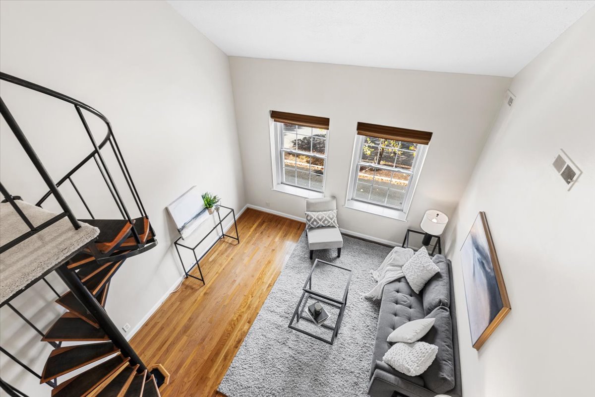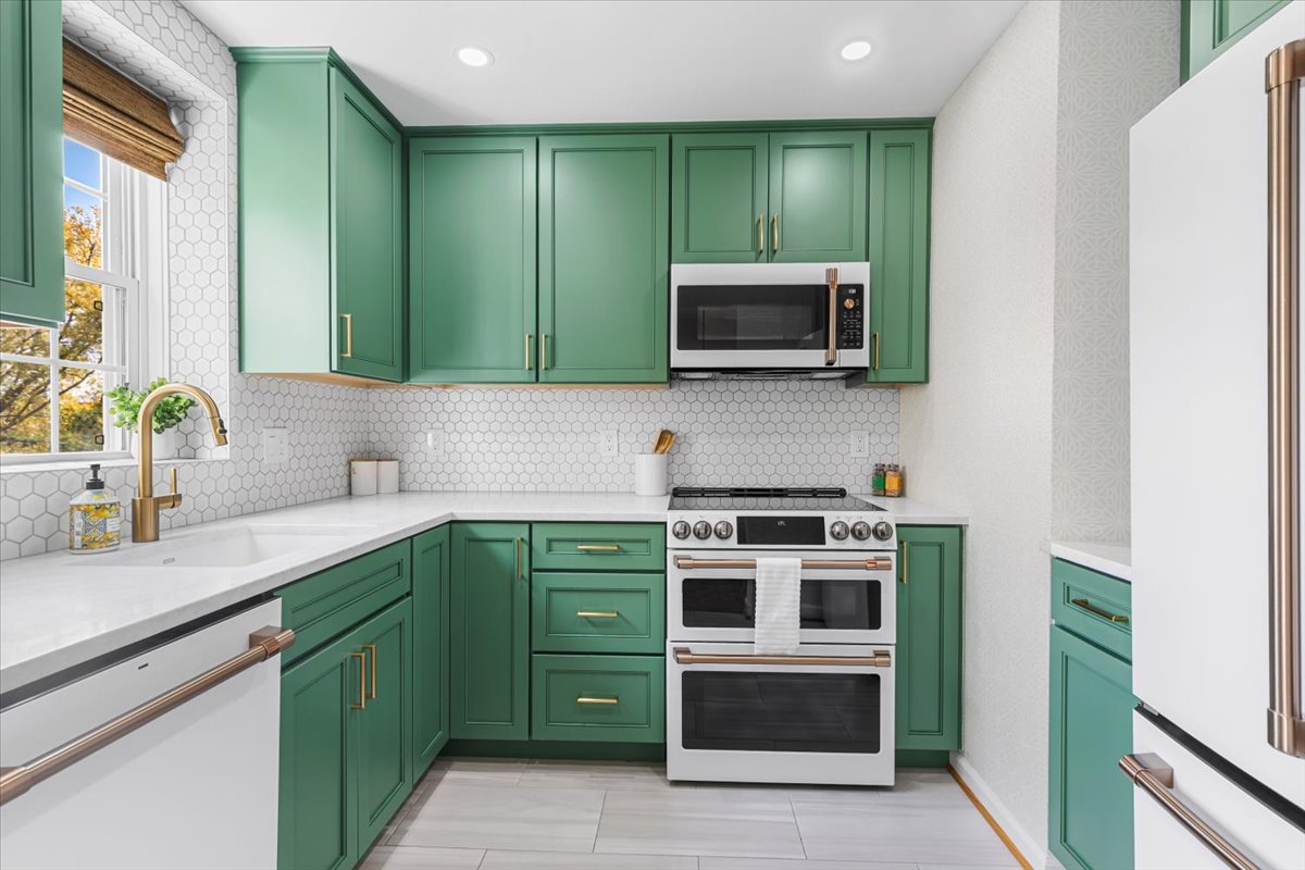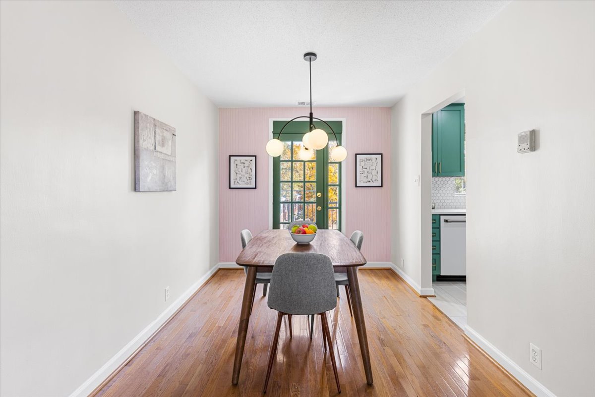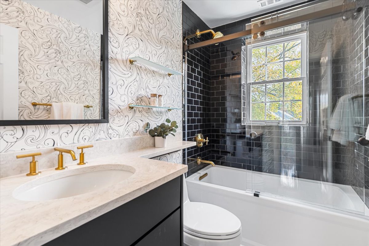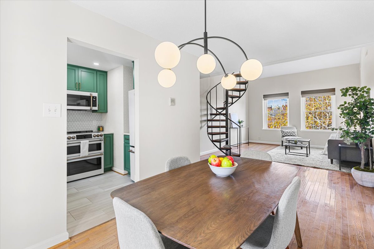 Beautiful 2-bedroom, 1-bathroom Sherwood model home nestled in Fairlington Villages! The light-filled living room features vaulted ceilings, gleaming hardwood floors, & updated vinyl windows. The renovated kitchen impresses with upgraded green cabinetry, quartz countertops, a stylish hexagon tile backsplash, newer GE Café appliances (2023), tile flooring, & fun accent wallpaper. A spacious separate dining area with a modern chandelier opens to a private balcony – perfect for enjoying morning coffee or unwinding after a long day. The spacious primary bedroom offers plush carpeting and a large closet with 2 doors & in-closet lighting, while the 2nd bedroom has been freshly painted. The beautifully renovated bathroom features a sleek quartz-topped black vanity, a modern mirror & light fixture, upgraded flooring, and a stunning black subway tile shower with niche shelving & a deep soaking tub. The shower is accented with the Kohler Purist shower system. Back in the living room, a spiral staircase leads up to the carpeted loft with a huge floored walk-in attic providing tons of storage space. Additional features include a convenient laundry closet with a Miele washer and dryer & two reserved/unassigned parking spaces. Fairlington Villages amenities include six pools, lighted tennis courts, tot lots/playgrounds, walking paths, and more! Conveniently located near I-395 and the shops and restaurants at The Village at Shirlington, West Alex, Baileys Crossroads, Del Ray, & Old Town Alexandria!