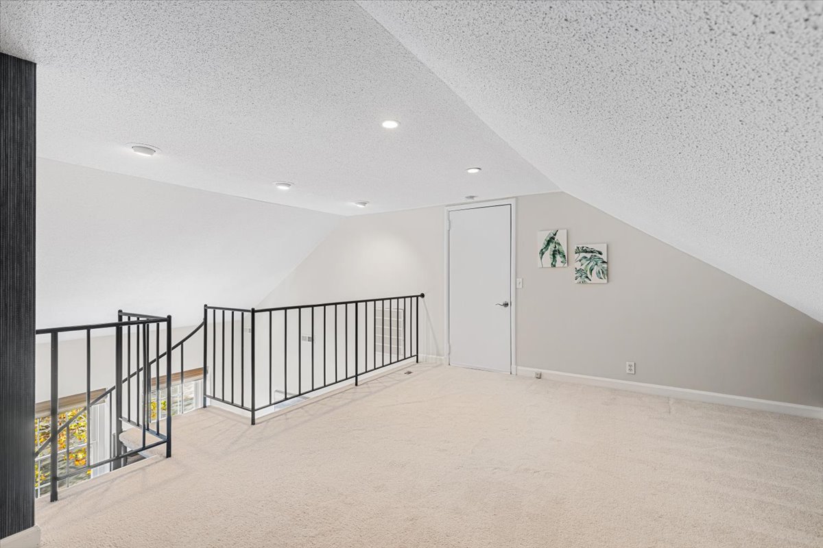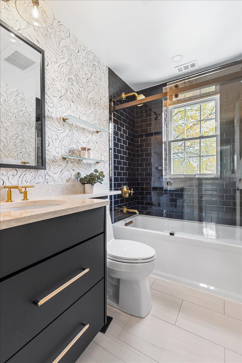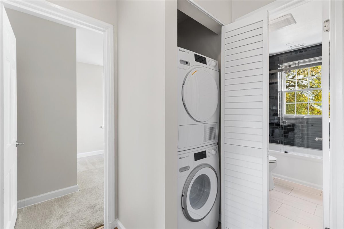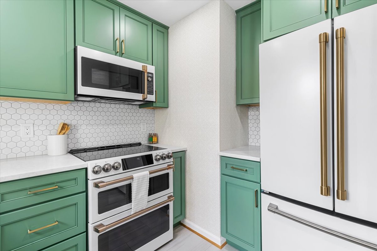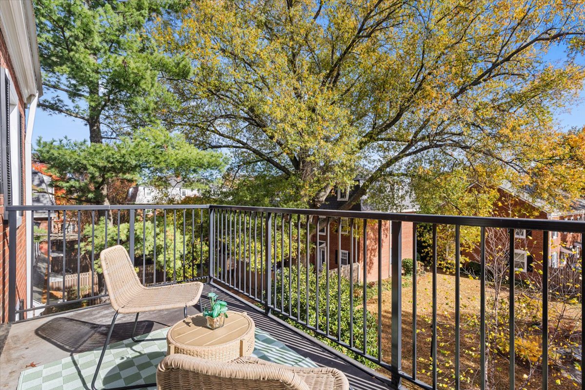 Beautiful 2-bedroom, 1-bathroom Sherwood model home nestled in Fairlington Villages! The light-filled living room features vaulted ceilings, gleaming hardwood floors, & updated vinyl windows. The renovated kitchen impresses with upgraded green cabinetry, quartz countertops, a stylish hexagon tile backsplash, newer GE Café appliances (2023), tile flooring, & fun accent wallpaper. A spacious separate dining area with a modern chandelier opens to a private balcony – perfect for enjoying morning coffee or unwinding after a long day. The spacious primary bedroom offers plush carpeting and a large closet with 2 doors & in-closet lighting, while the 2nd bedroom has been freshly painted. The beautifully renovated bathroom features a sleek quartz-topped black vanity, a modern mirror & light fixture, upgraded flooring, and a stunning black subway tile shower with niche shelving & a deep soaking tub. The shower is accented with the Kohler Purist shower system. Back in the living room, a spiral staircase leads up to the carpeted loft with a huge floored walk-in attic providing tons of storage space. Additional features include a convenient laundry closet with a Miele washer and dryer & two reserved/unassigned parking spaces. Fairlington Villages amenities include six pools, lighted tennis courts, tot lots/playgrounds, walking paths, and more! Conveniently located near I-395 and the shops and restaurants at The Village at Shirlington, West Alex, Baileys Crossroads, Del Ray, & Old Town Alexandria!