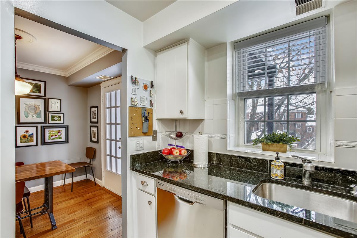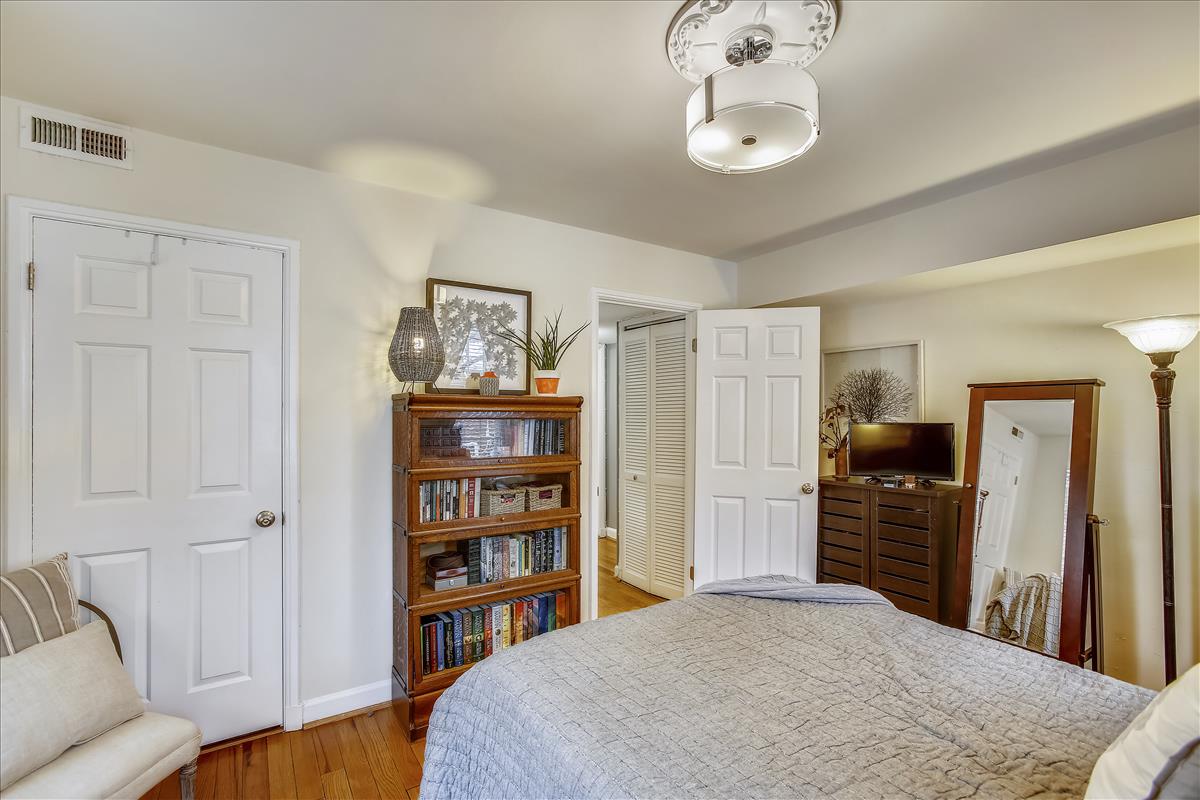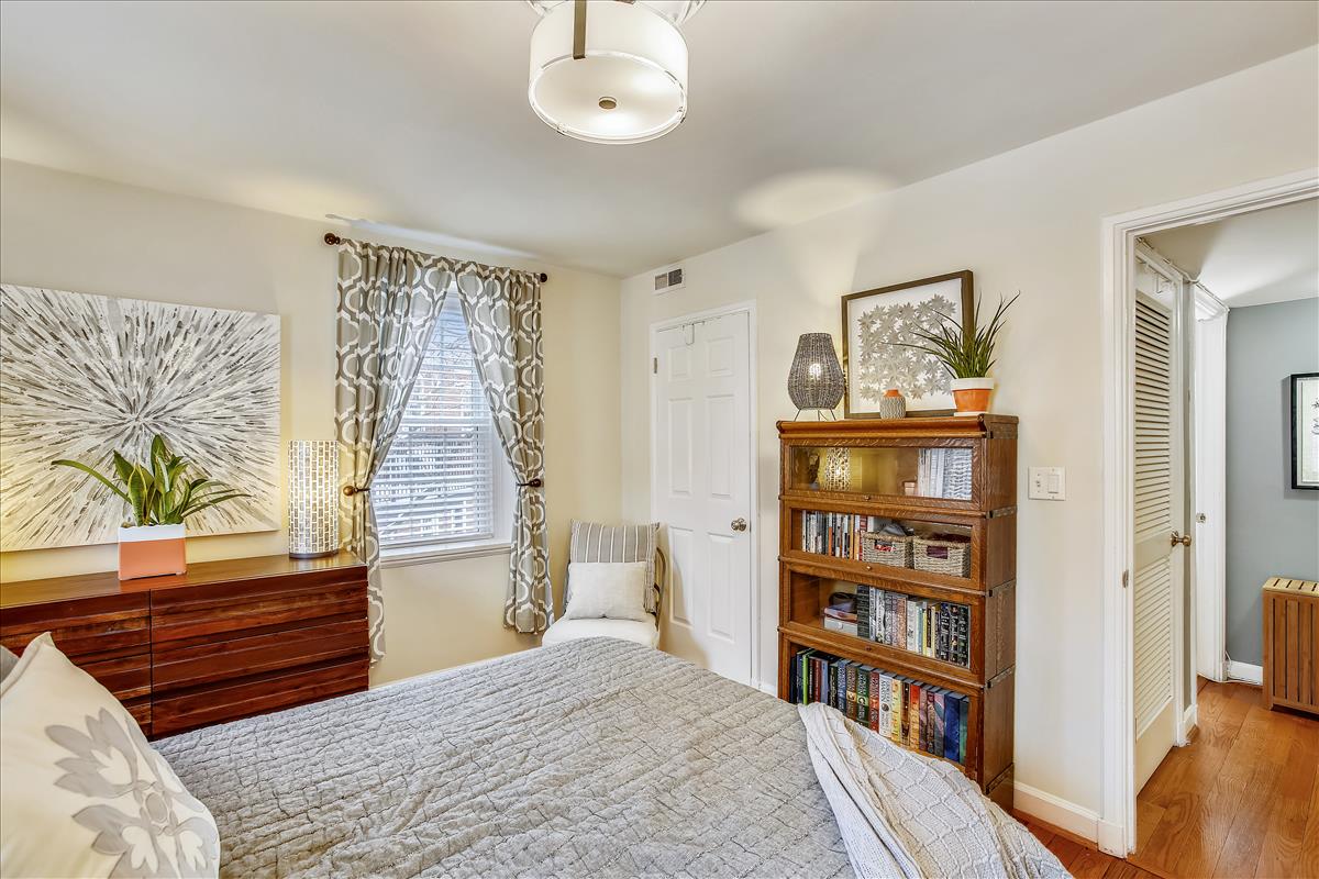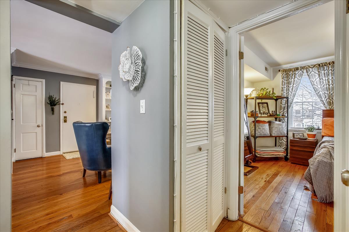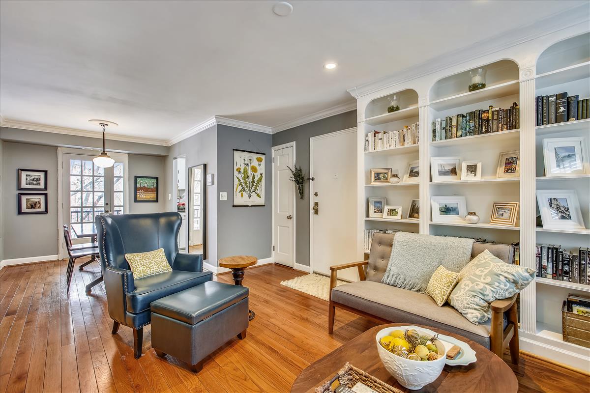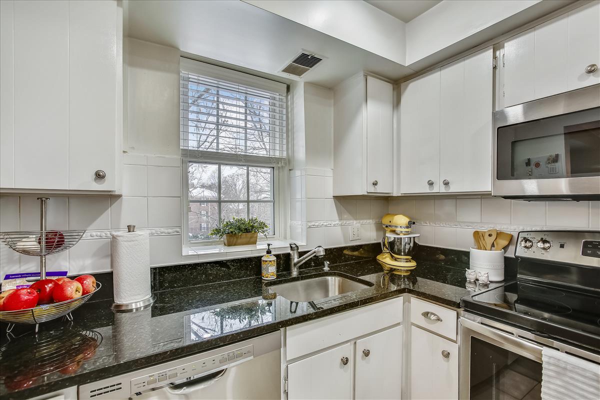 Beautiful 2 bedroom, 1 bathroom Richmond model home in Fairlington Villages! The light-filled living room features gleaming hardwood floors, crown molding, recessed lighting, & a gorgeous wall of built-in, arched bookcases. The kitchen is accented with white cabinetry, granite countertops, white backsplash, & stainless steel appliances. The separate dining area is spacious enough to fit a full-size dining table and provides access to the private, covered rear balcony, and completes the main living area. The back hallway features a laundry closet with brand NEW washer & dryer (2022). The spacious primary bedroom is large enough to fit a king bedroom set & includes windows on two walls + a large closet. The renovated spa-like bathroom is accented with a white subway tiled shower with niche shelving, overhead lighting, an extra-deep soaking tub, new vanity, hexagon floor tiling, & a large storage cabinet. A second bedroom with a nice-sized closet completes this lovely home. Other home features include a new water heater (2021), newer windows (2015), and a RARE separate storage unit/bonus room in the basement which provides an EXTRA ~155 sq ft of space! This home is steps from one of six community pools. Other community amenities include lighted tennis courts, tot lots/playgrounds, walking paths, & more! Great location near I-395 & the shops and restaurants of Shirlington Village.