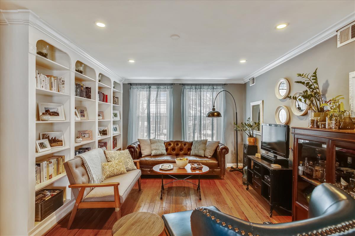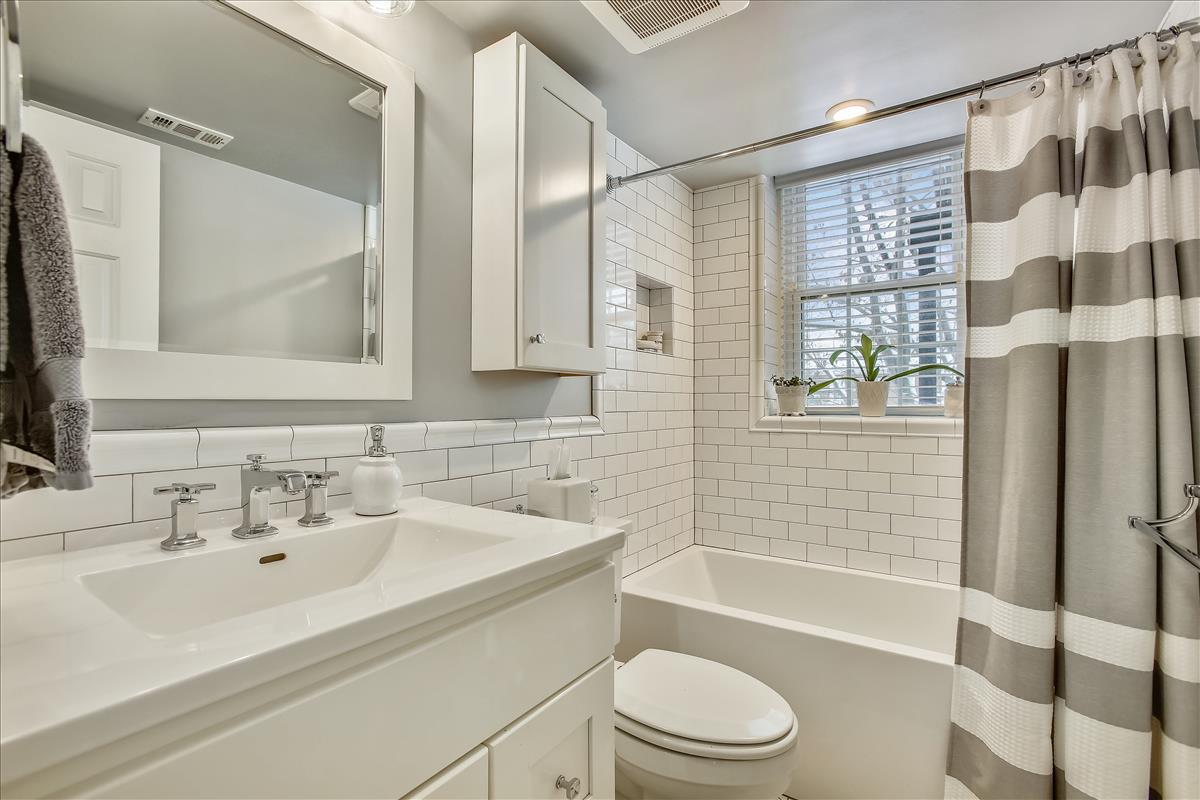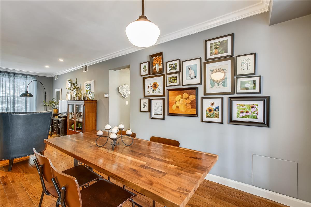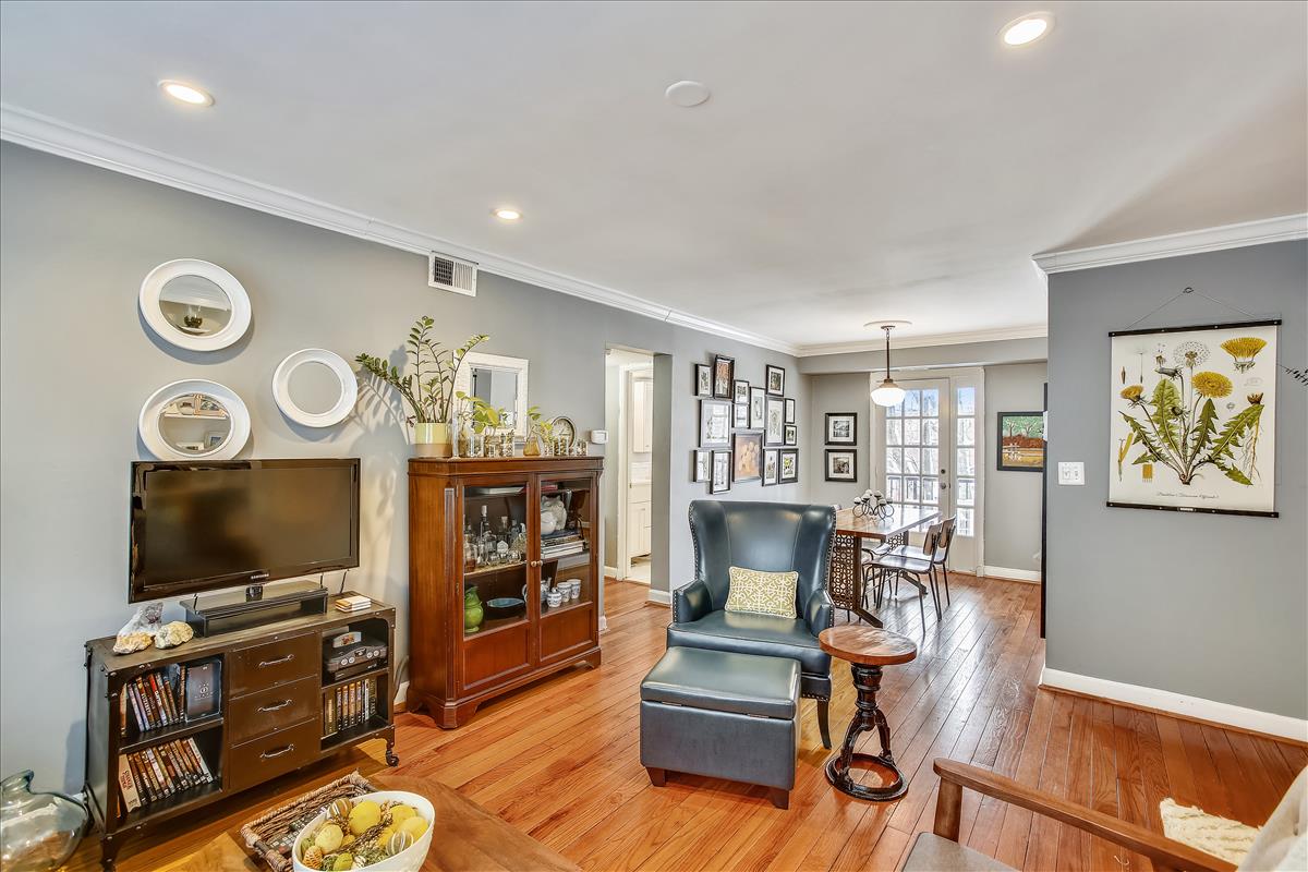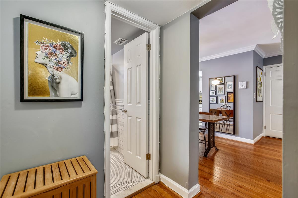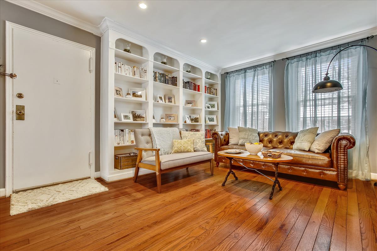 Beautiful 2 bedroom, 1 bathroom Richmond model home in Fairlington Villages! The light-filled living room features gleaming hardwood floors, crown molding, recessed lighting, & a gorgeous wall of built-in, arched bookcases. The kitchen is accented with white cabinetry, granite countertops, white backsplash, & stainless steel appliances. The separate dining area is spacious enough to fit a full-size dining table and provides access to the private, covered rear balcony, and completes the main living area. The back hallway features a laundry closet with brand NEW washer & dryer (2022). The spacious primary bedroom is large enough to fit a king bedroom set & includes windows on two walls + a large closet. The renovated spa-like bathroom is accented with a white subway tiled shower with niche shelving, overhead lighting, an extra-deep soaking tub, new vanity, hexagon floor tiling, & a large storage cabinet. A second bedroom with a nice-sized closet completes this lovely home. Other home features include a new water heater (2021), newer windows (2015), and a RARE separate storage unit/bonus room in the basement which provides an EXTRA ~155 sq ft of space! This home is steps from one of six community pools. Other community amenities include lighted tennis courts, tot lots/playgrounds, walking paths, & more! Great location near I-395 & the shops and restaurants of Shirlington Village.