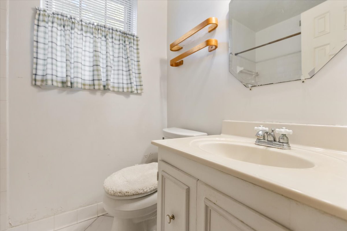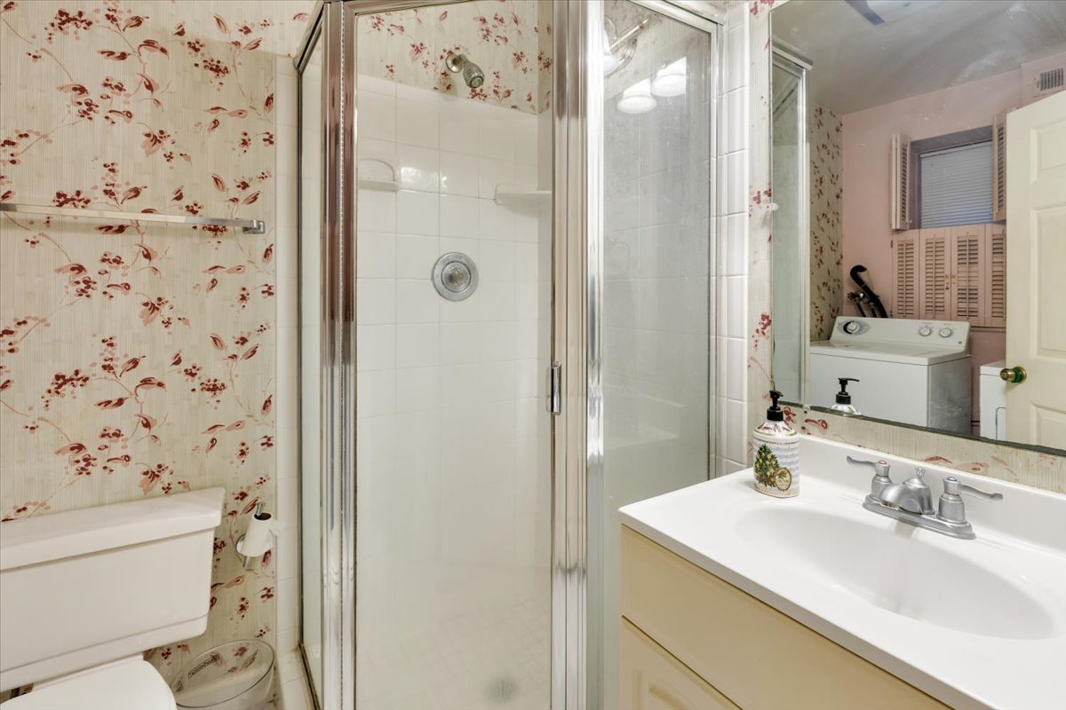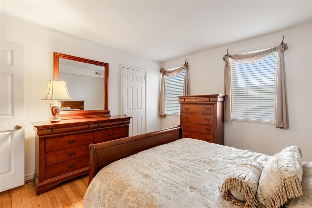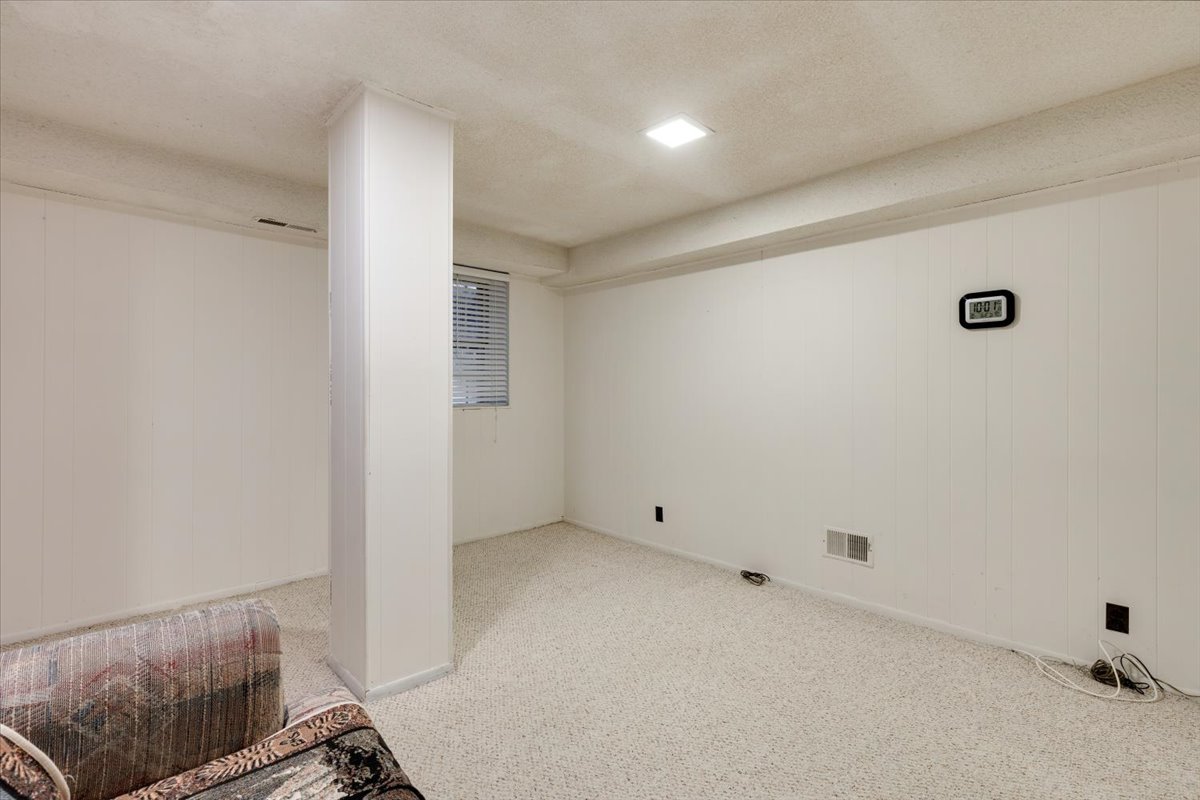 Upstairs, you’ll be greeted by well-maintained hardwood floors, a hallway ceiling fan with overhead light, and two bedrooms! The spacious primary bedroom features a walk-in closet with built-ins and the 2nd bedroom includes two windows and a good-sized closet. A full bathroom with tile flooring, vanity, & tiled shower complete this level. The lower level includes a generously sized recreation room with plush carpeting and a large window, a bonus room that works well as a guest space or home office, and a full bathroom with corner shower, vanity, & laundry nook with a full-sized washer & dryer + large window.