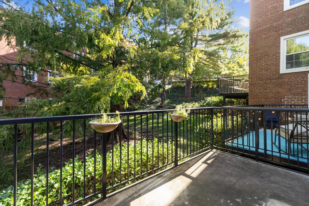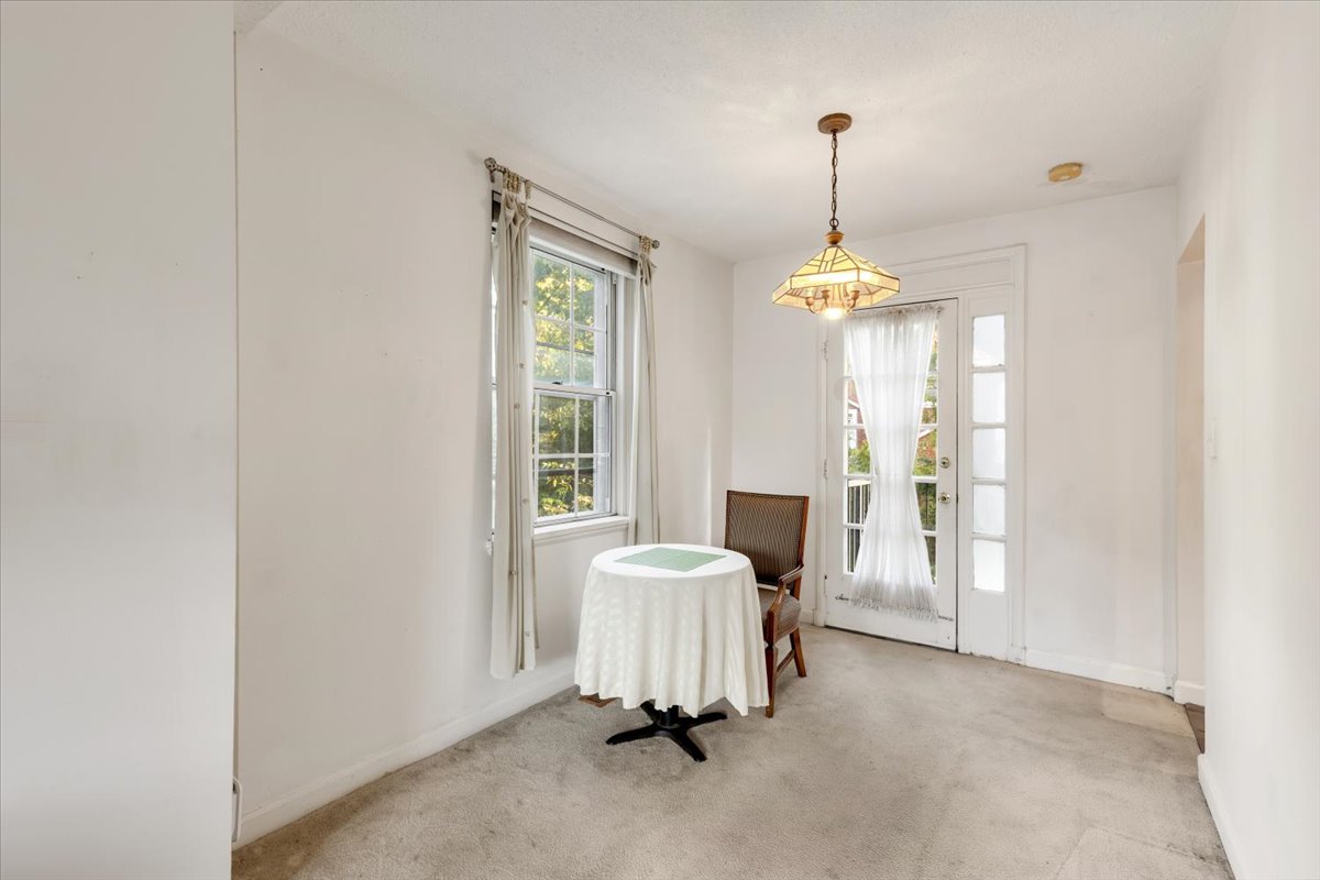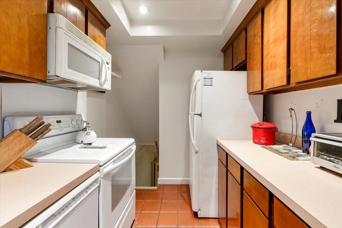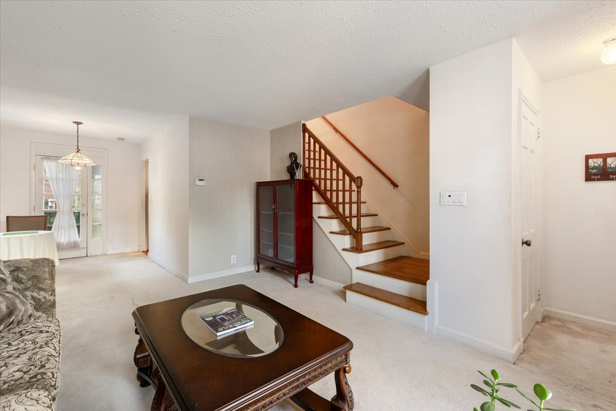 RARE opportunity to create your dream home in Fairlington with this 2-bedroom, 2-bathroom Clarendon II model townhome! Bring your vision & creativity to this spacious home nestled on a picturesque Fairlington courtyard. This as-is property is full of possibility! The main level features a welcoming entry with a coat closet, a bright living room, & a dining area with chandelier. There are hardwood floors hiding under the current carpet on this level, just waiting to be uncovered and enjoyed! The kitchen offers hardwood cabinets, recessed lighting, terra-cotta inspired tile flooring, & a removed drop ceiling – an excellent foundation for a modern upgrade. A French door opens to a HUGE private balcony overlooking lush community greenspace, offering a peaceful outdoor retreat.