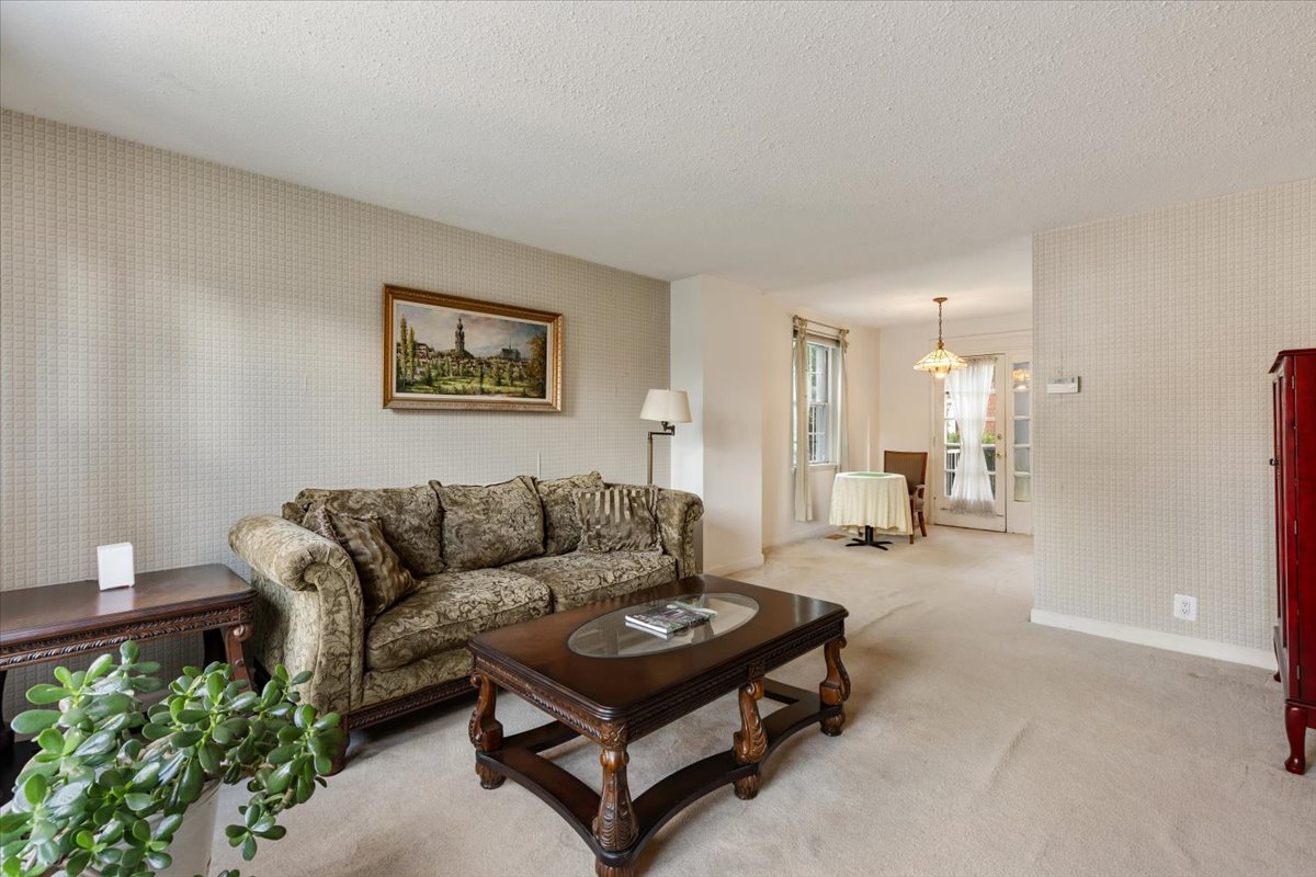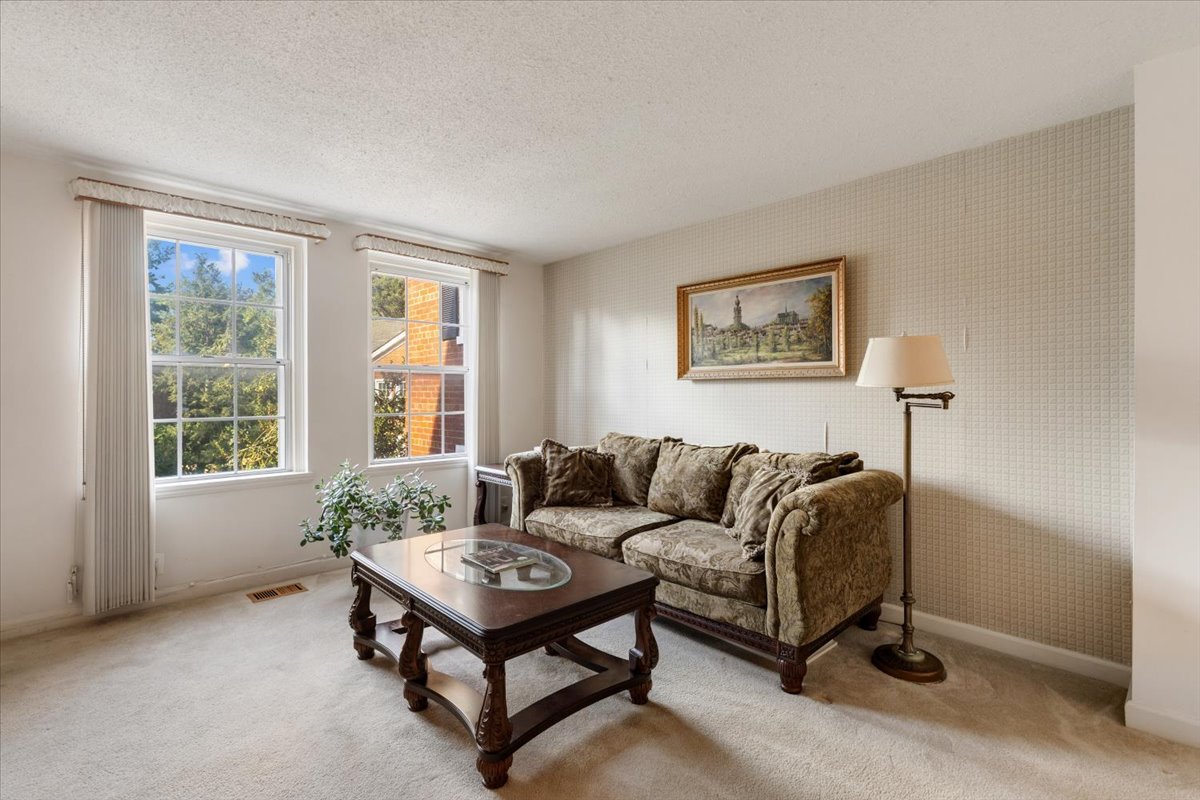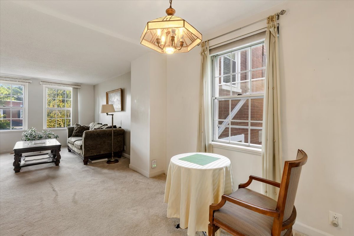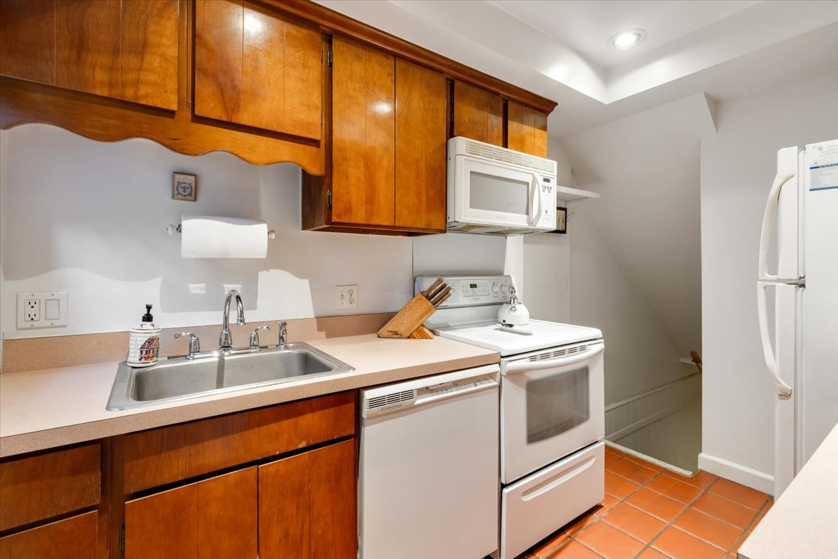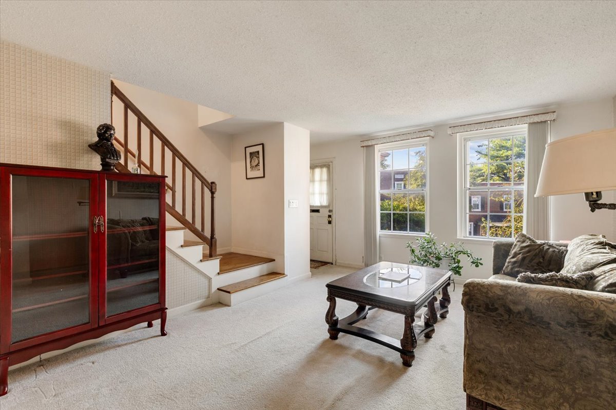 RARE opportunity to create your dream home in Fairlington with this 2-bedroom, 2-bathroom Clarendon II model townhome! Bring your vision & creativity to this spacious home nestled on a picturesque Fairlington courtyard. This as-is property is full of possibility! The main level features a welcoming entry with a coat closet, a bright living room, & a dining area with chandelier. There are hardwood floors hiding under the current carpet on this level, just waiting to be uncovered and enjoyed! The kitchen offers hardwood cabinets, recessed lighting, terra-cotta inspired tile flooring, & a removed drop ceiling – an excellent foundation for a modern upgrade. A French door opens to a HUGE private balcony overlooking lush community greenspace, offering a peaceful outdoor retreat.