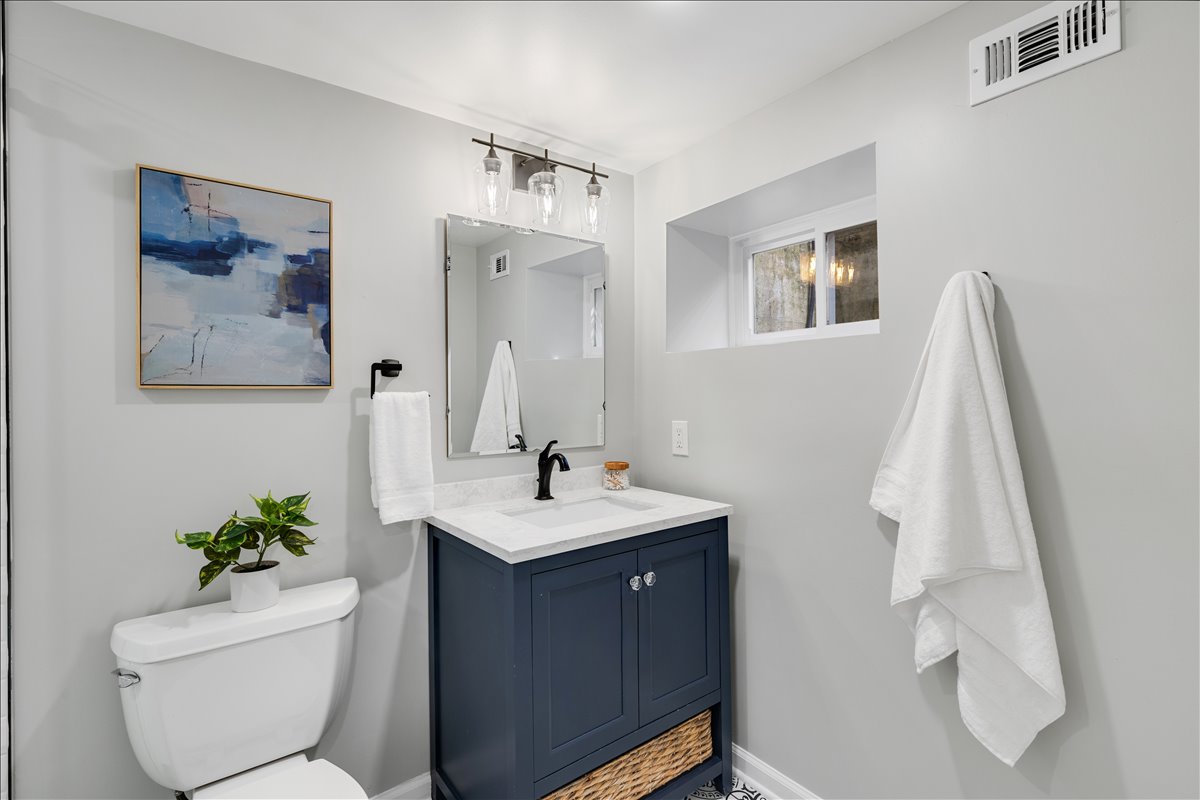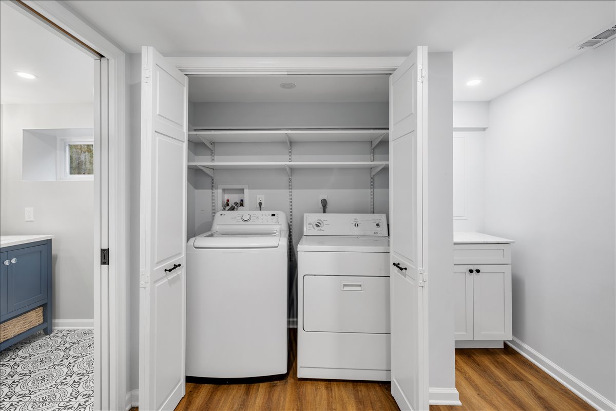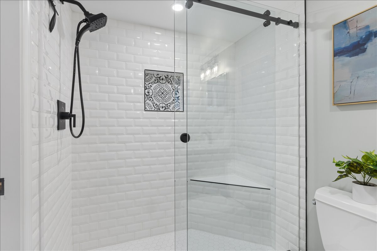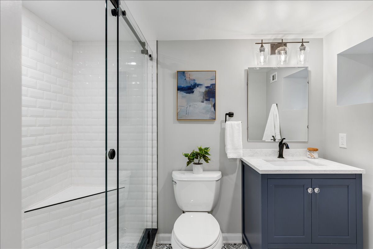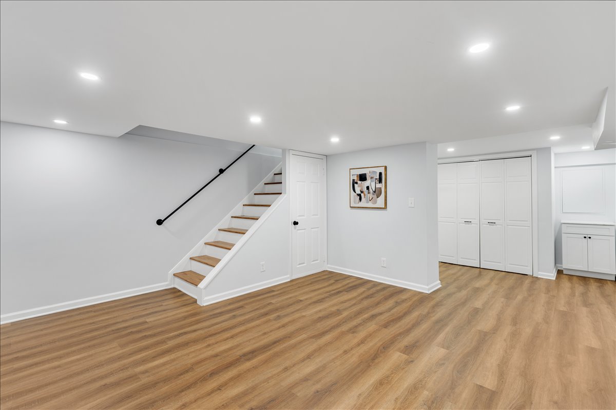 Upstairs, the hallway includes a linen closet for added storage. The updated bathroom features a stone-topped vanity, medicine cabinet mirror, over-toilet storage, & an updated tiled shower with niche shelving. The spacious primary bedroom offers a ceiling fan with overhead lighting & a walk-in closet, while the 2nd bedroom includes a generously sized closet with shelving. The lower level expands your living options with updated LVP flooring & recessed lighting throughout the oversized recreation room. You’ll also find an under-stair storage/utility closet, an additional nook with a storage cabinet, & a convenient laundry closet with a newer full-sized washer and dryer (2024) + overhead shelving. The fully renovated lower-level bathroom is beautifully finished with patterned tile flooring, a stone-topped vanity, & a large white tiled shower with sliding glass doors, a corner bench, & niche shelving.